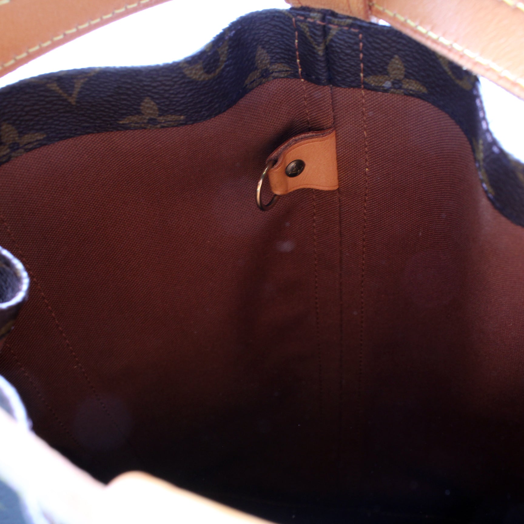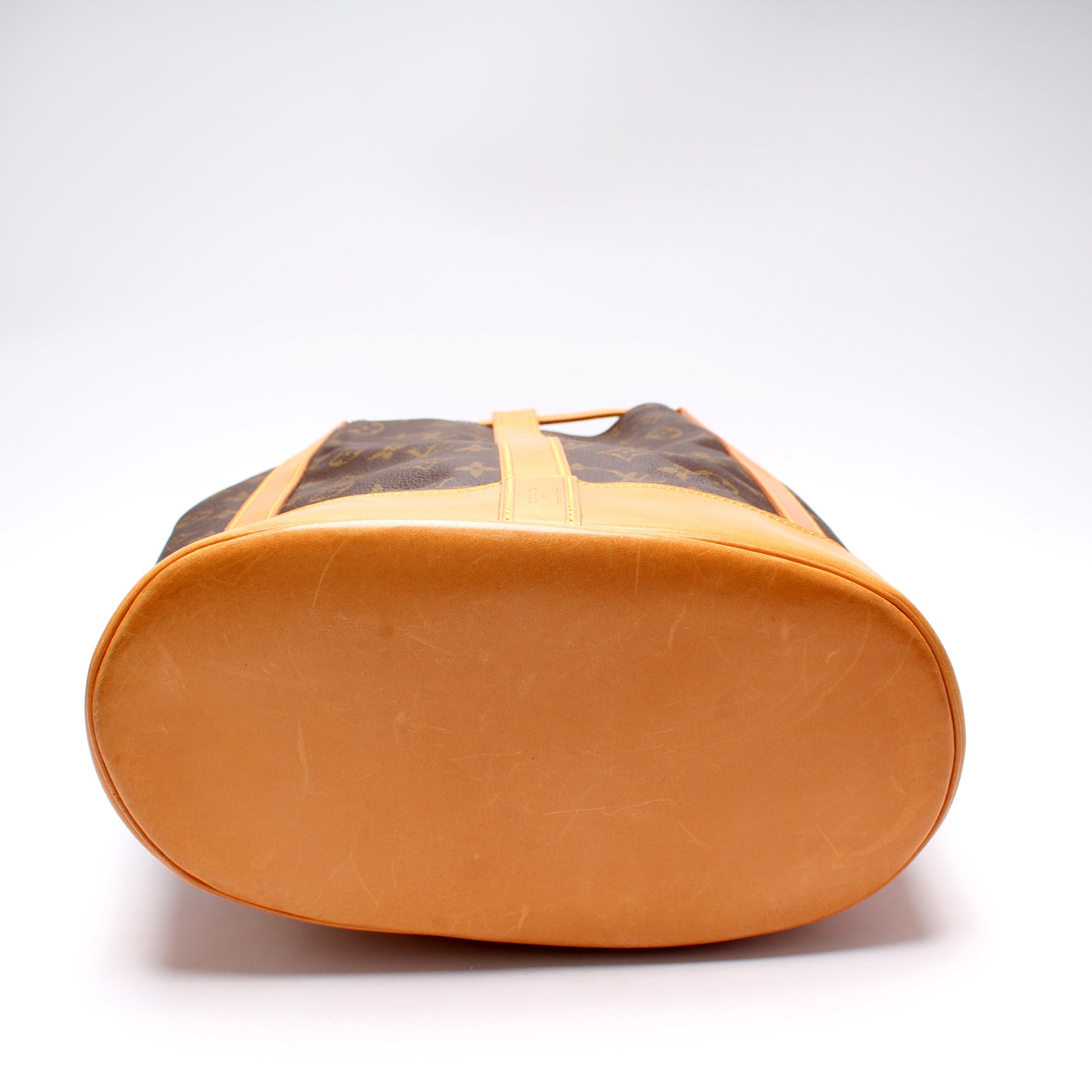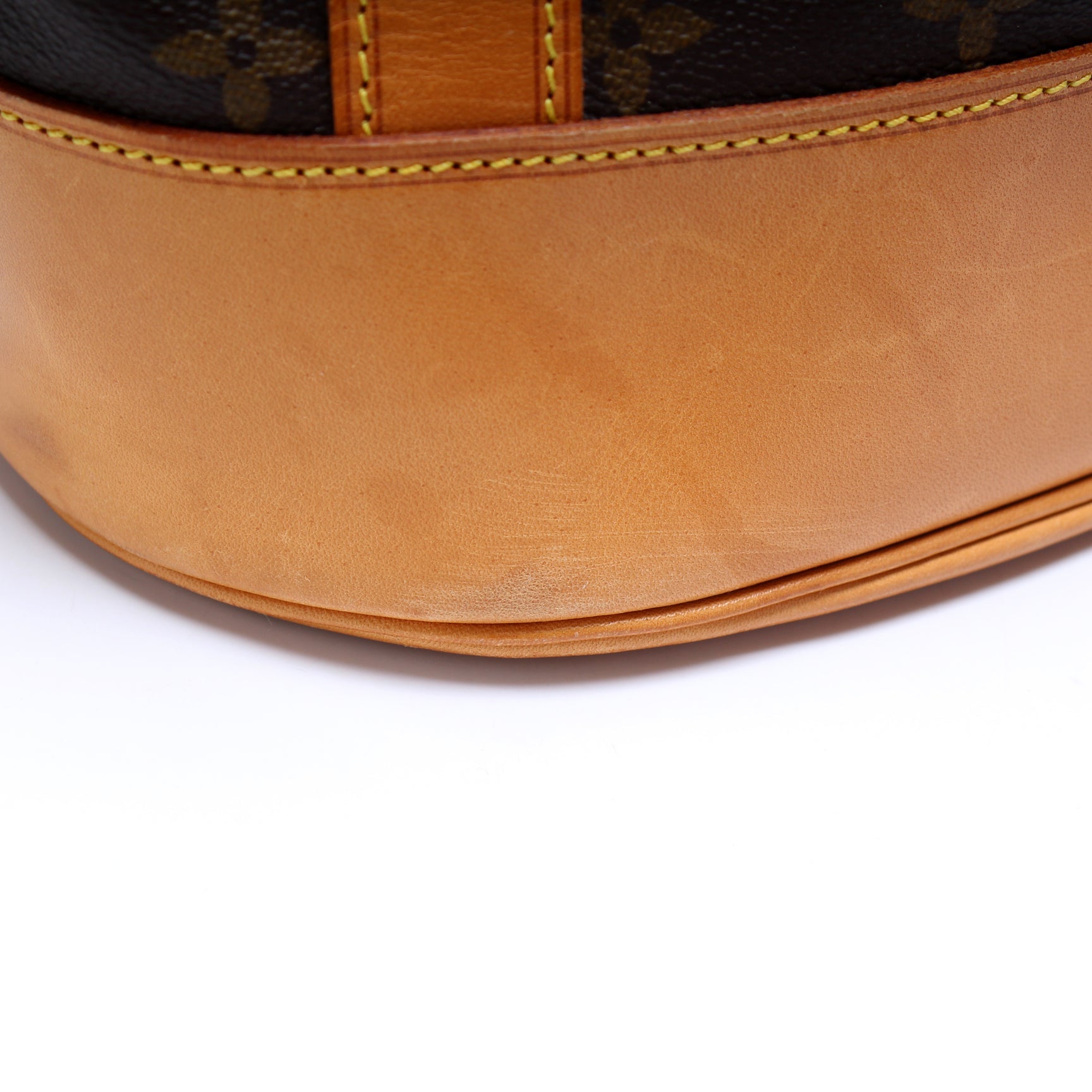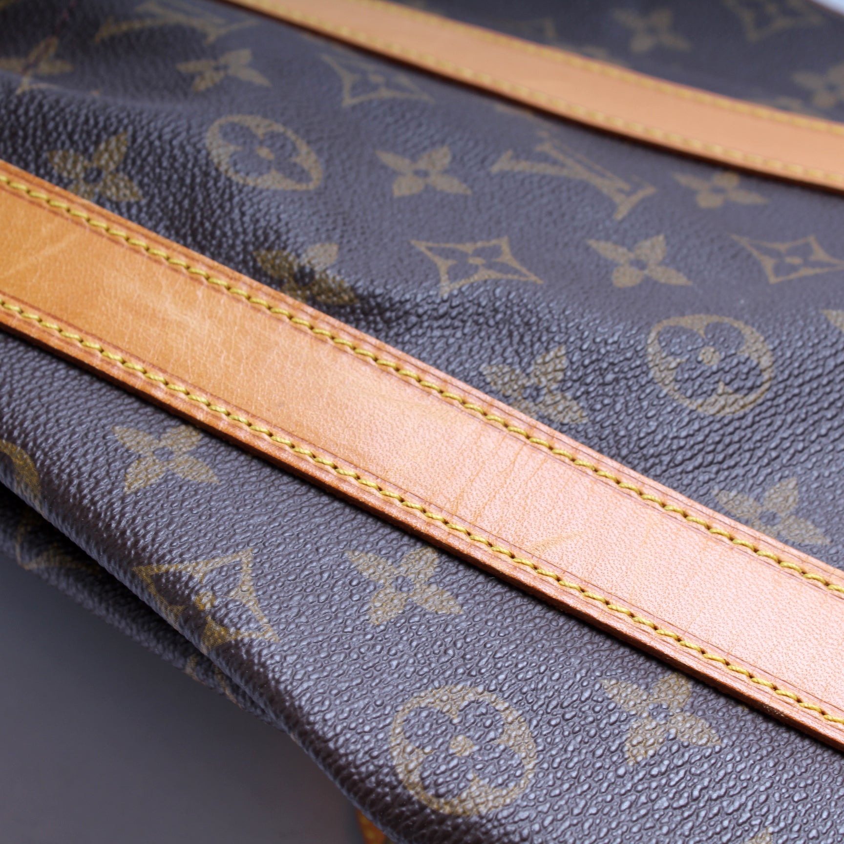 Exterior: The exterior coated canvas is free of any rips or cracks. The leather details and base show minor scuffs and discoloration.