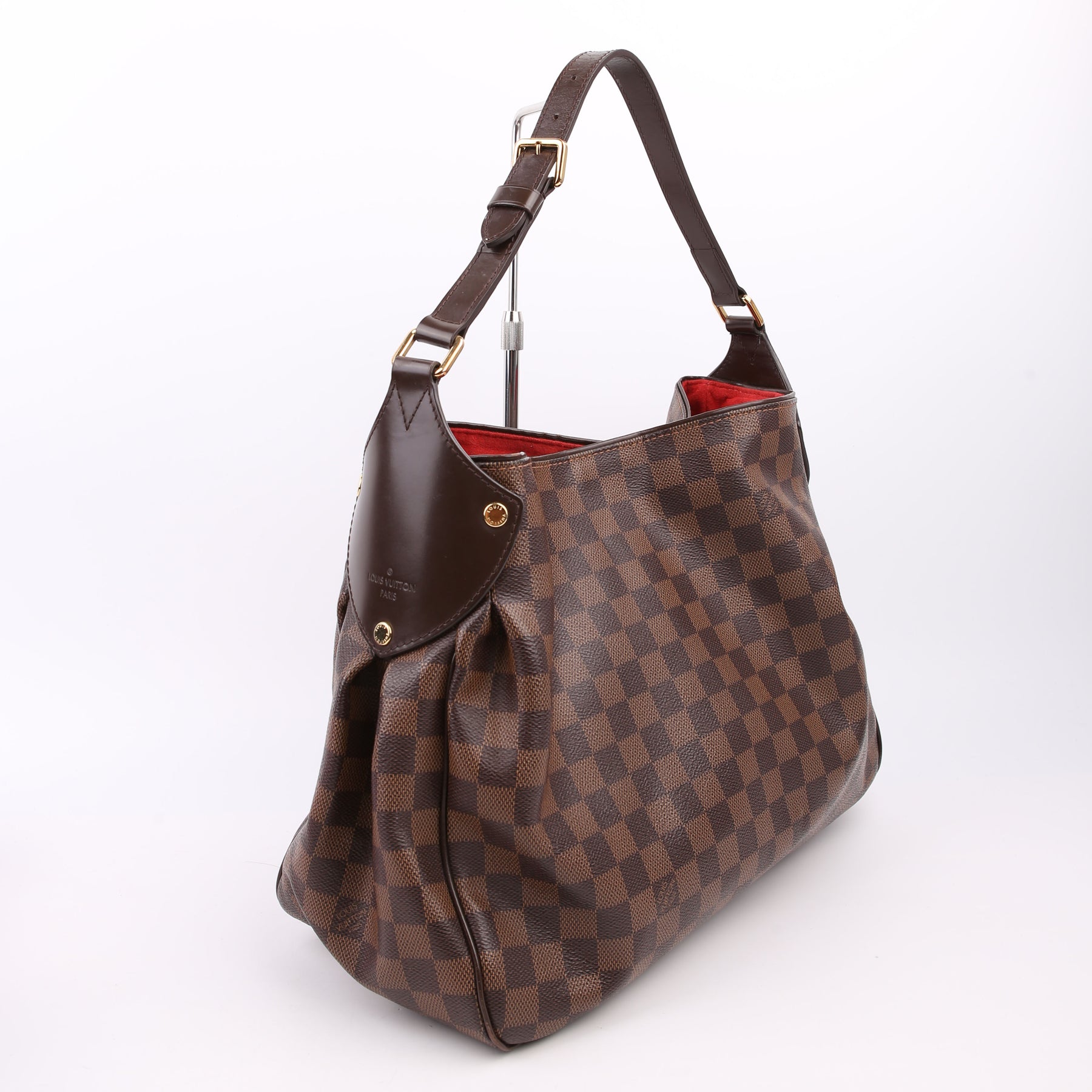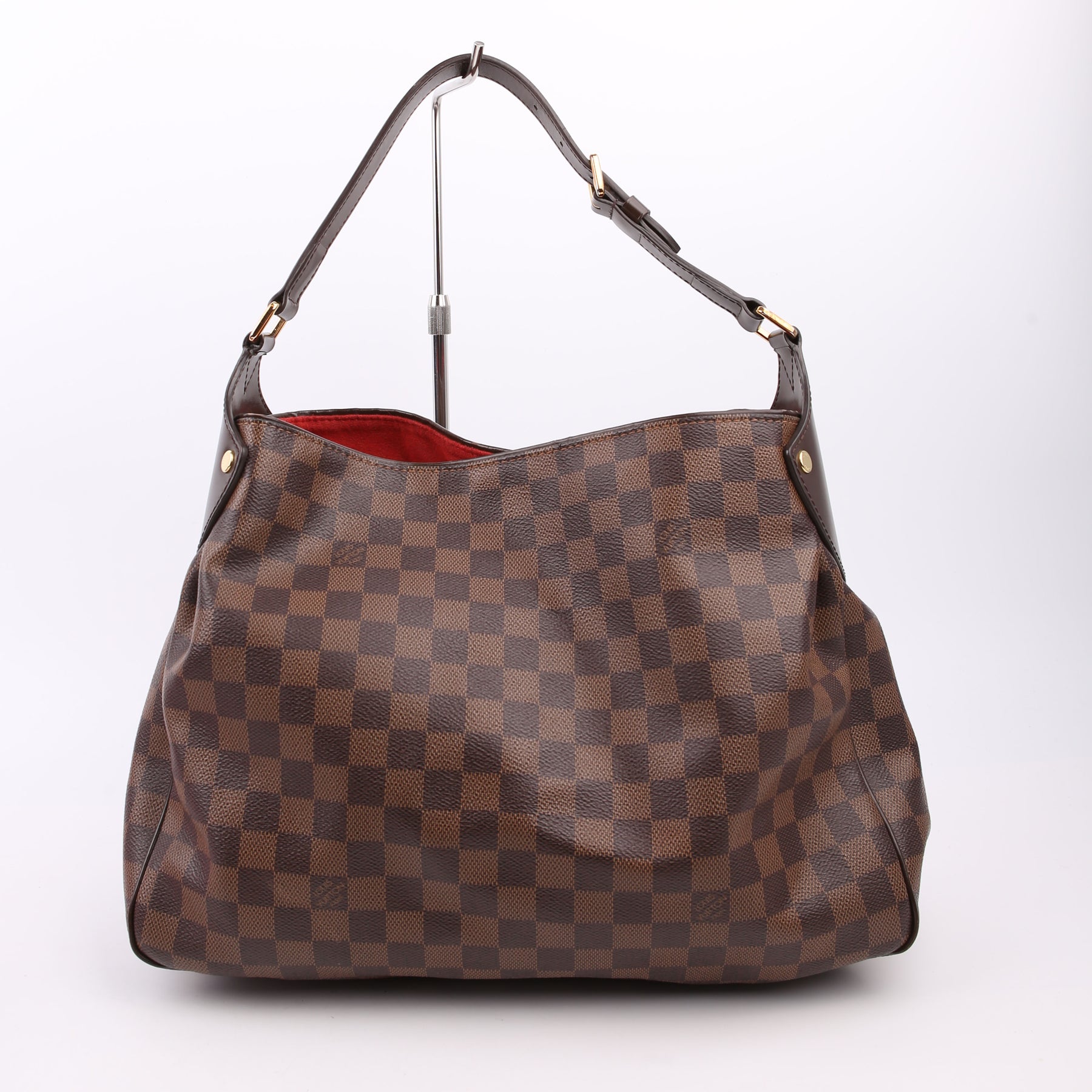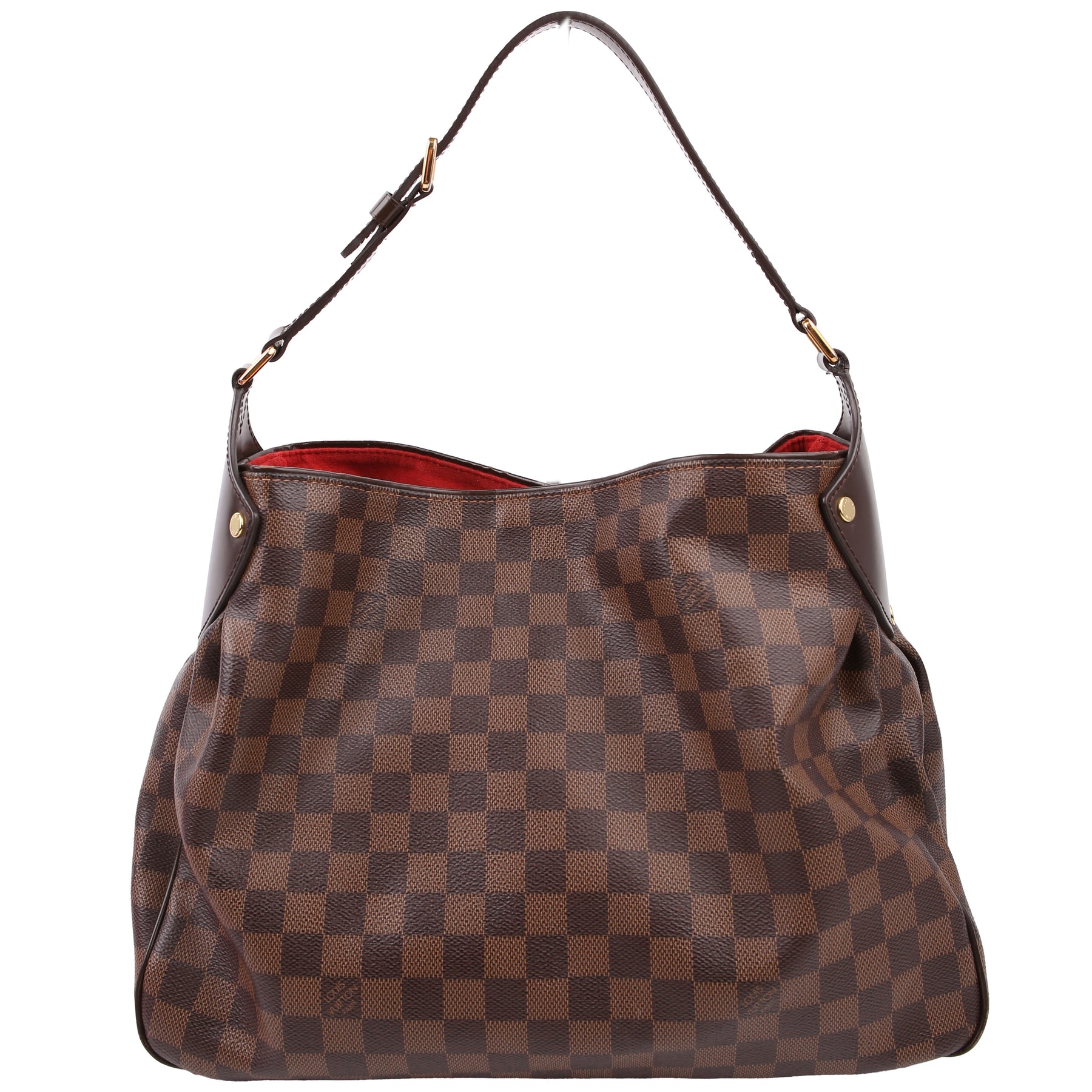 This pre-owned Louis Vuitton Reggia Hobo is guaranteed 100% authentic. The exterior is in the classic Louis Vuitton Damier Ebene coated canvas.