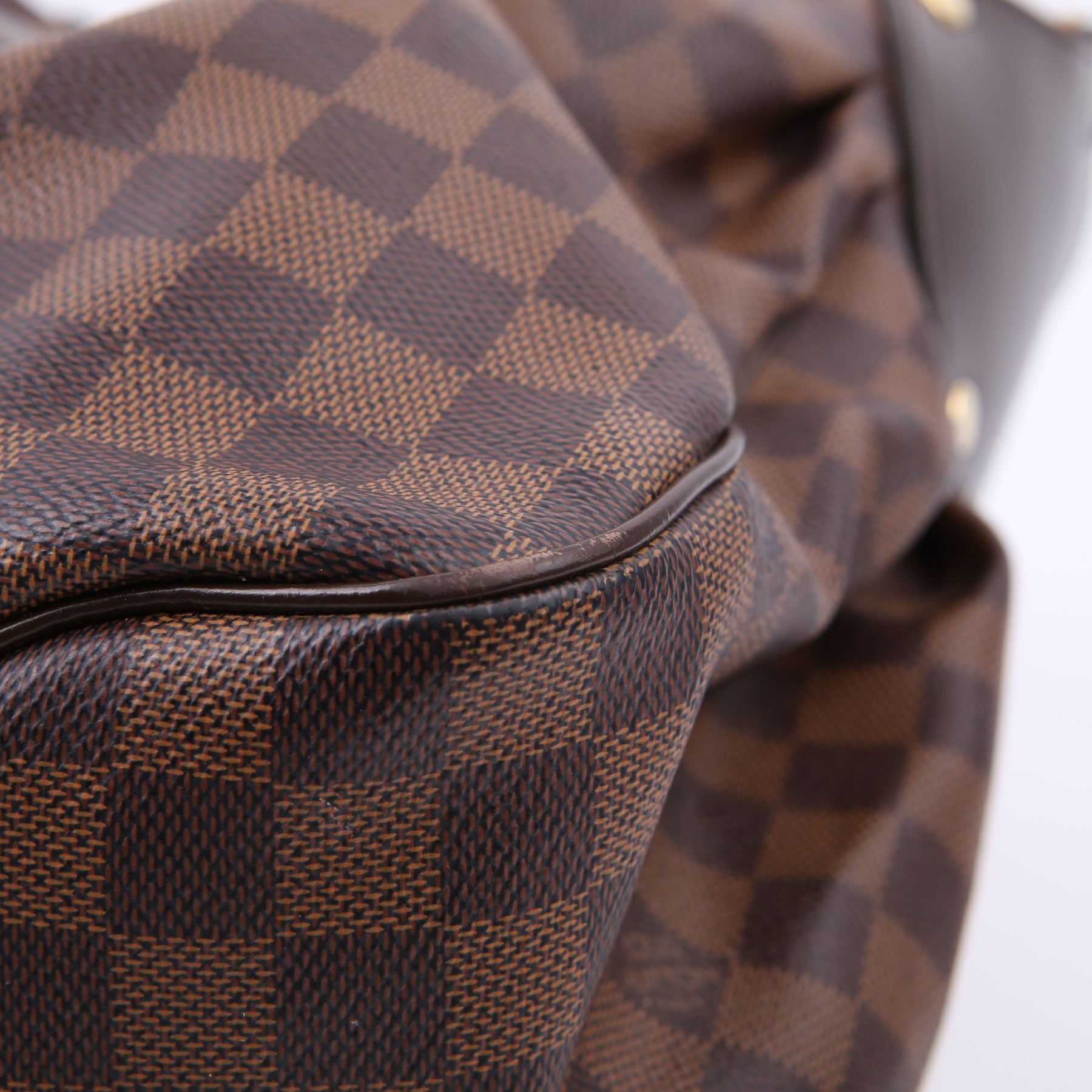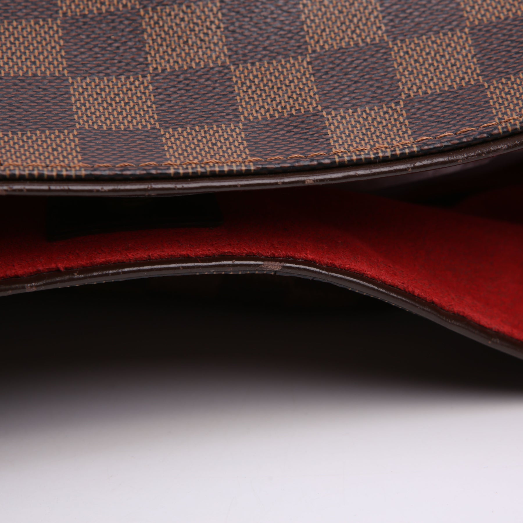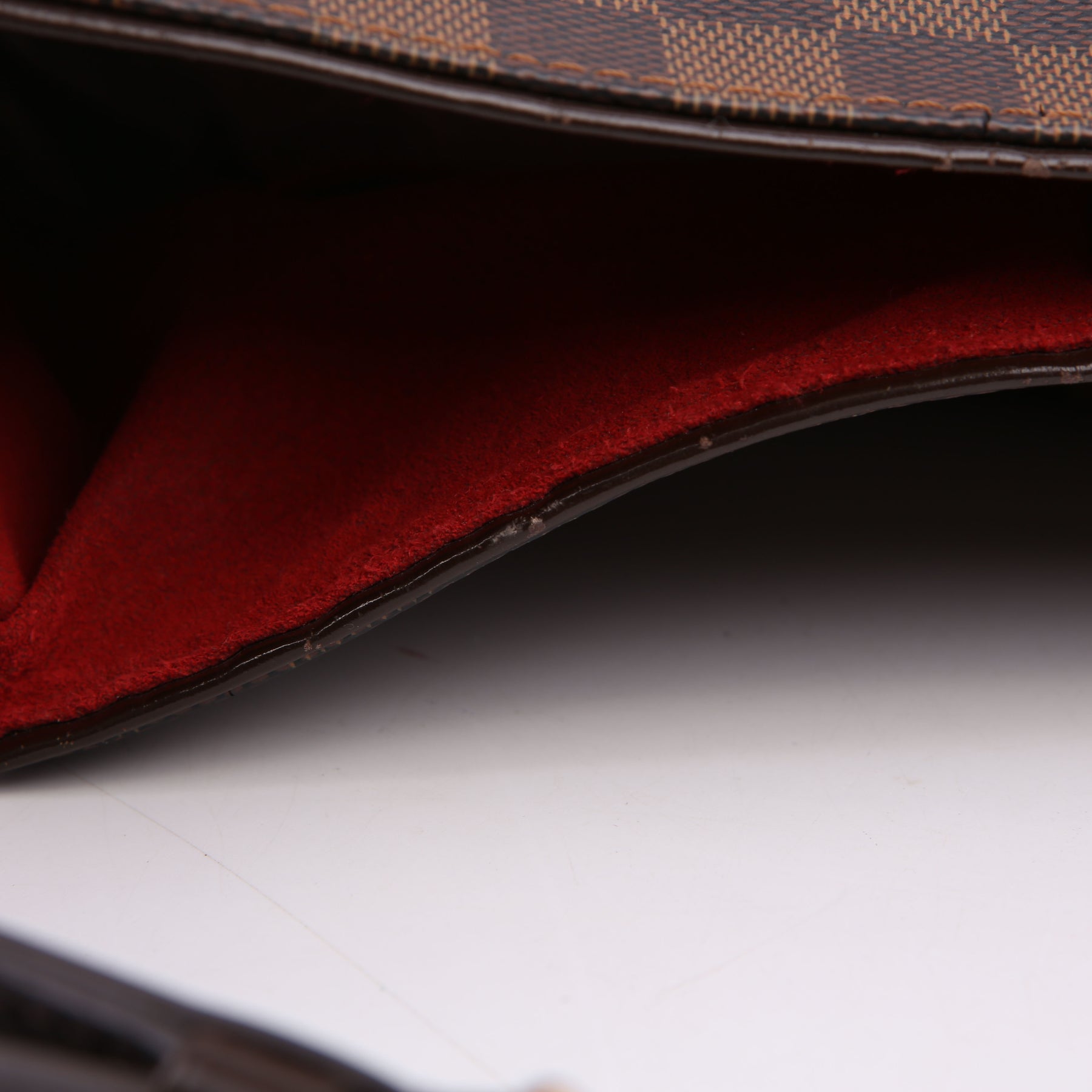 Exterior: The exterior Damier Ebene coated canvas has minor wear to the corners. The leather trim has heavy wear.