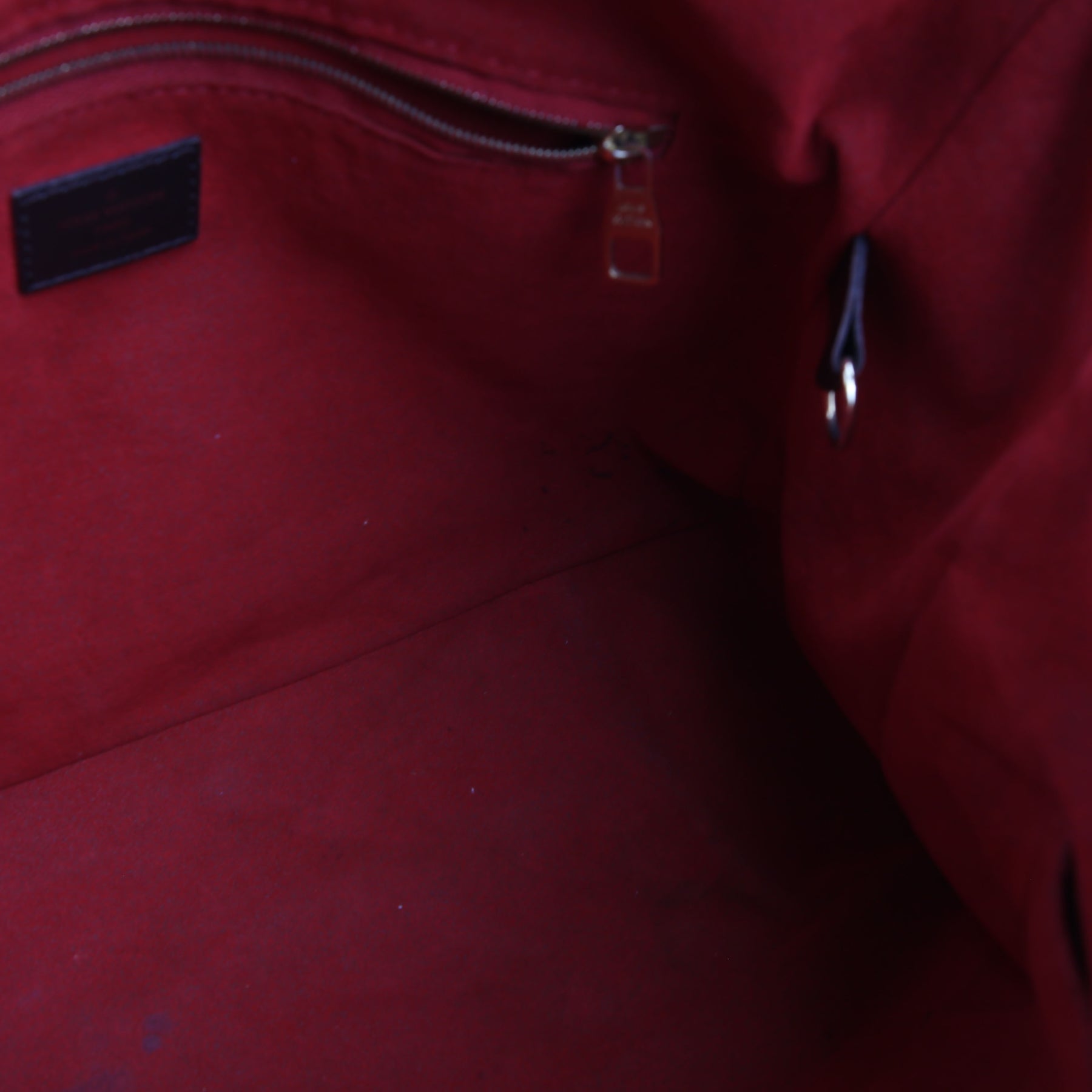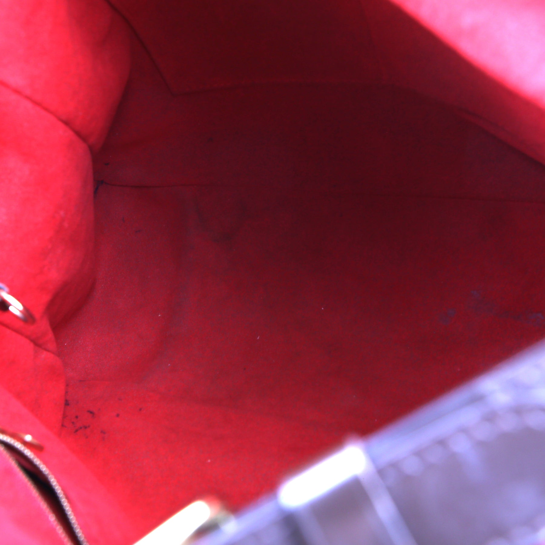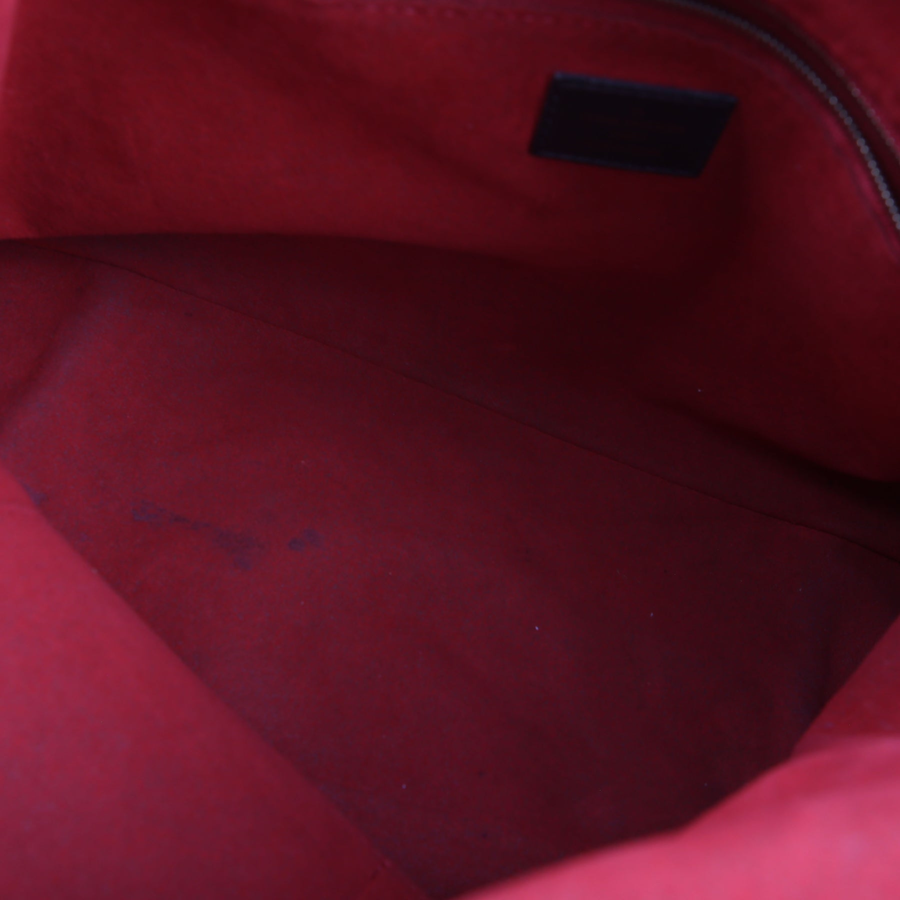 Interior: The interior has minor stains and it features one zippered pocket and two open pockets.