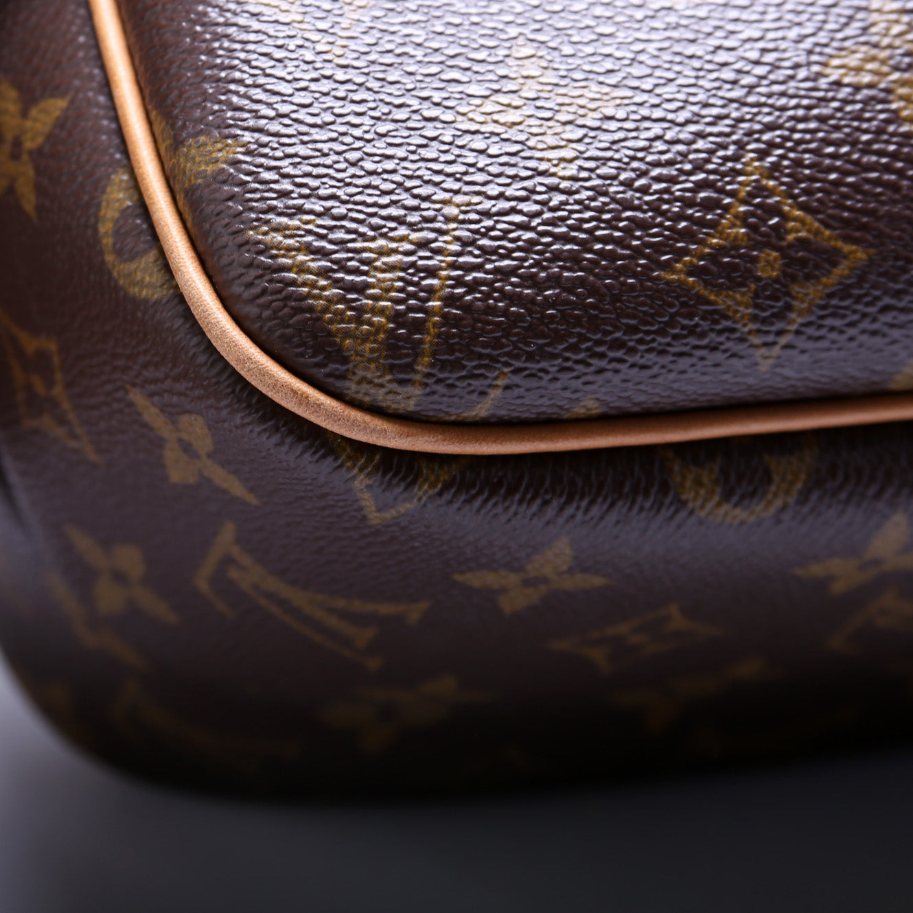 Exterior: The exterior coated canvas is free of any rips or cracks. The exterior features one open pocket. The corners and leather detail show signs of wear and discoloration as pictured. The pipping shows minor wear.