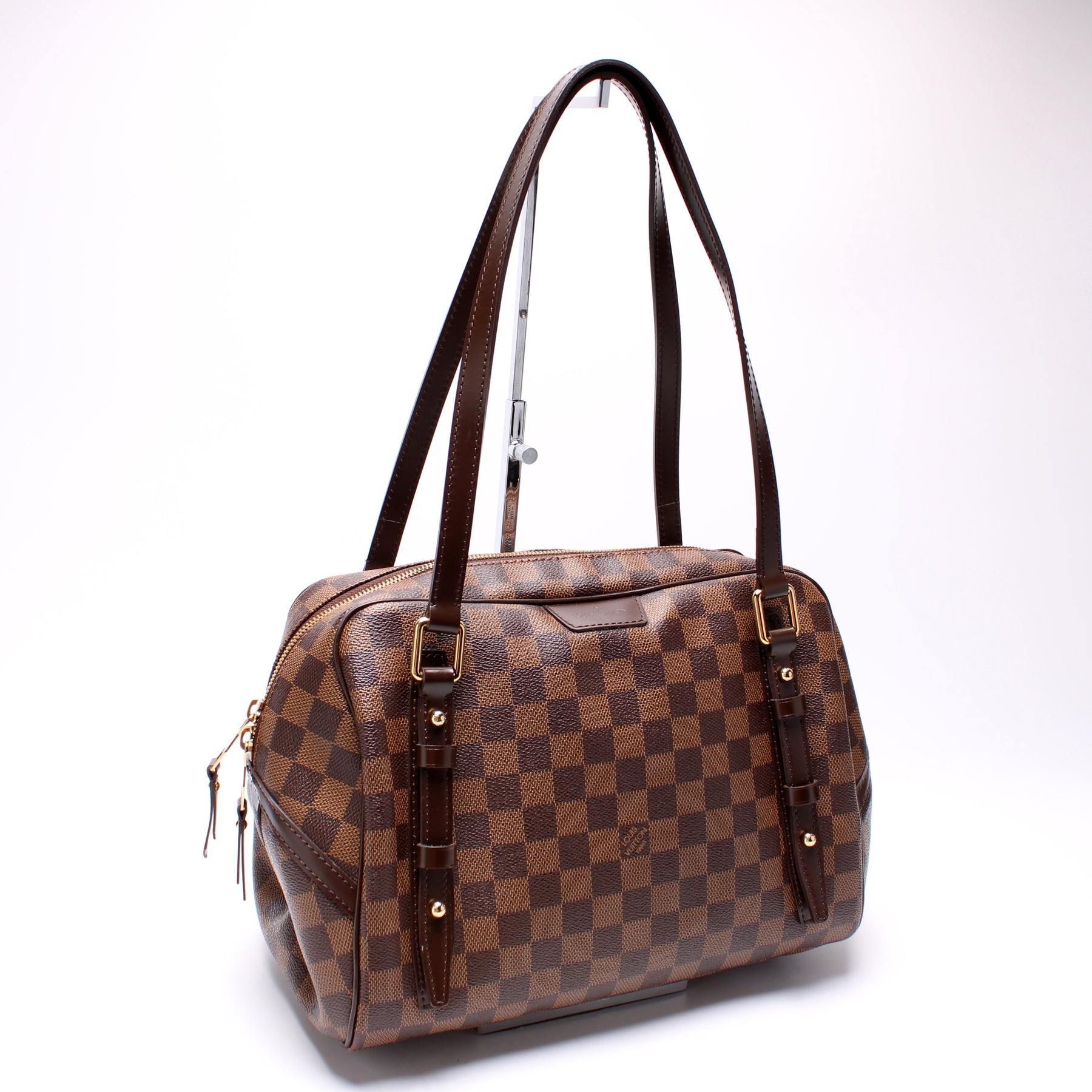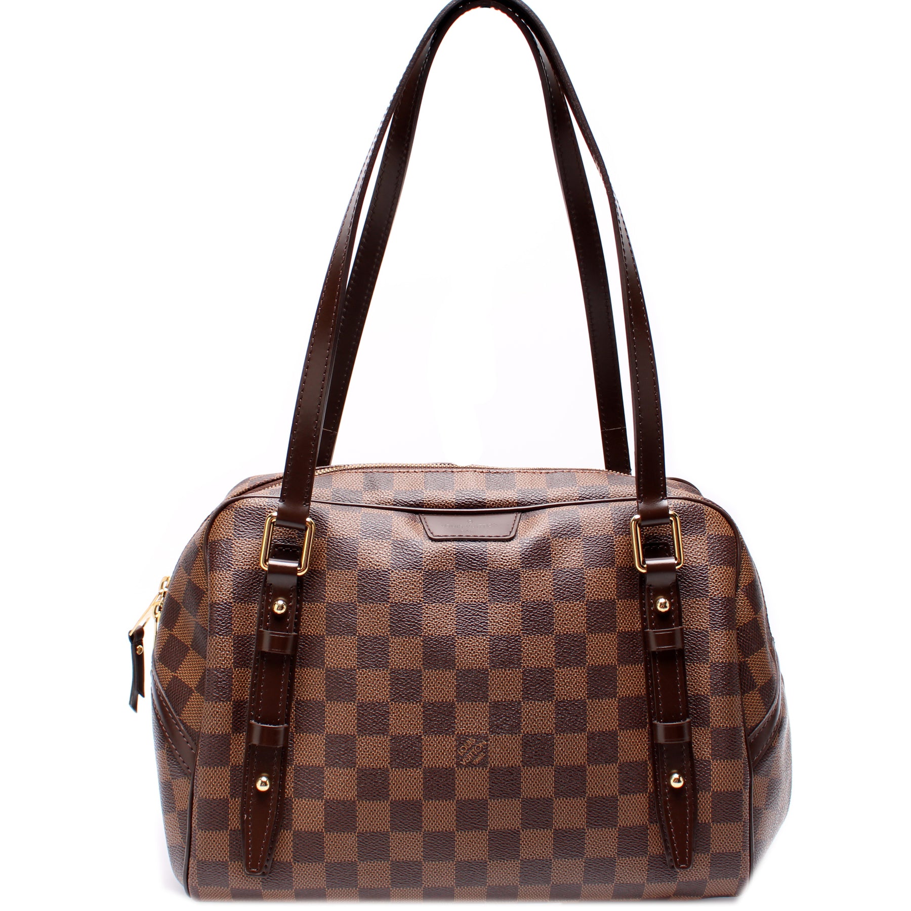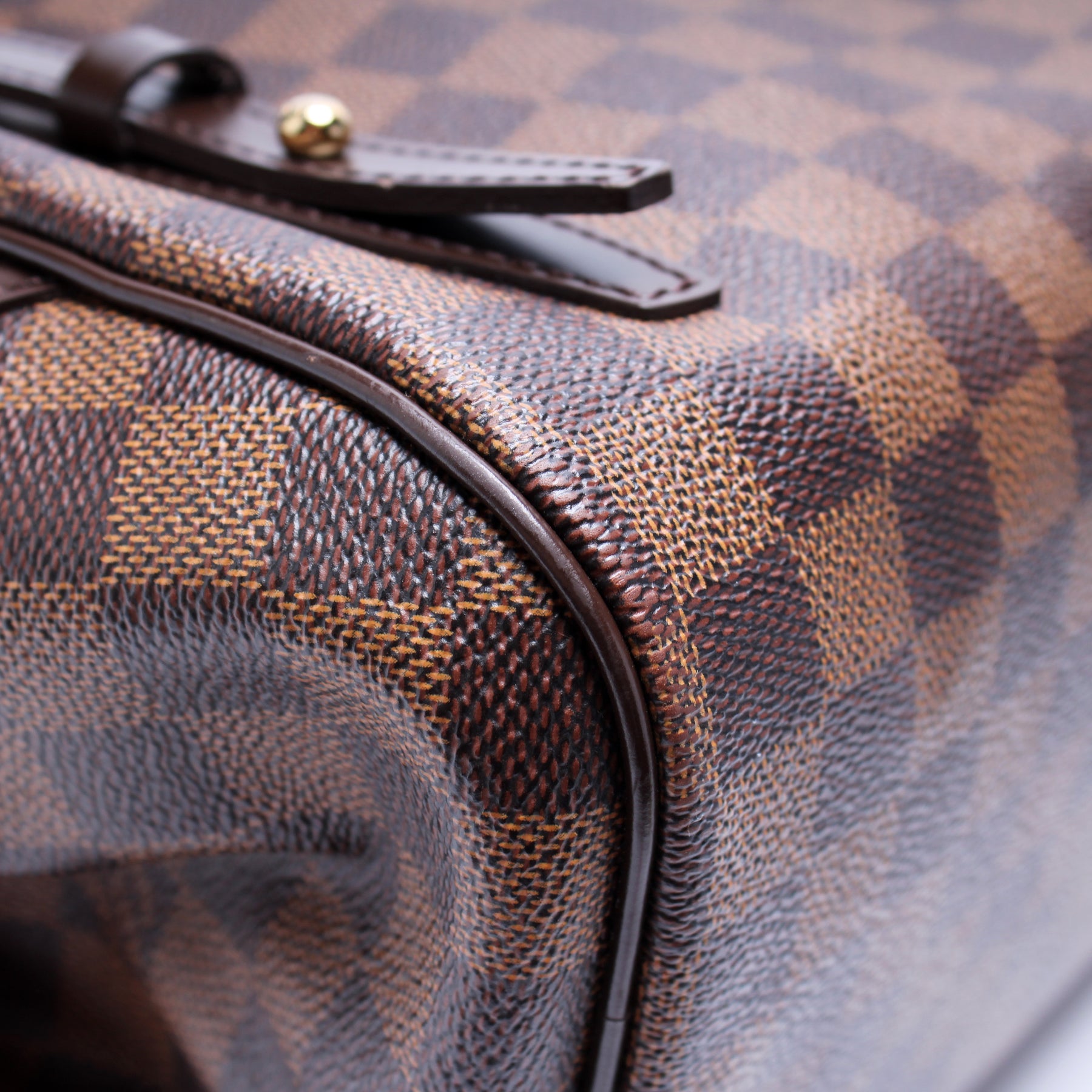This pre-owned Louis Vuitton Rivington GM is guaranteed 100% authentic. The exterior is in the classic Louis Vuitton Damier Ebene coated canvas.