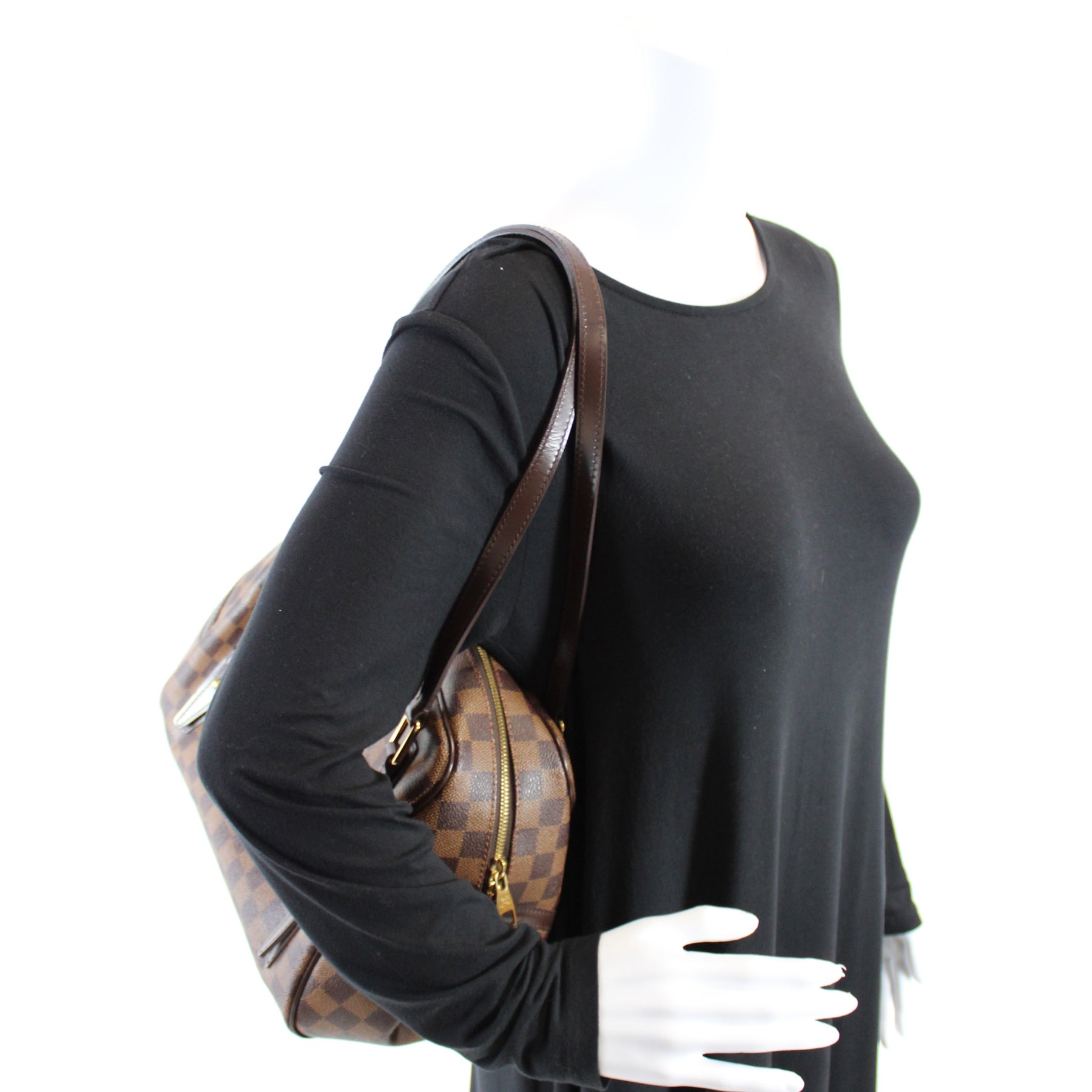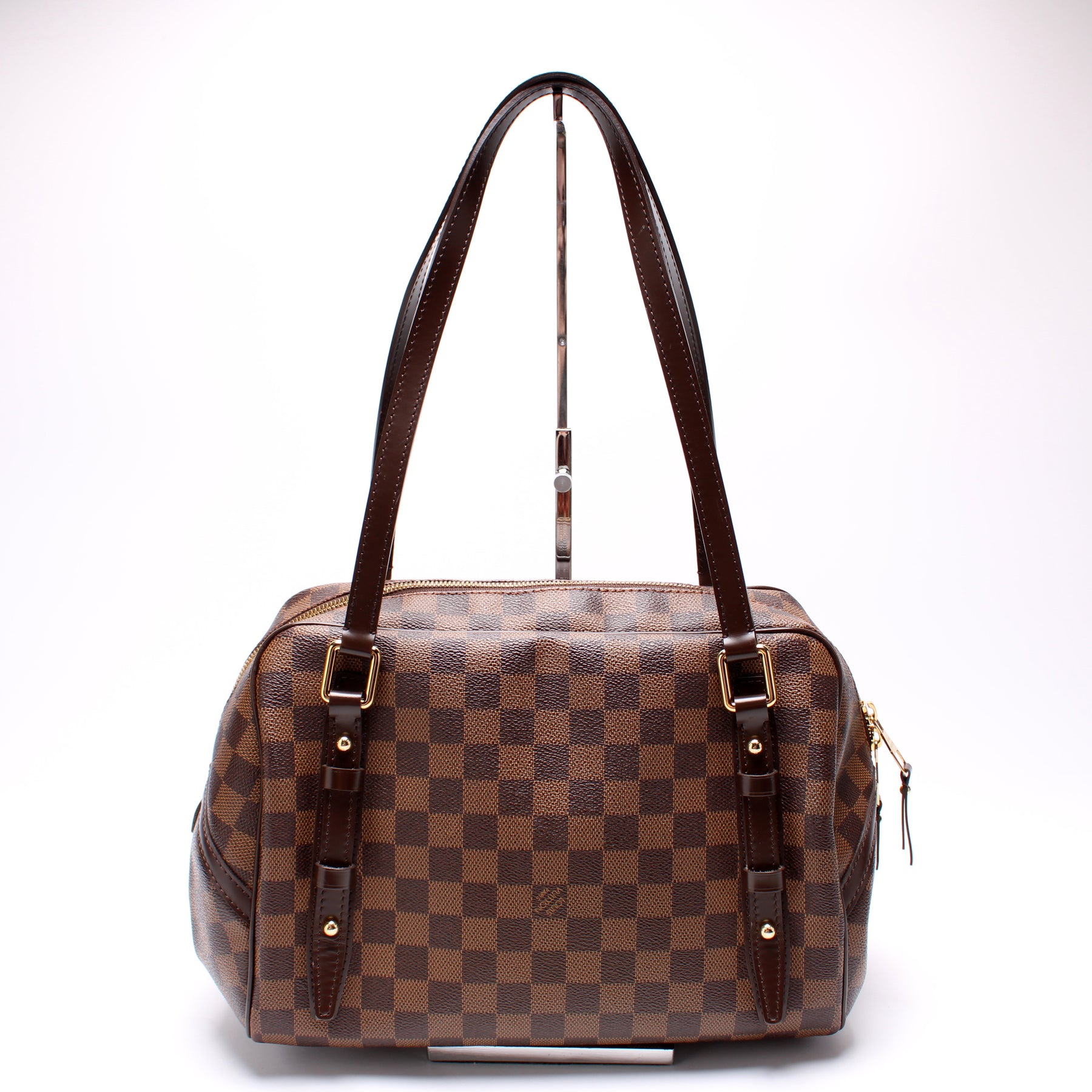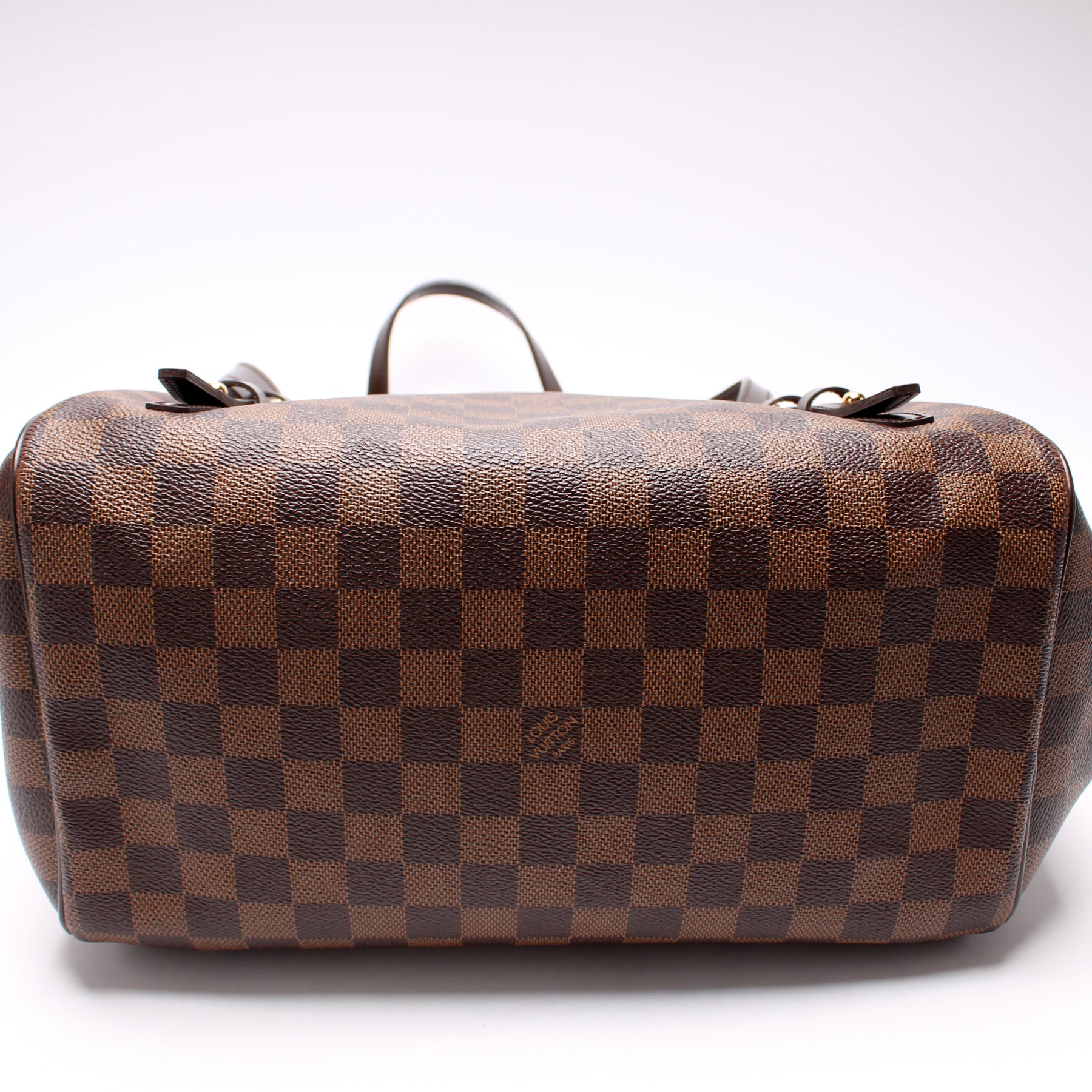 This pre-owned Louis Vuitton Rivington GM is guaranteed 100% authentic. The exterior is in the classic Louis Vuitton Damier Ebene coated canvas.
