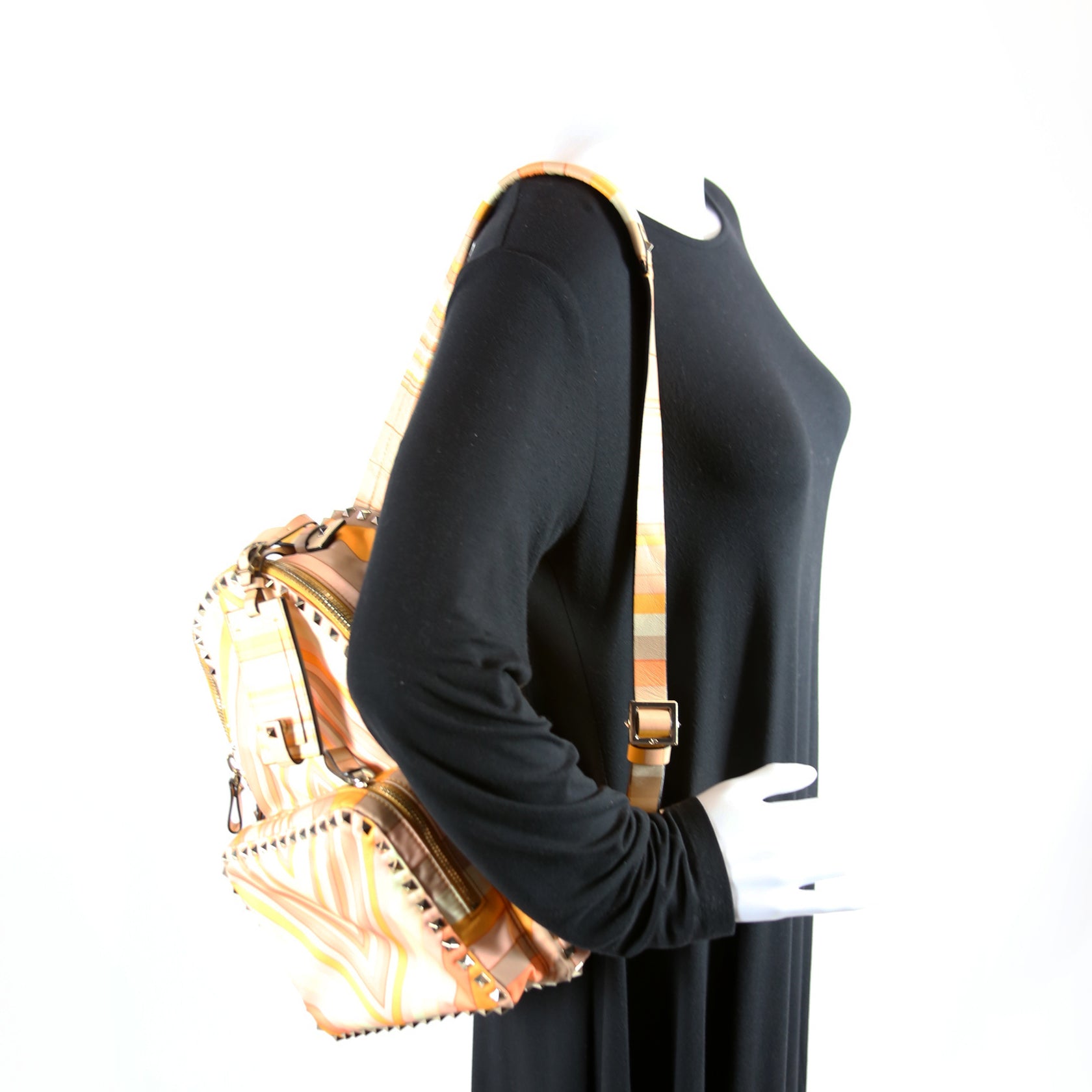 This pre-owned Valentino Rockstud 1975 Printed Nylon Medium Backpack is guaranteed 100% authentic.