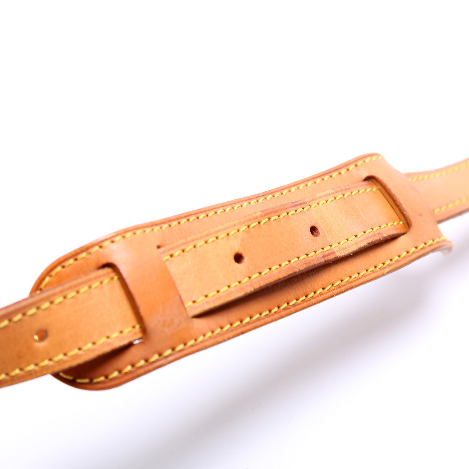 Strap: The leather strap has discoloration and wear throughout. There is wear to the connection points.