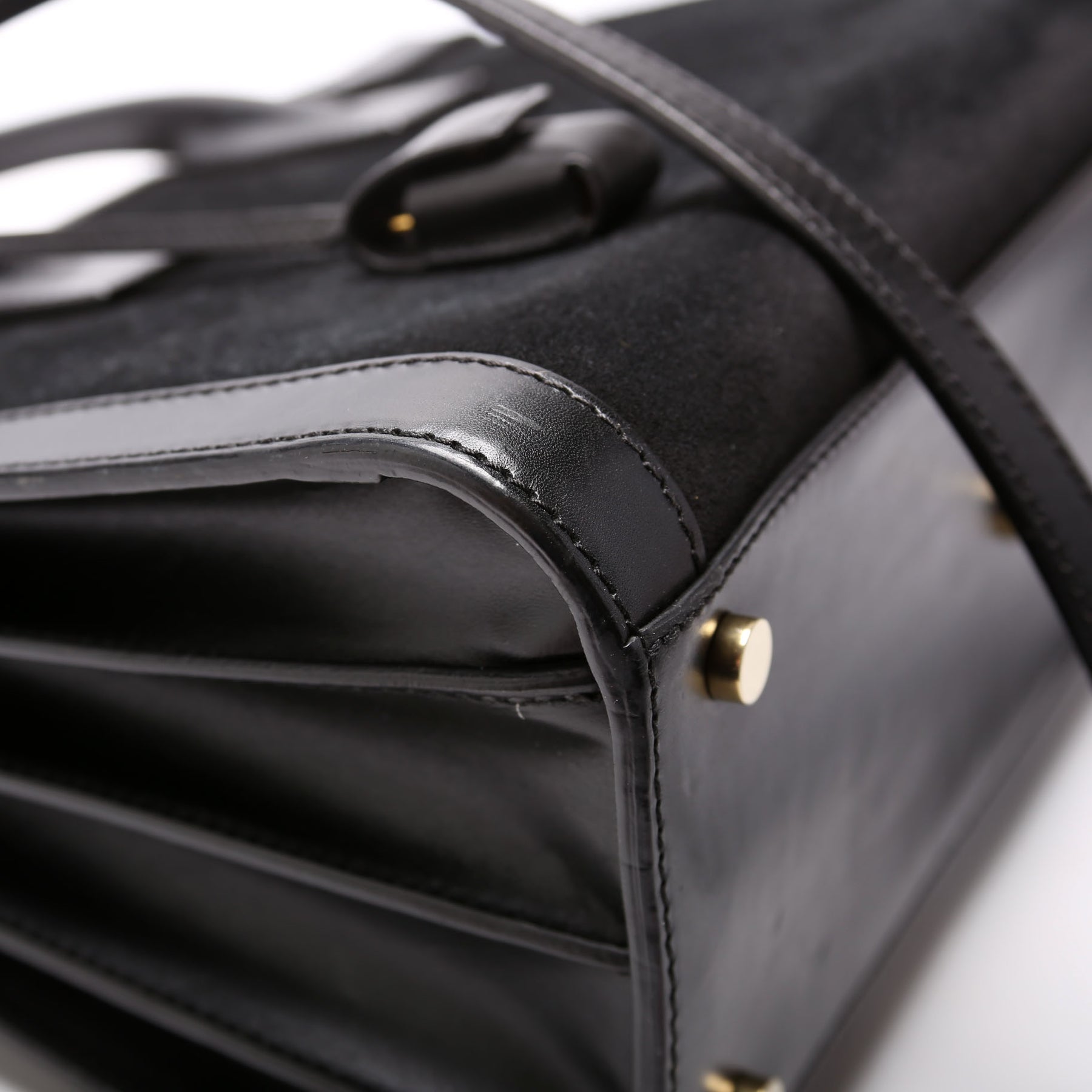 Handle: The leather handles show minor discoloration and wear.