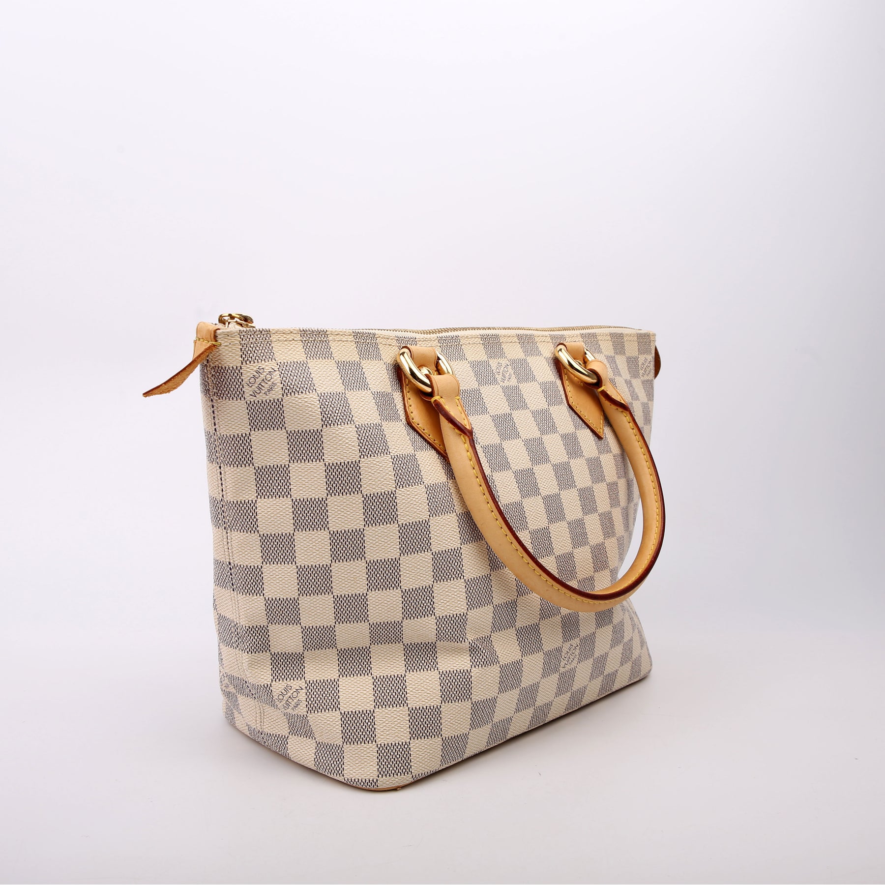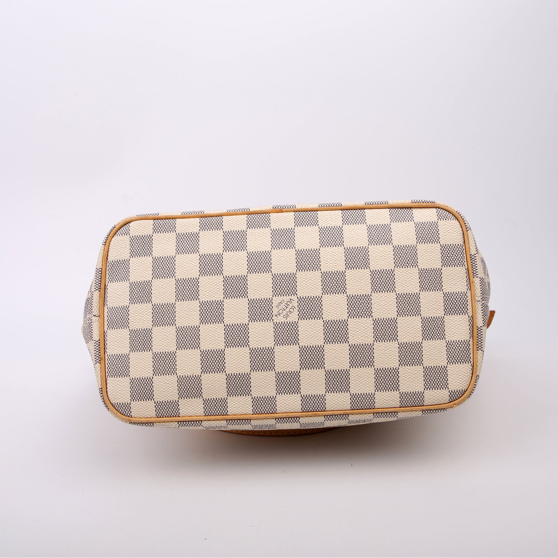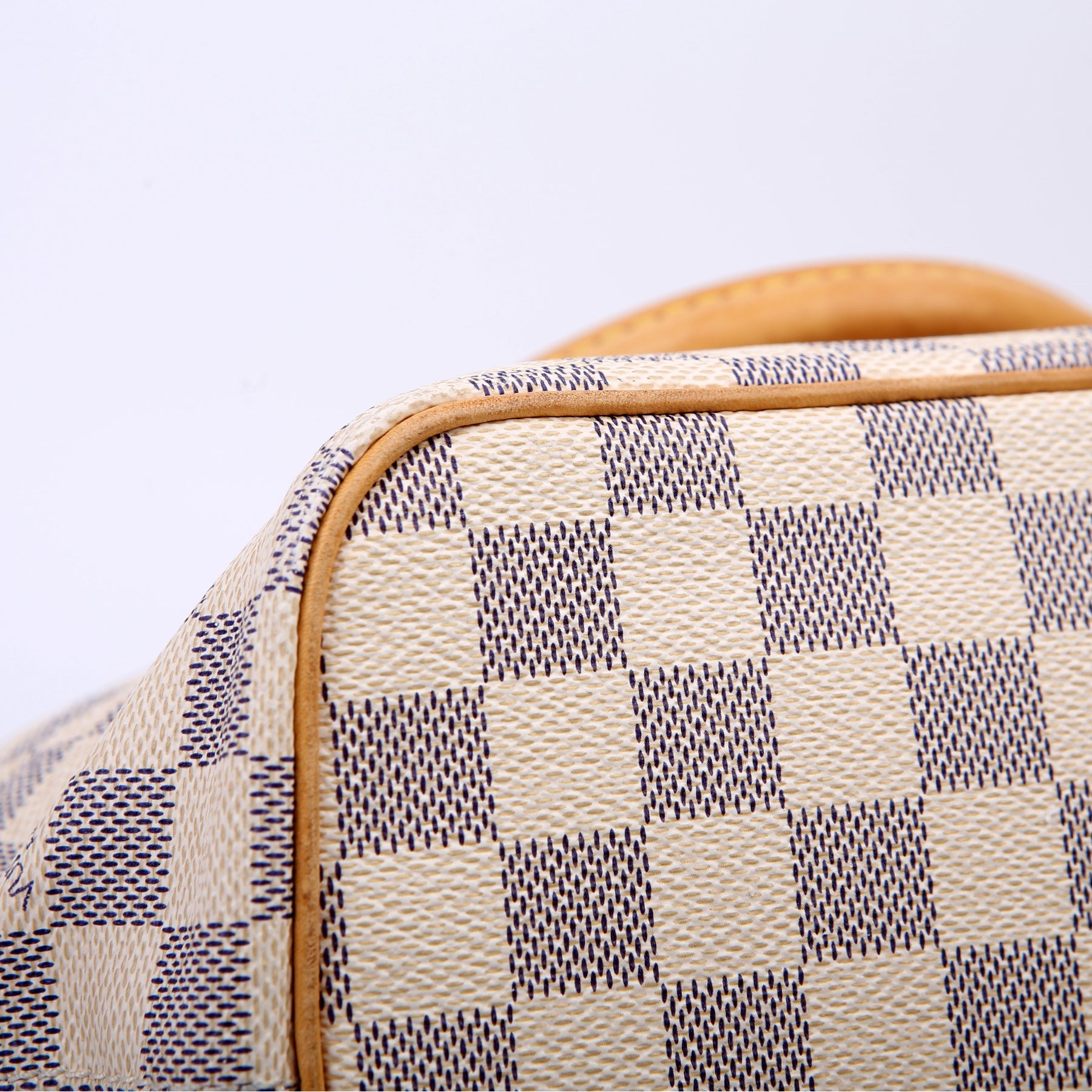 This pre-owned Saleya PM is guaranteed 100% authentic. The exterior is in the classic Louis Vuitton Damier Azur coated canvas.