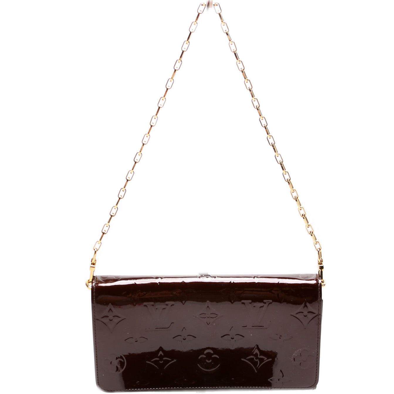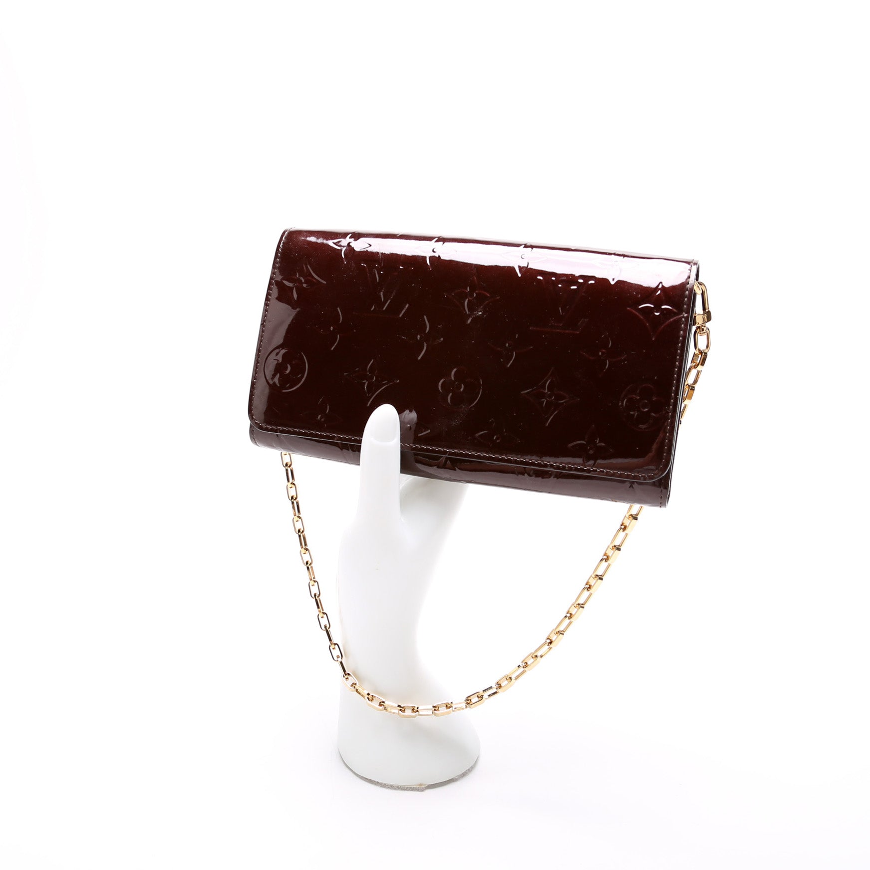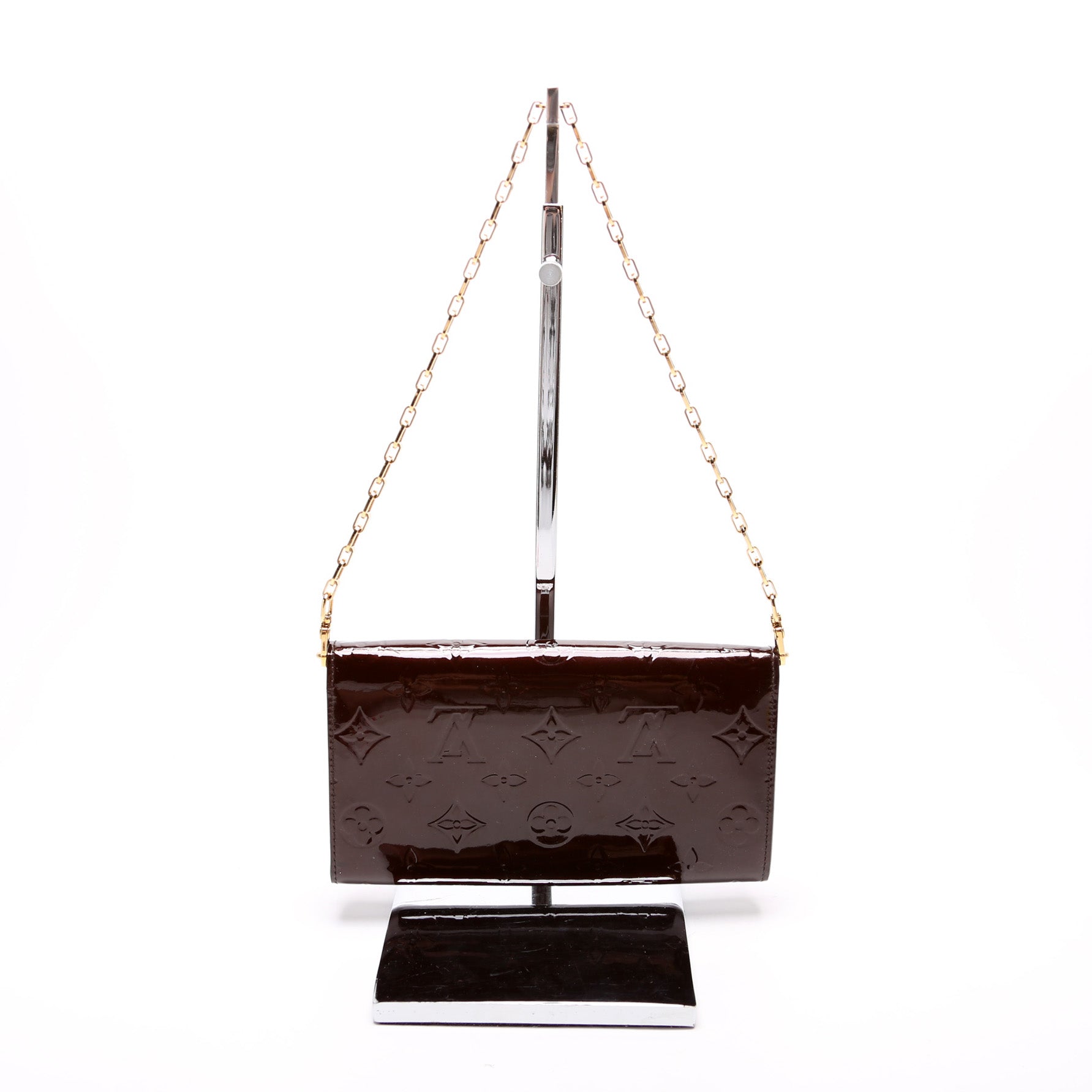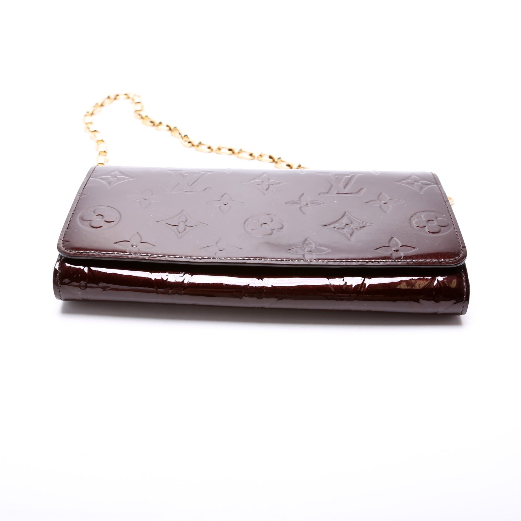 This pre-owned Louis Vuitton Sarah Chain Wallet is guaranteed 100% authentic. The exterior is in the classic Louis Vuitton Vernis leather.
