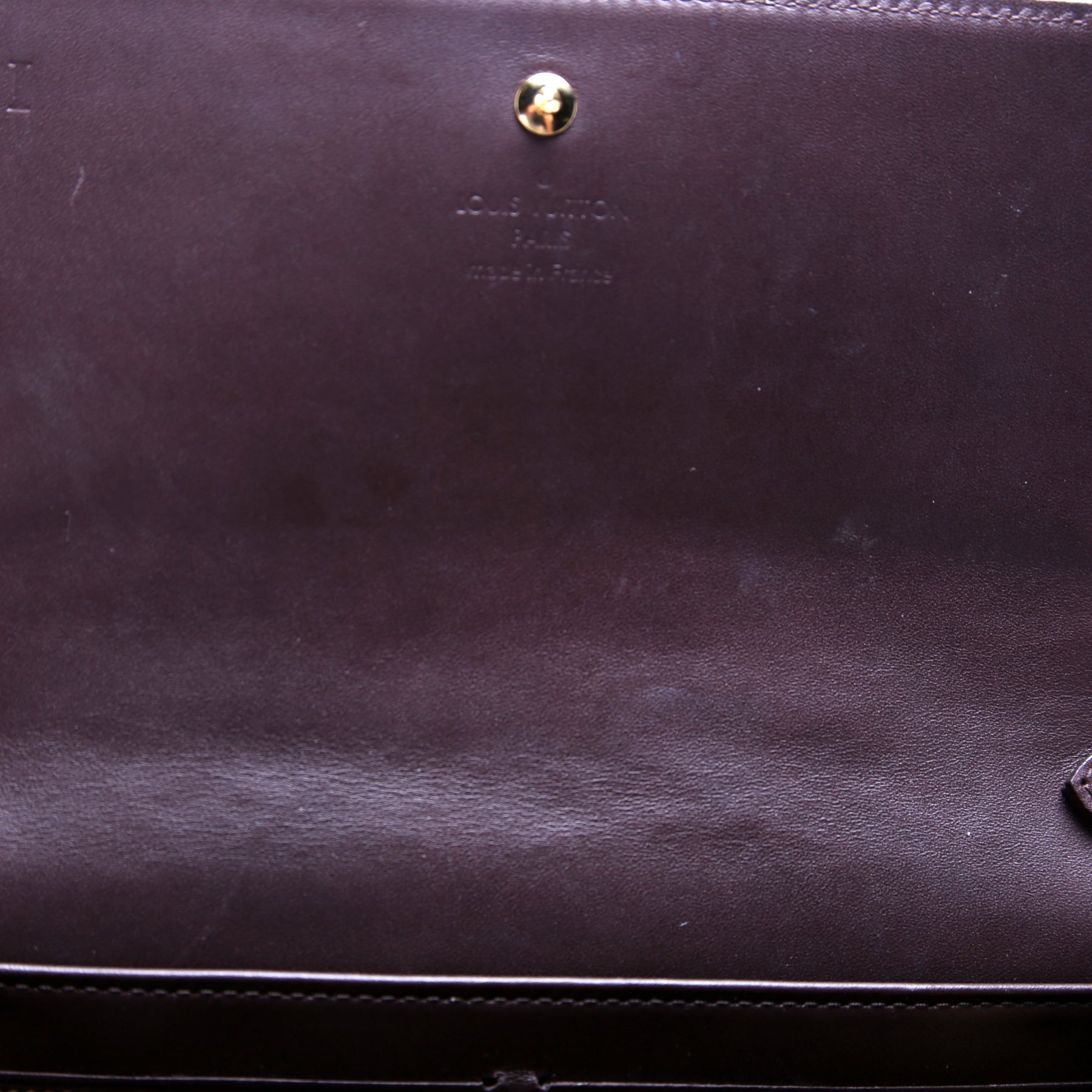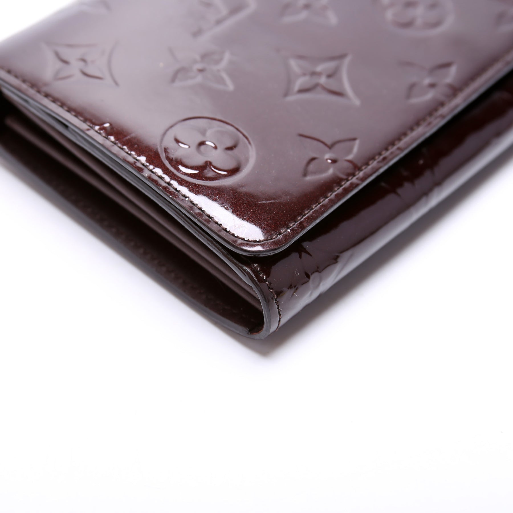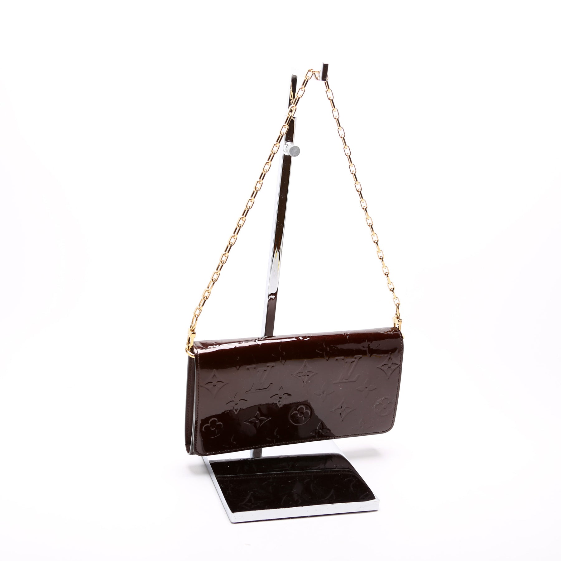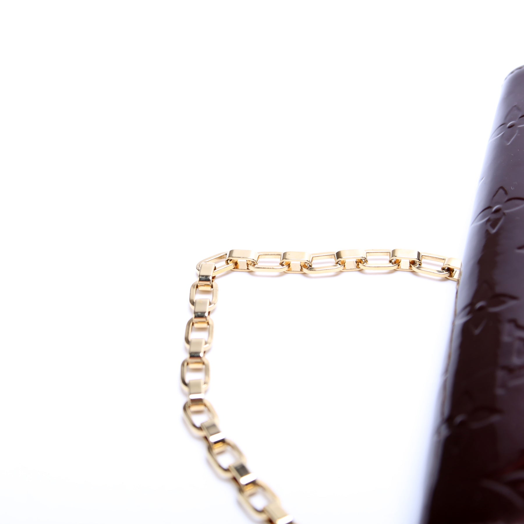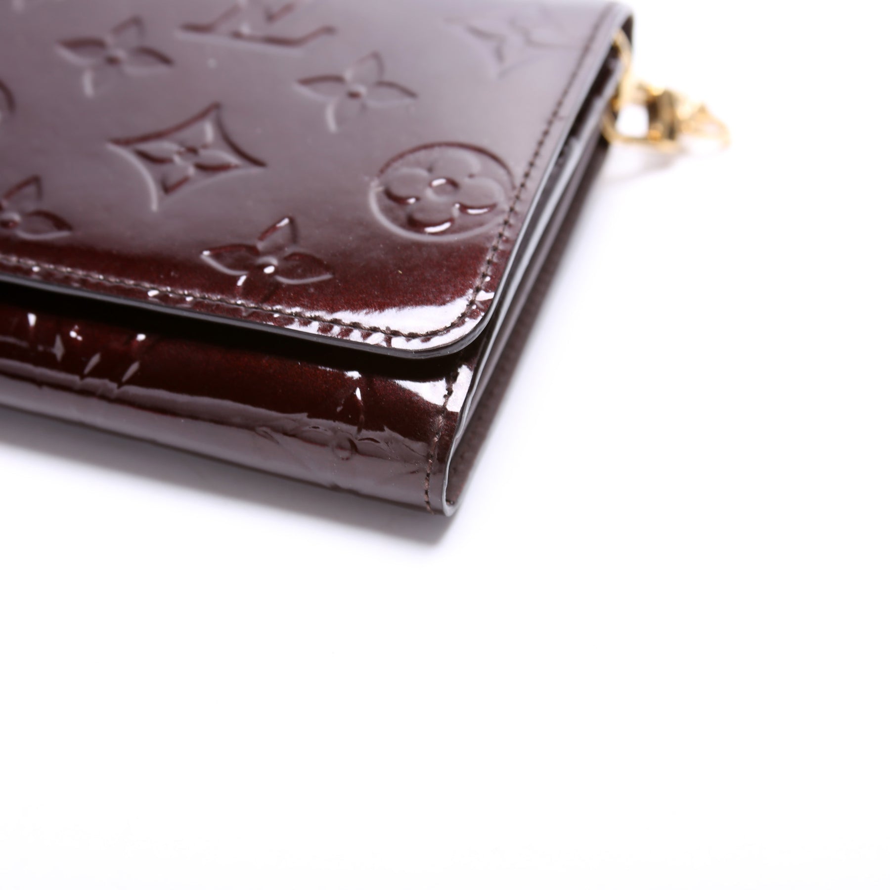 This pre-owned Louis Vuitton Sarah Chain Wallet is guaranteed 100% authentic. The exterior is in the classic Louis Vuitton Vernis leather.