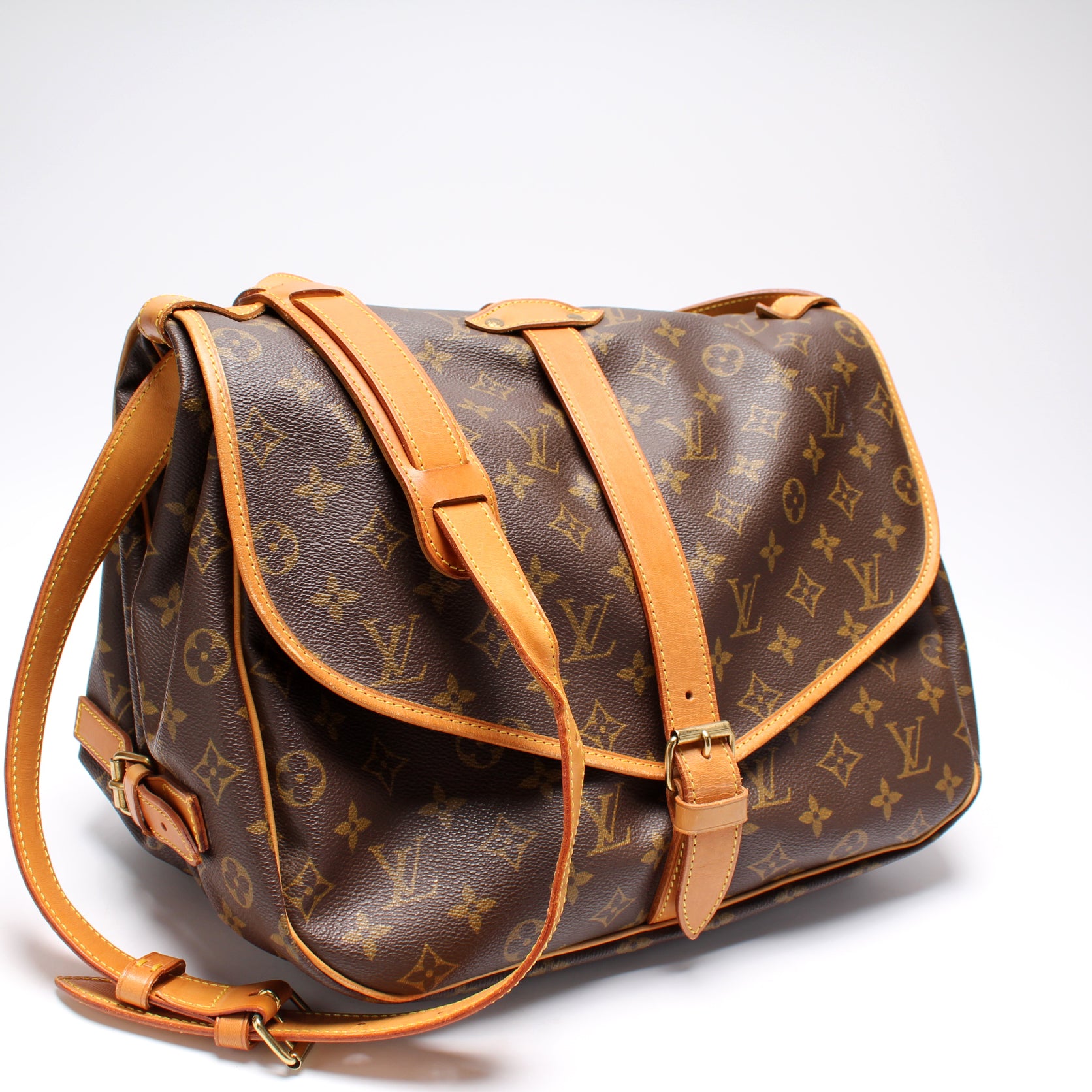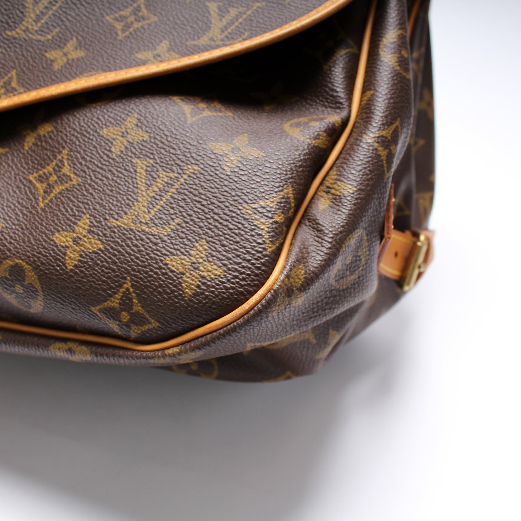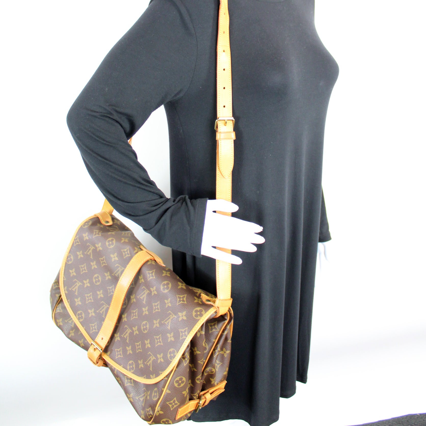 This pre-owned Louis Vuitton Saumur 35 is guaranteed 100% authentic. The exterior is in the classic Louis Vuitton Monogram coated canvas.