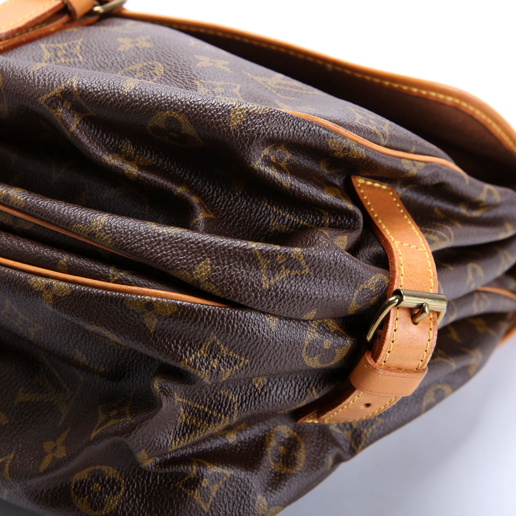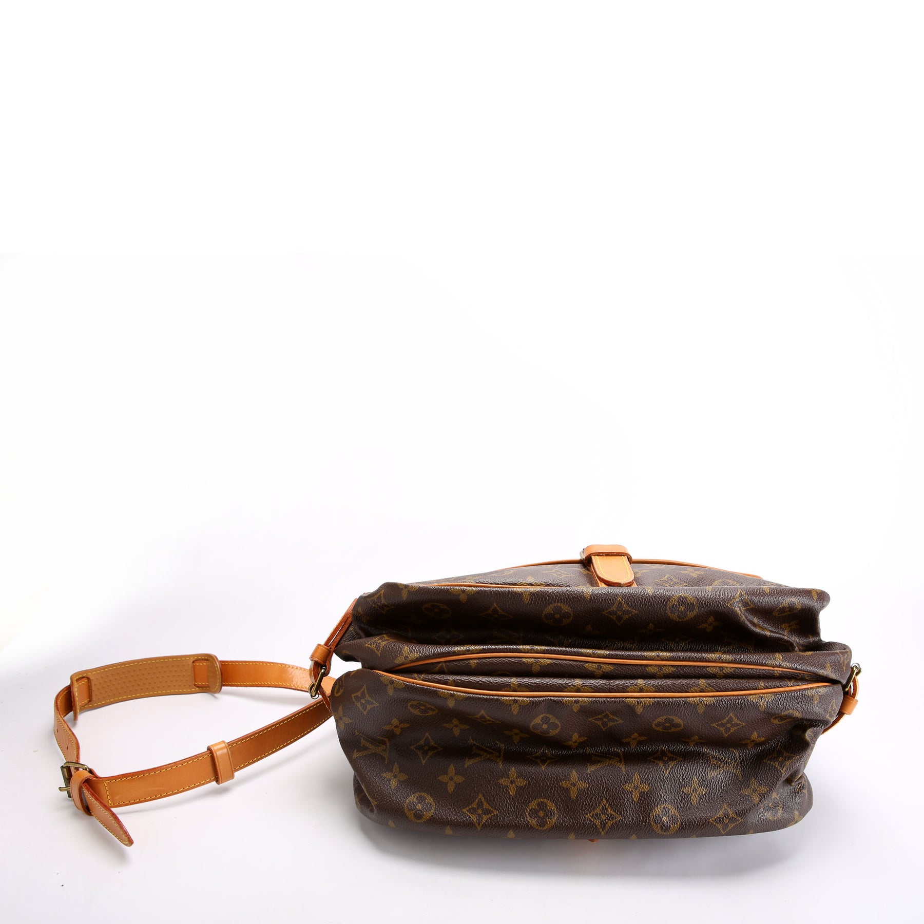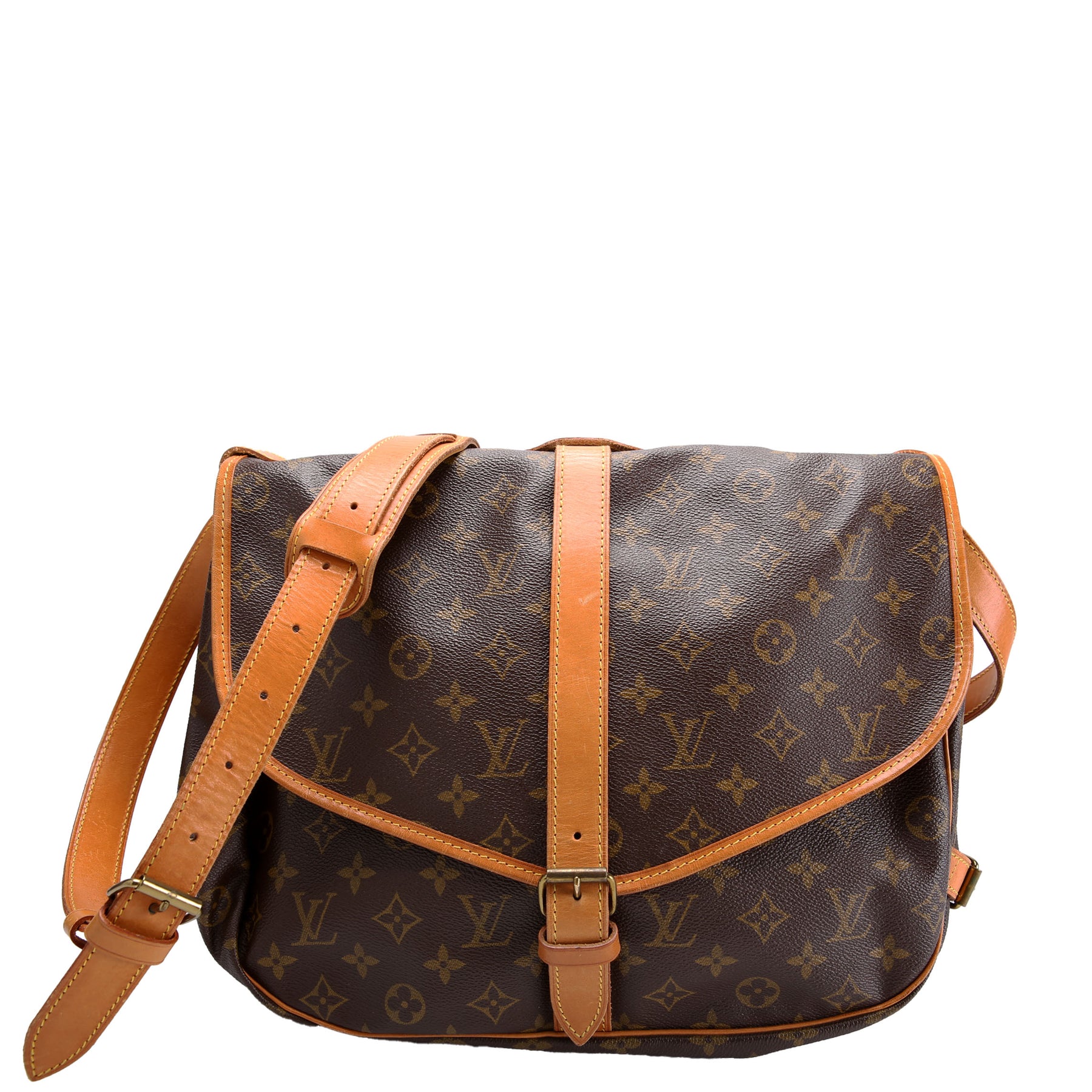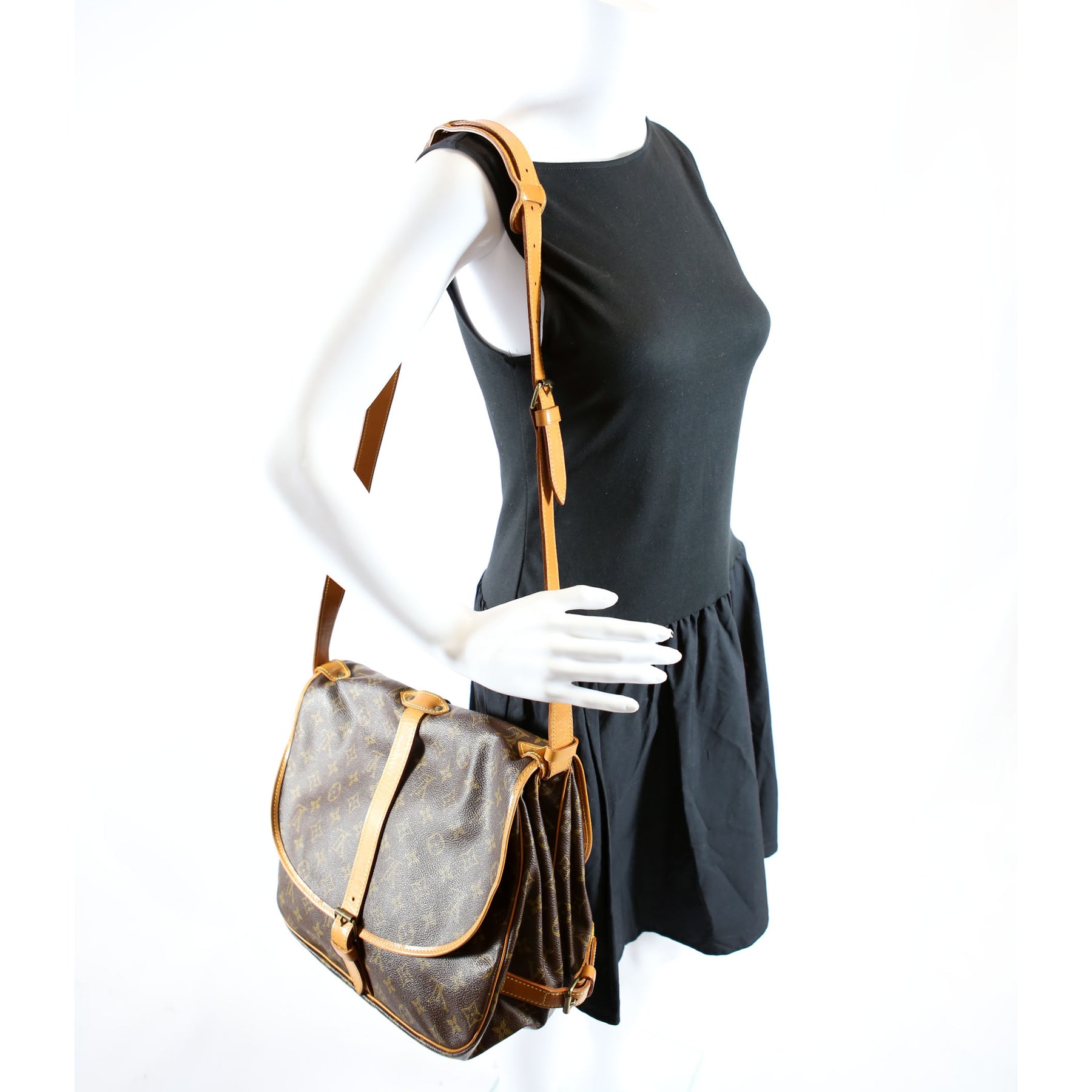 This pre-owned Louis Vuitton Saumur 35 is guaranteed 100% authentic. The exterior is in the classic Louis Vuitton Monogram coated canvas.