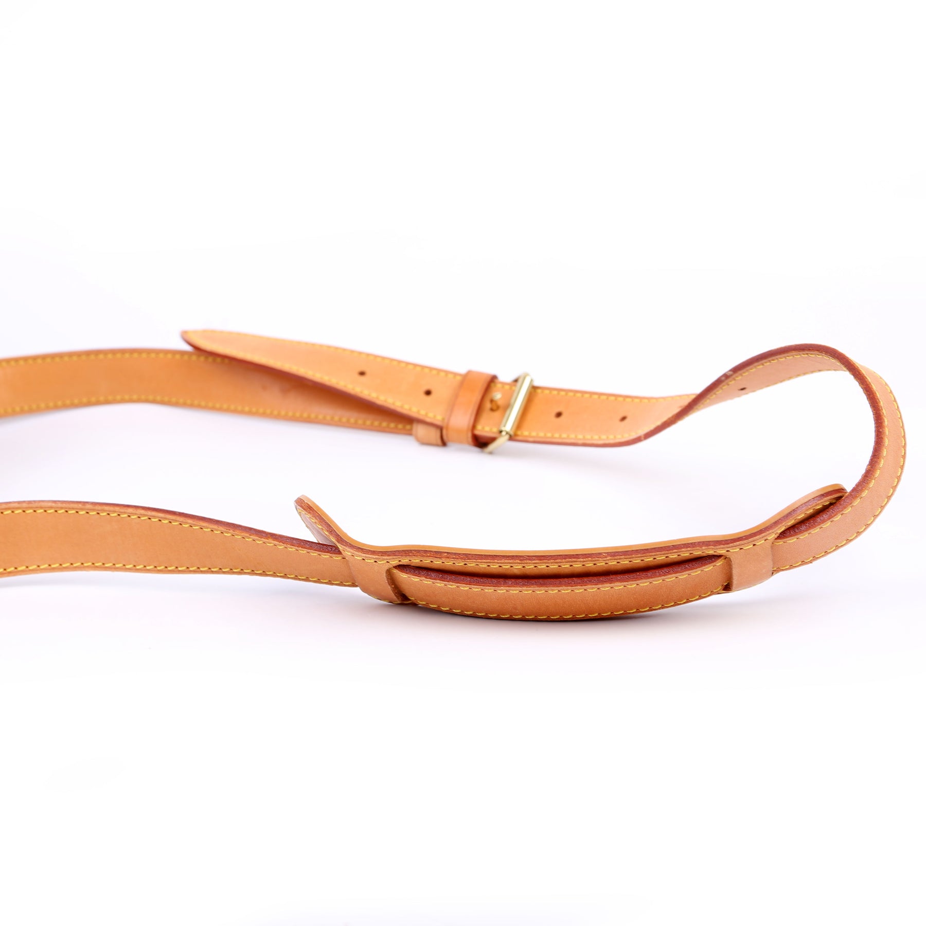 Exterior: The exterior Monogram coated canvas is free of any rips or cracks. The leather trim and details show minor discoloration. The leather strap closure is starting to crack at the top of the bag.