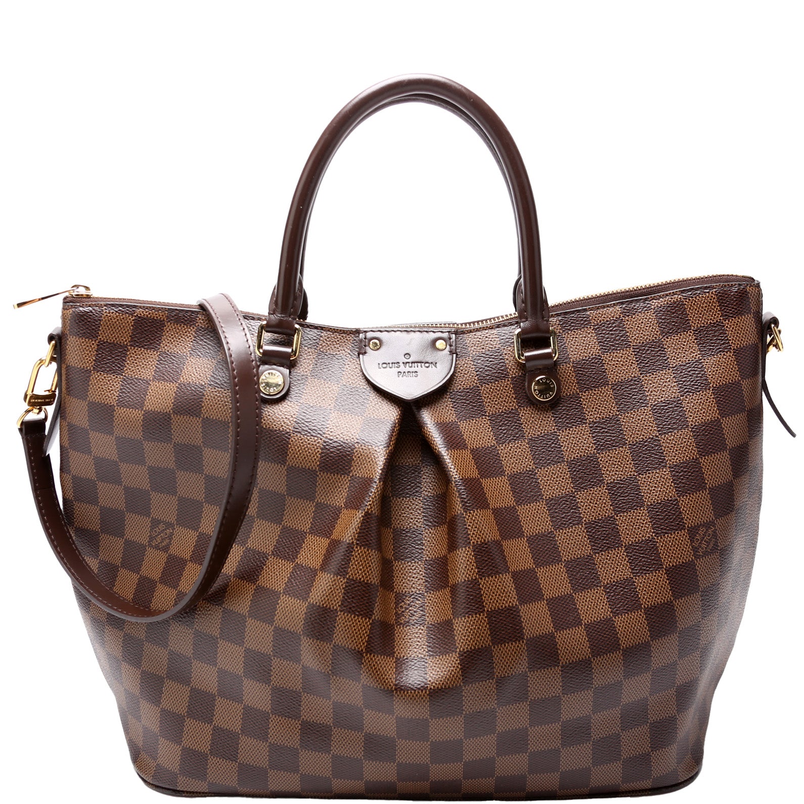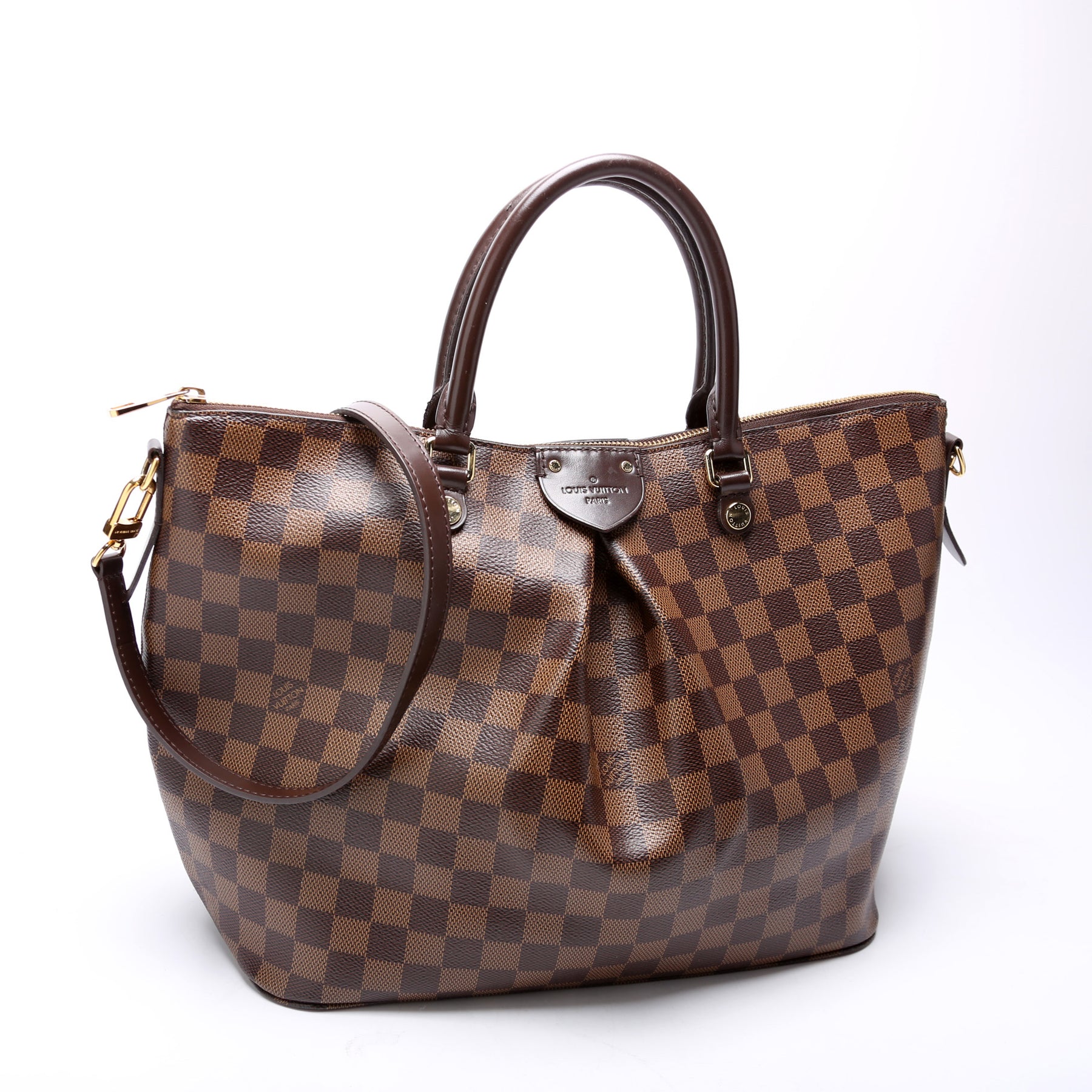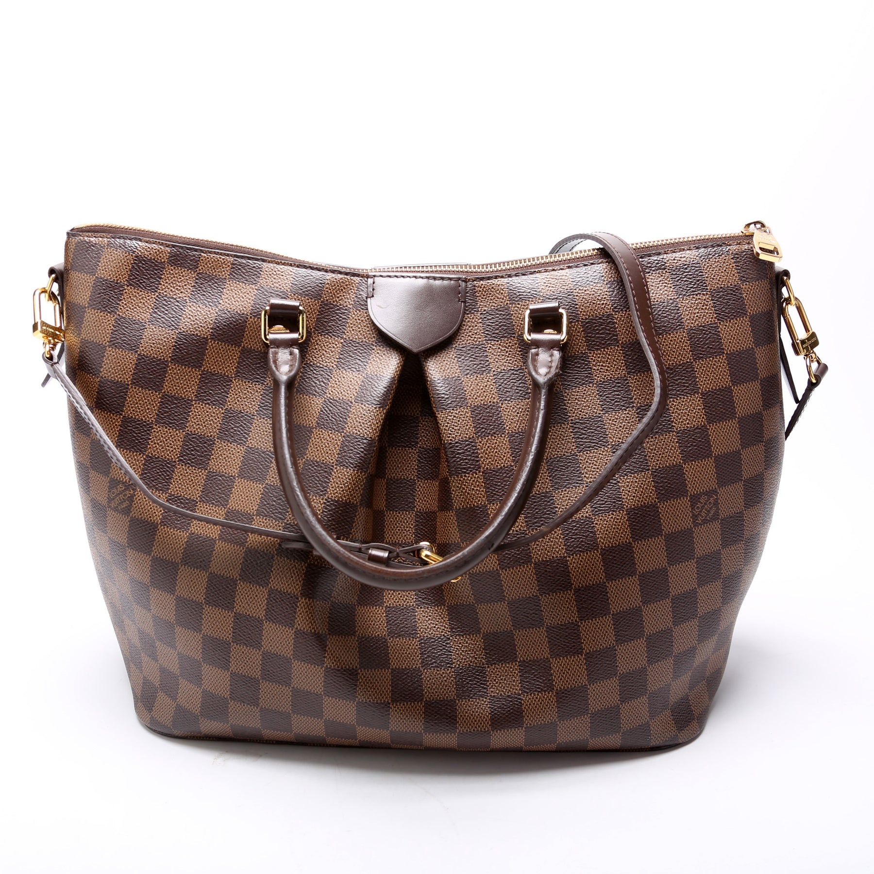This pre-owned Louis Vuitton Siena GM is guaranteed 100% authentic. The exterior is in the classic Louis Vuitton Damier Ebene coated canvas.