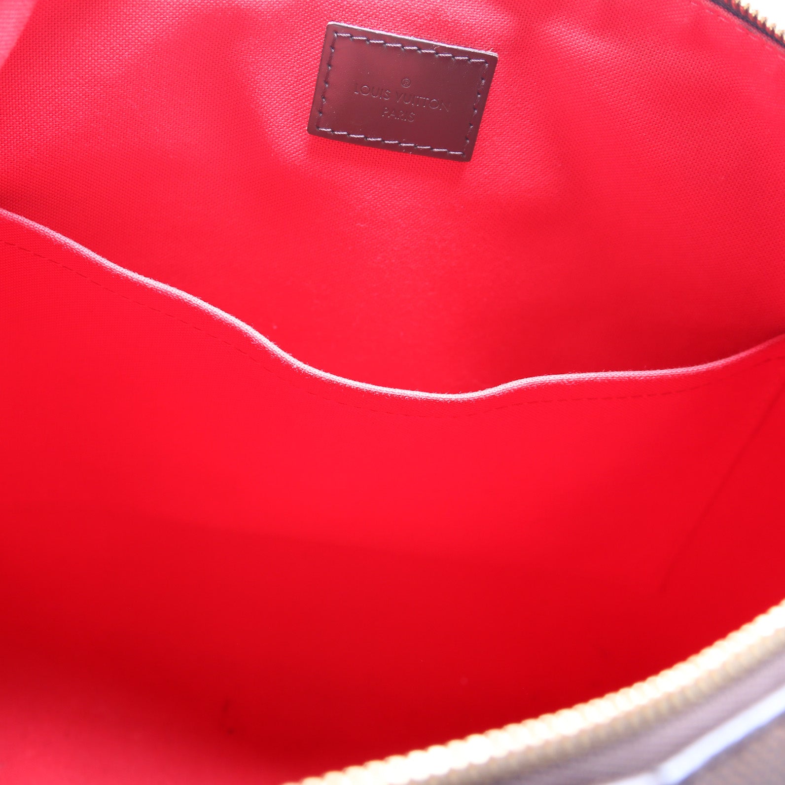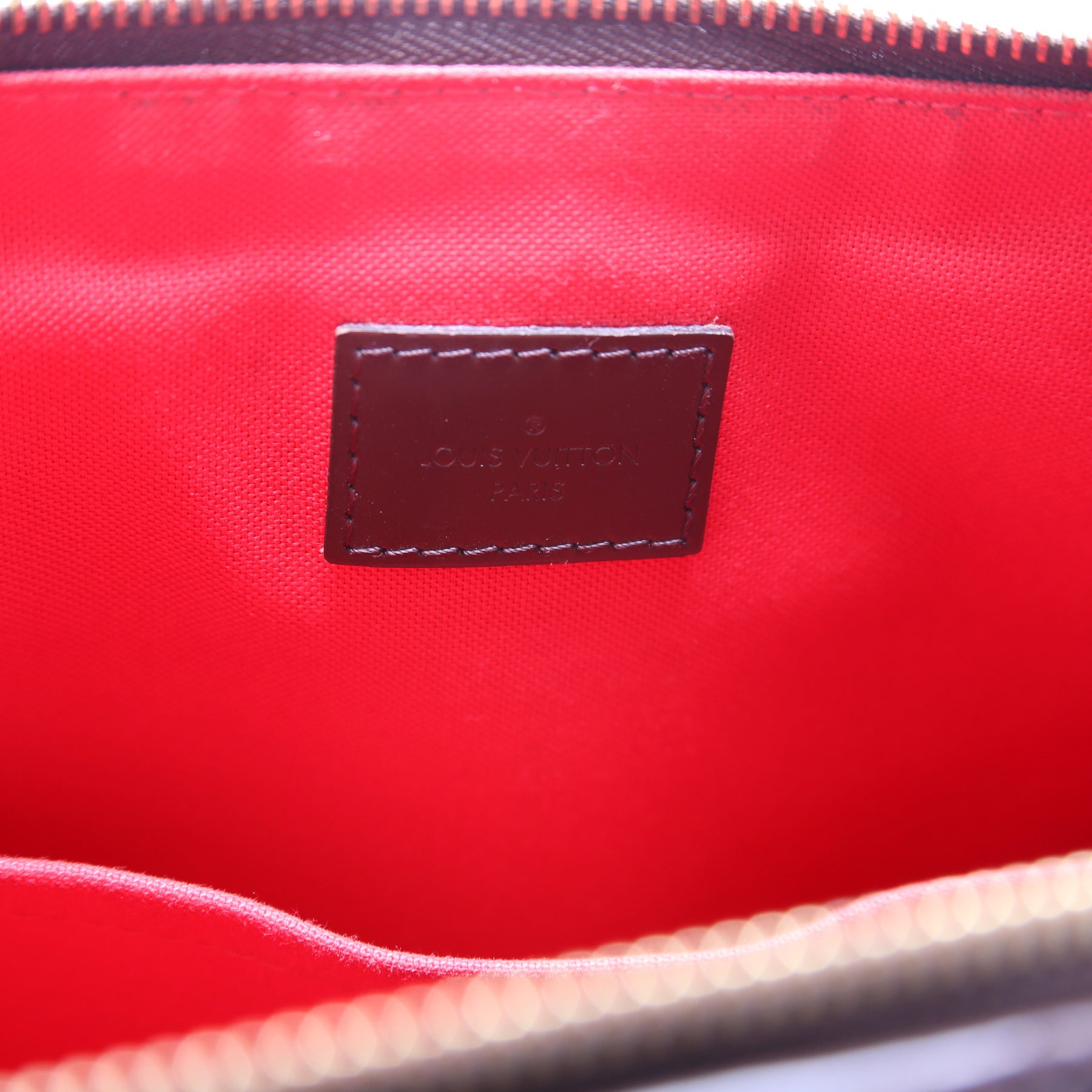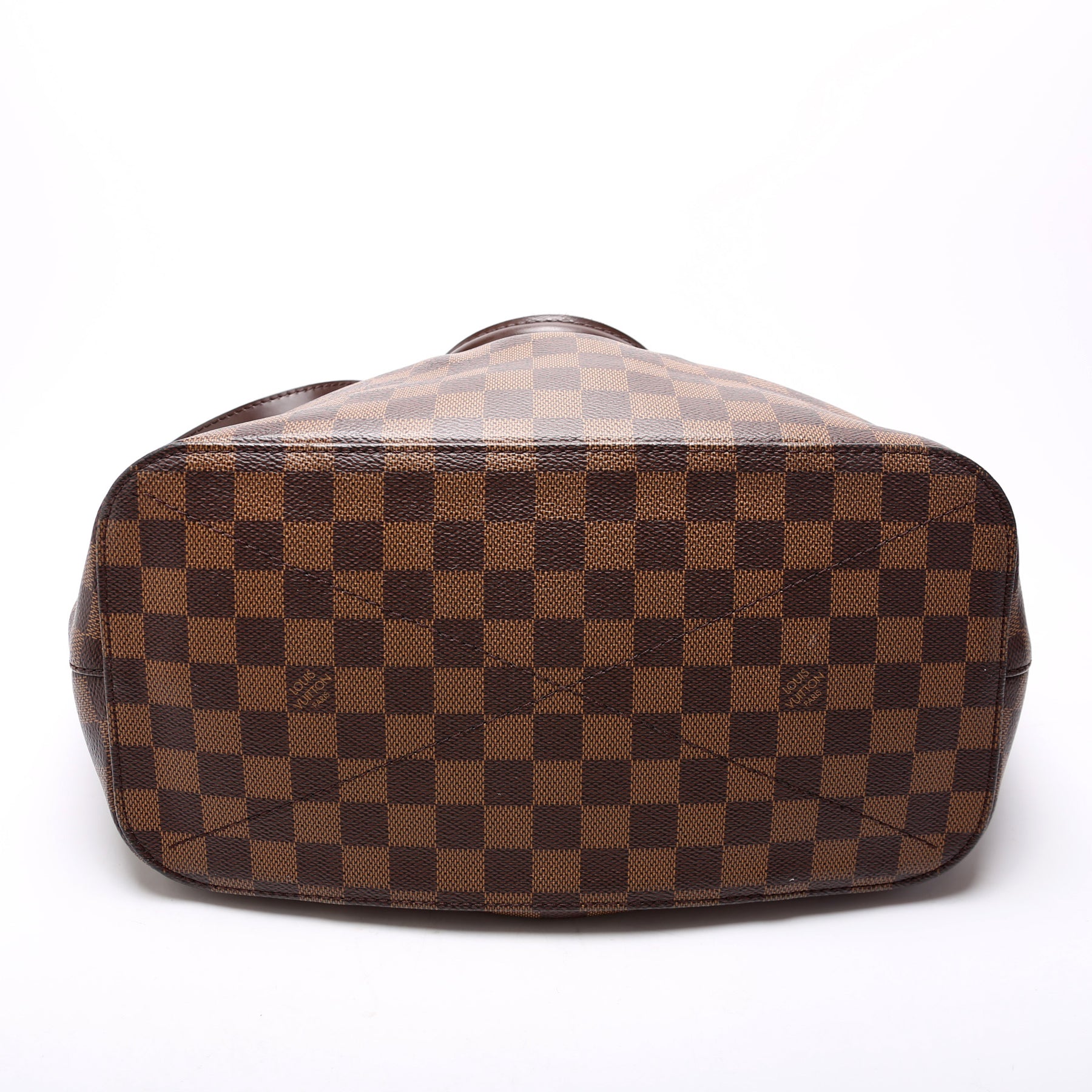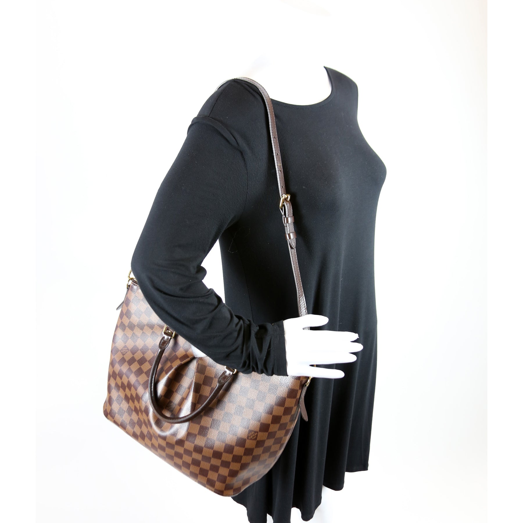 This pre-owned Louis Vuitton Siena GM is guaranteed 100% authentic. The exterior is in the classic Louis Vuitton Damier Ebene coated canvas.