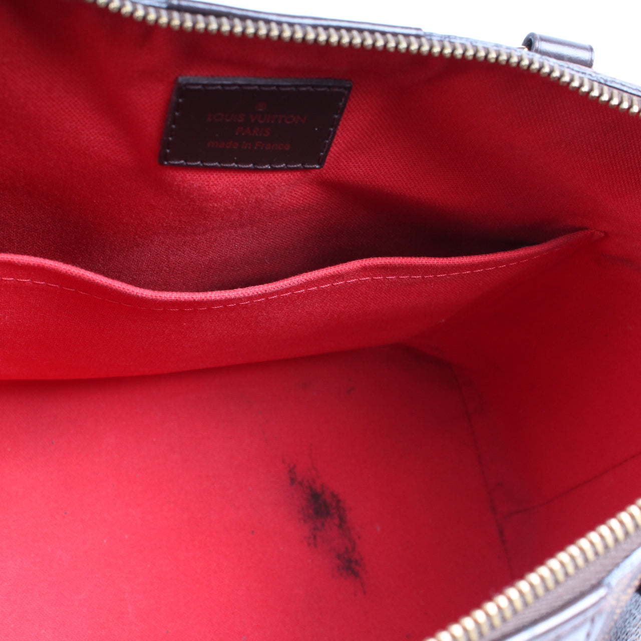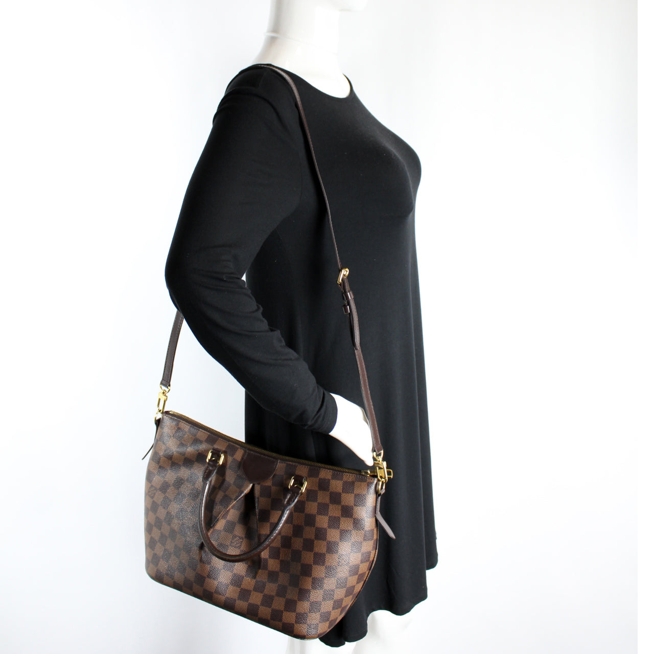 This pre-owned Louis Vuitton Siena MM is guaranteed 100% authentic. The exterior is in the classic Damier Ebene coated canvas.