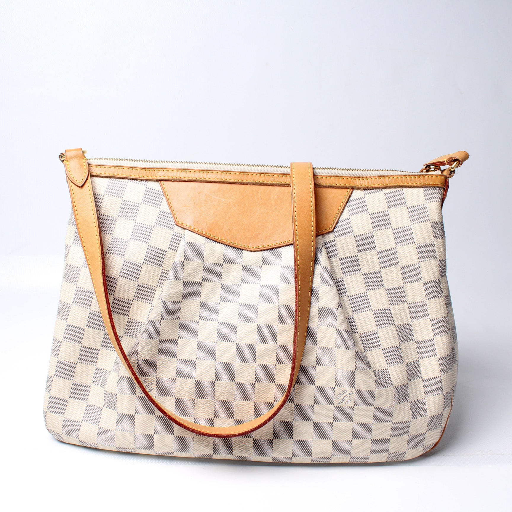 This pre-owned Louis Vuitton Siracusa PM is guaranteed 100% authentic. The exterior is in the classic Louis Vuitton Damier Azur coated canvas.