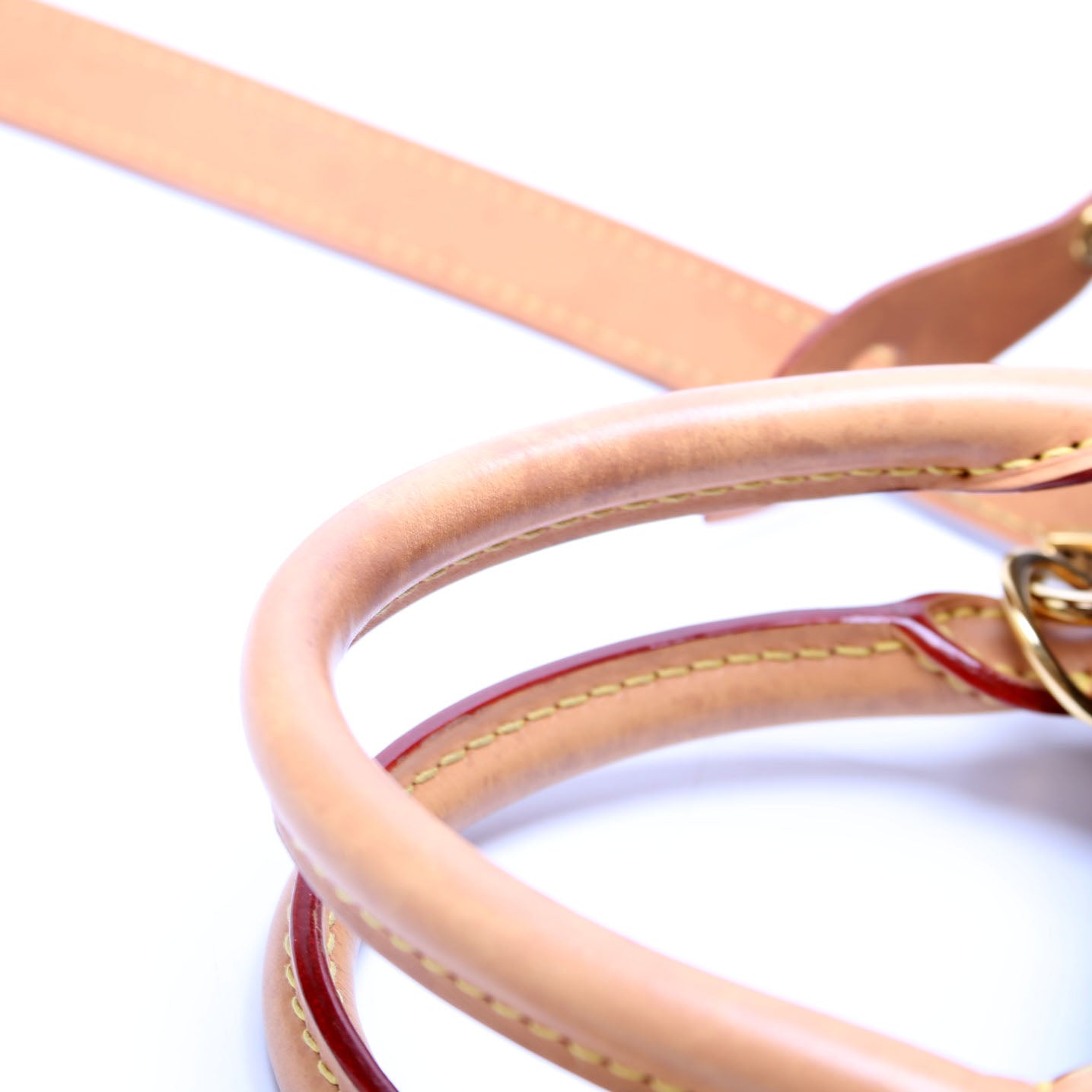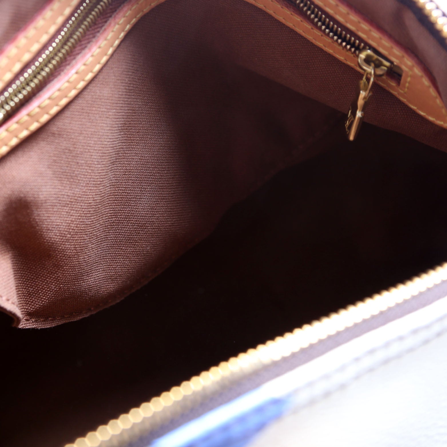 Exterior: The exterior coated canvas is free of any rips or cracks. The exterior features one open pocket. The leather trim has discoloration throughout.
