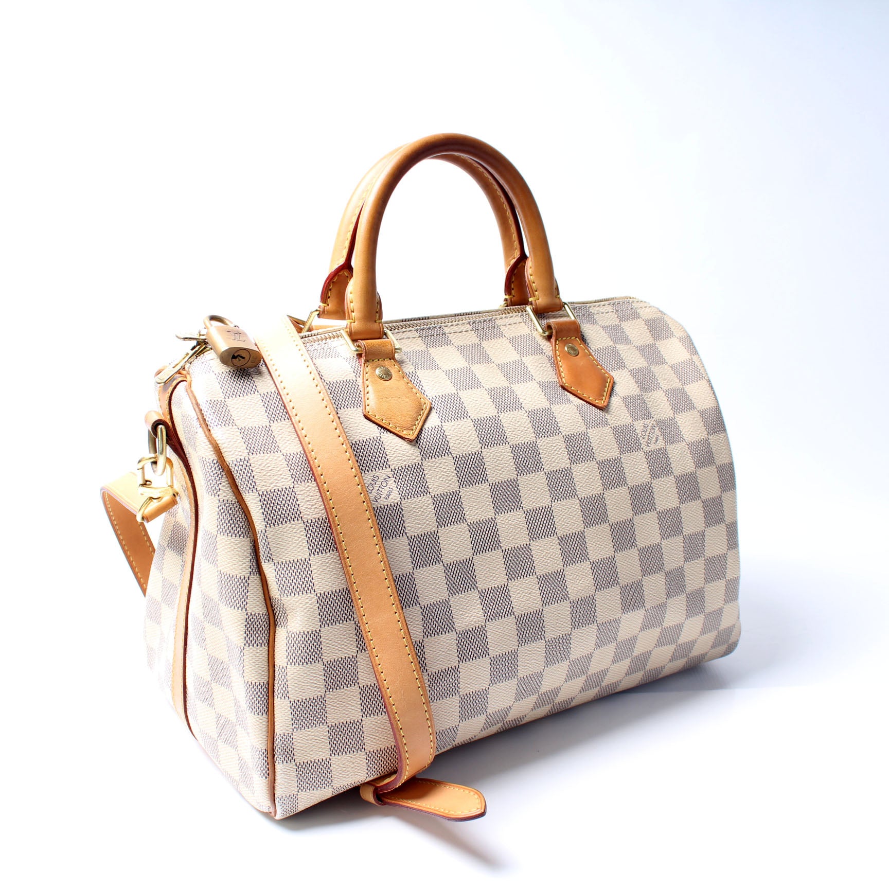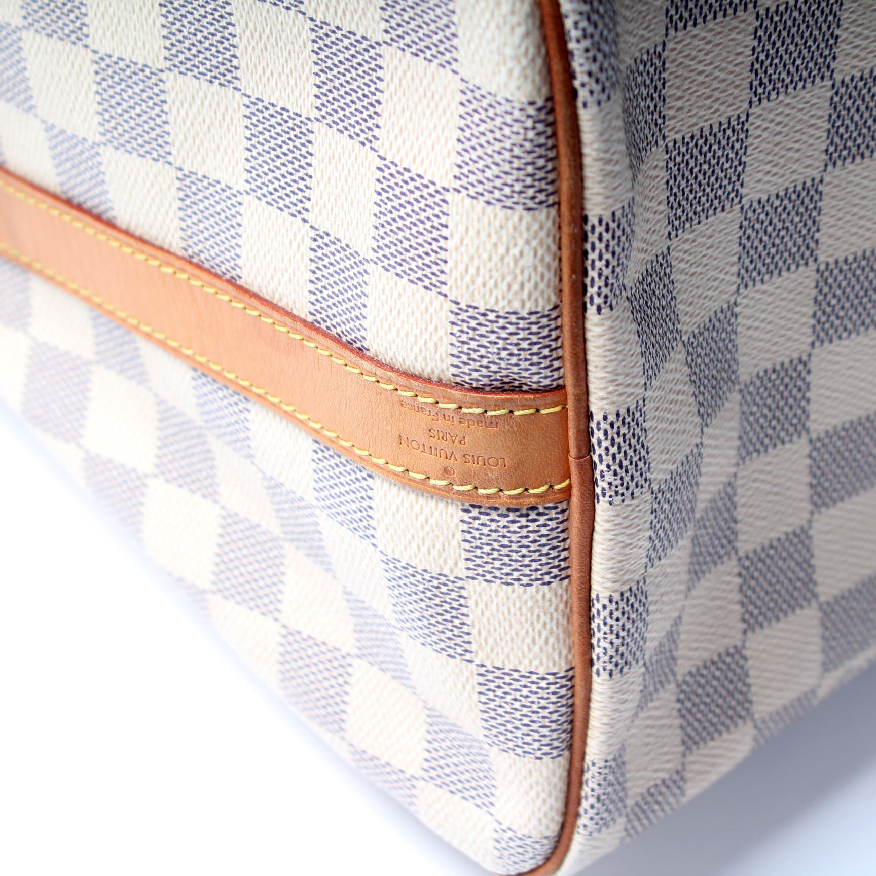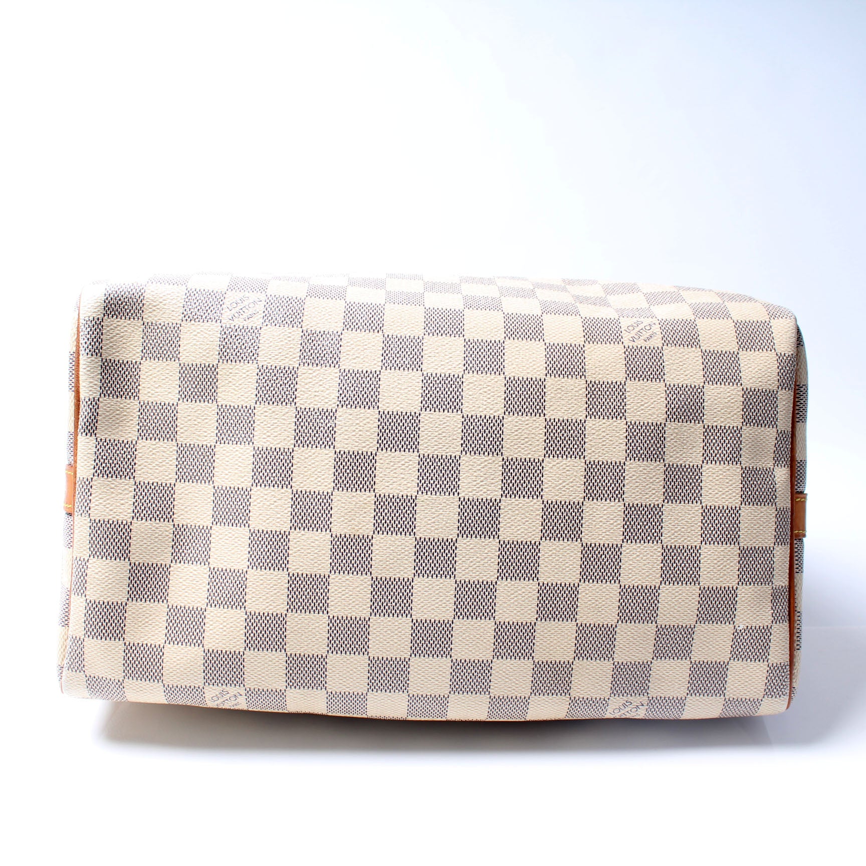 This pre-owned Louis Vuitton Speedy 30 Bandouliere is guaranteed 100% authentic. The exterior is in the classic Damier Azur coated canvas.