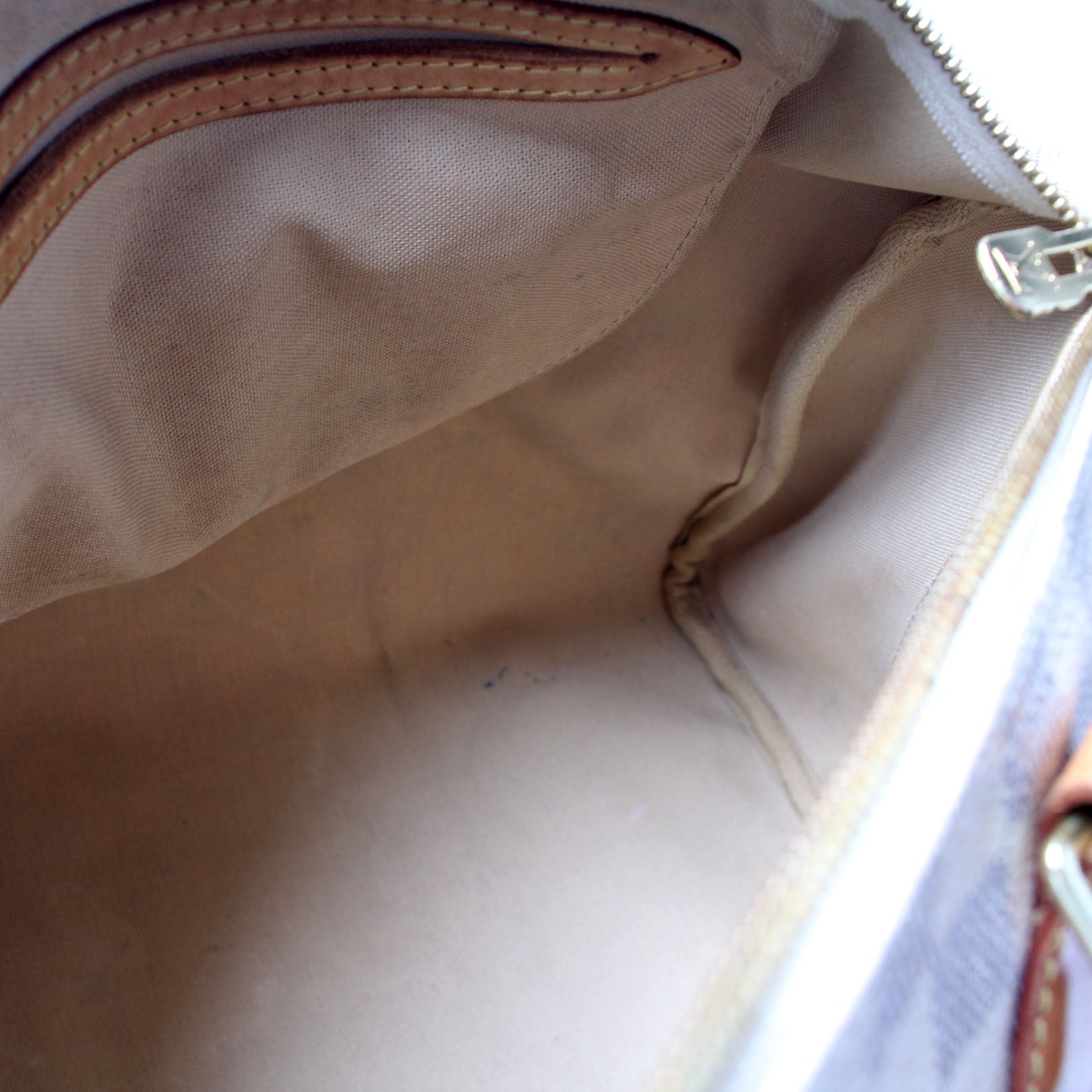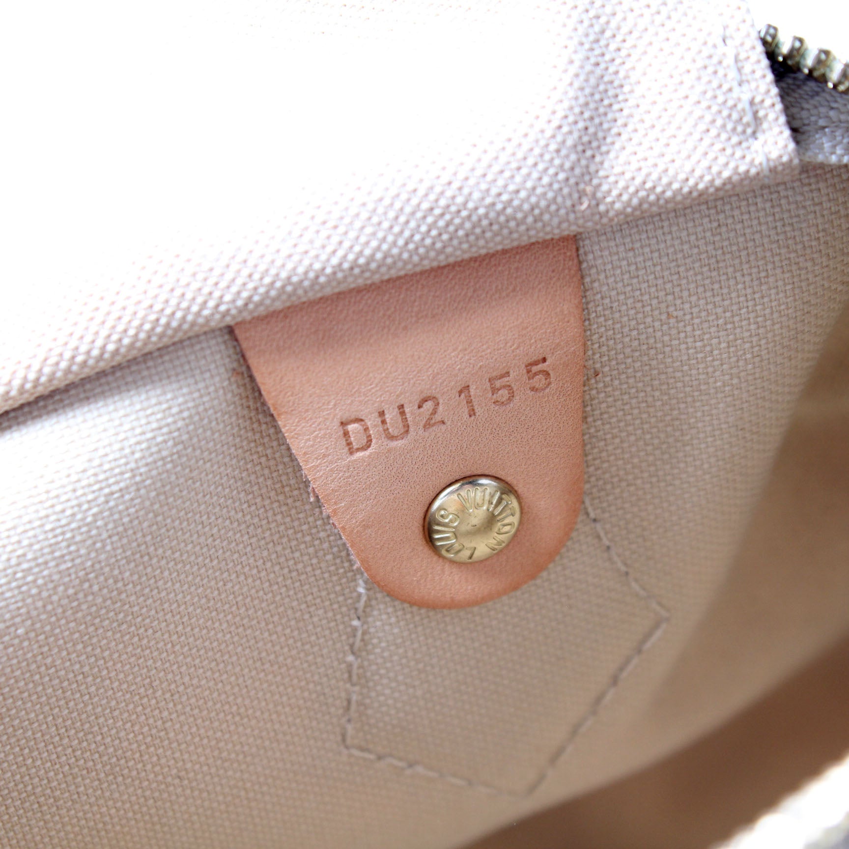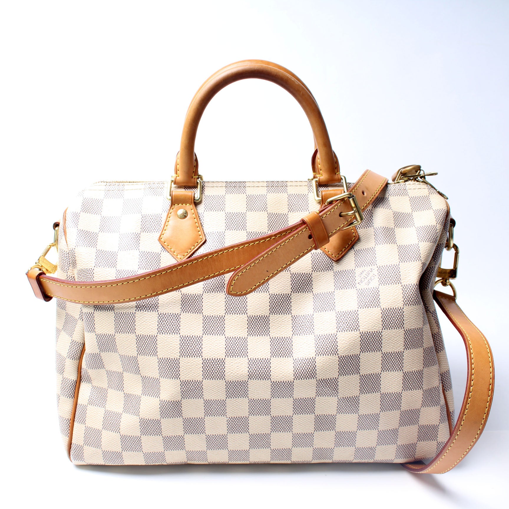 This pre-owned Louis Vuitton Speedy 30 Bandouliere is guaranteed 100% authentic. The exterior is in the classic Damier Azur coated canvas.