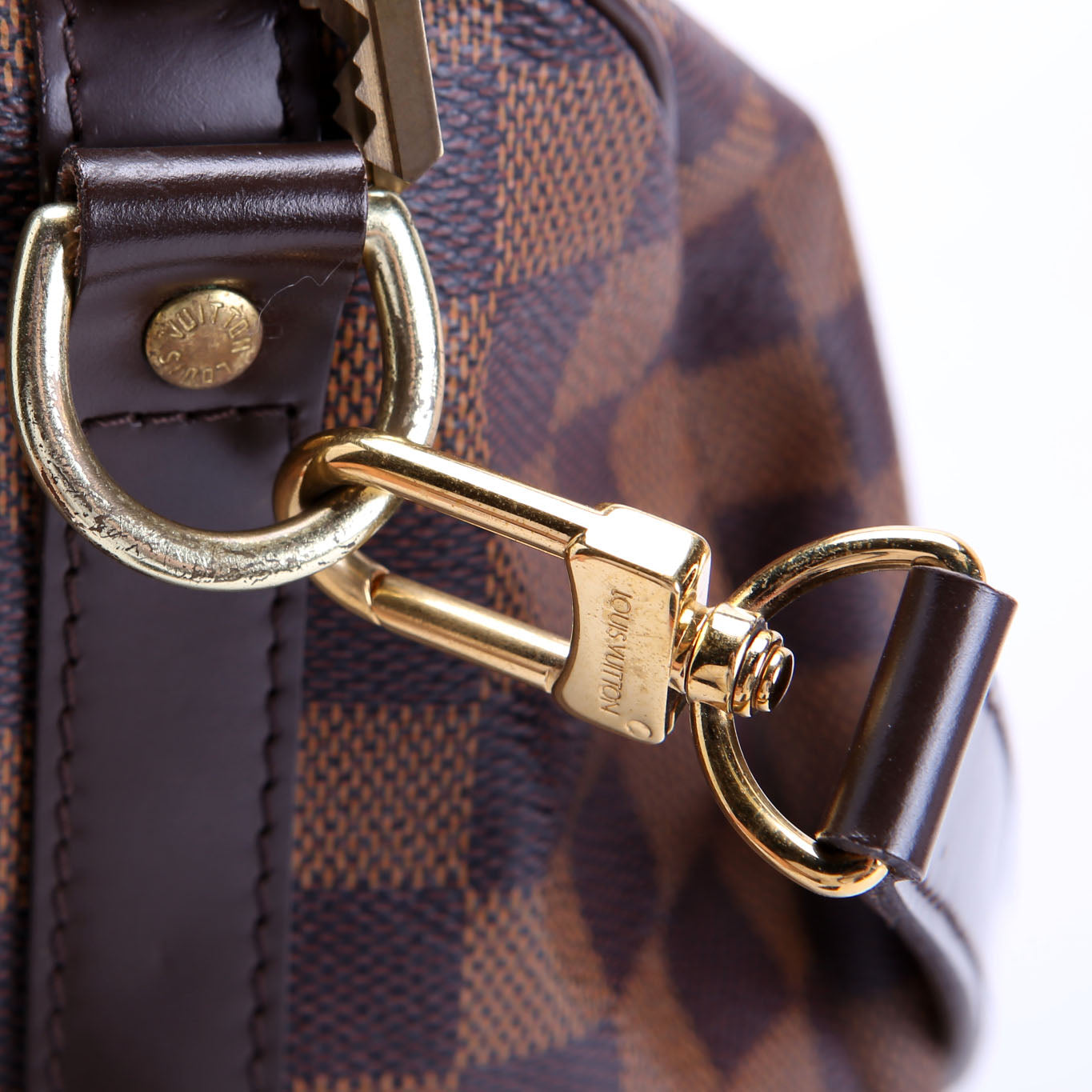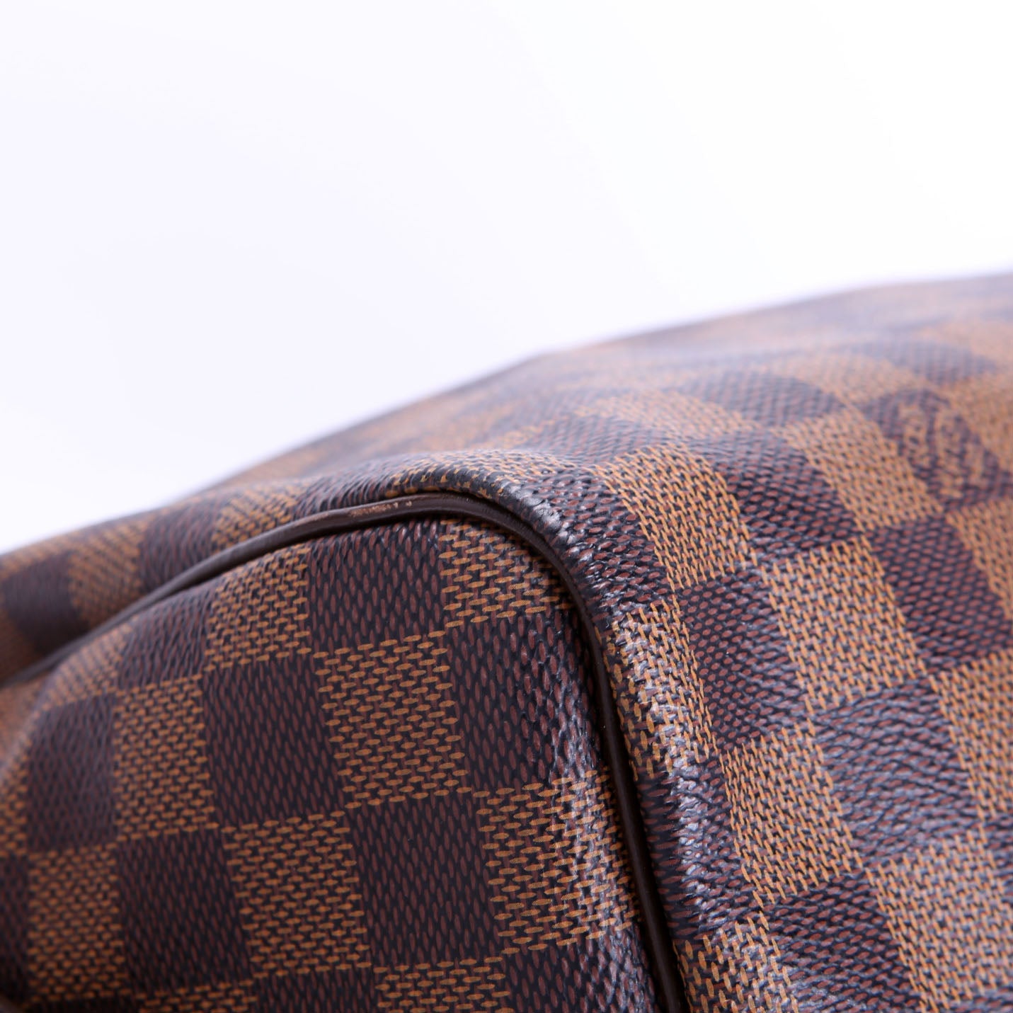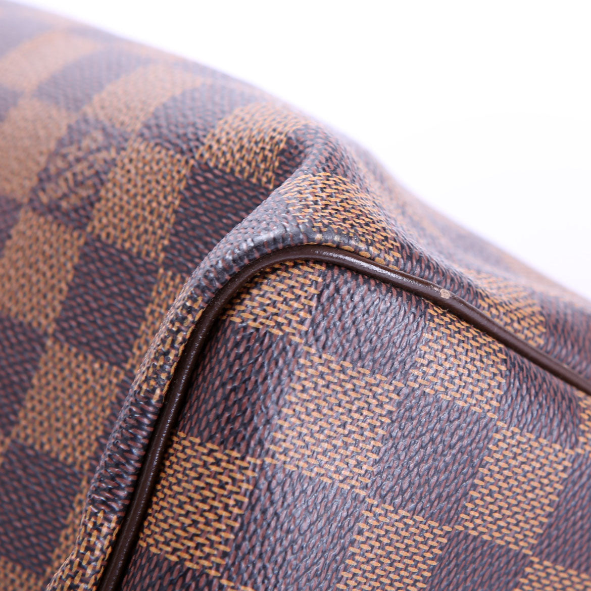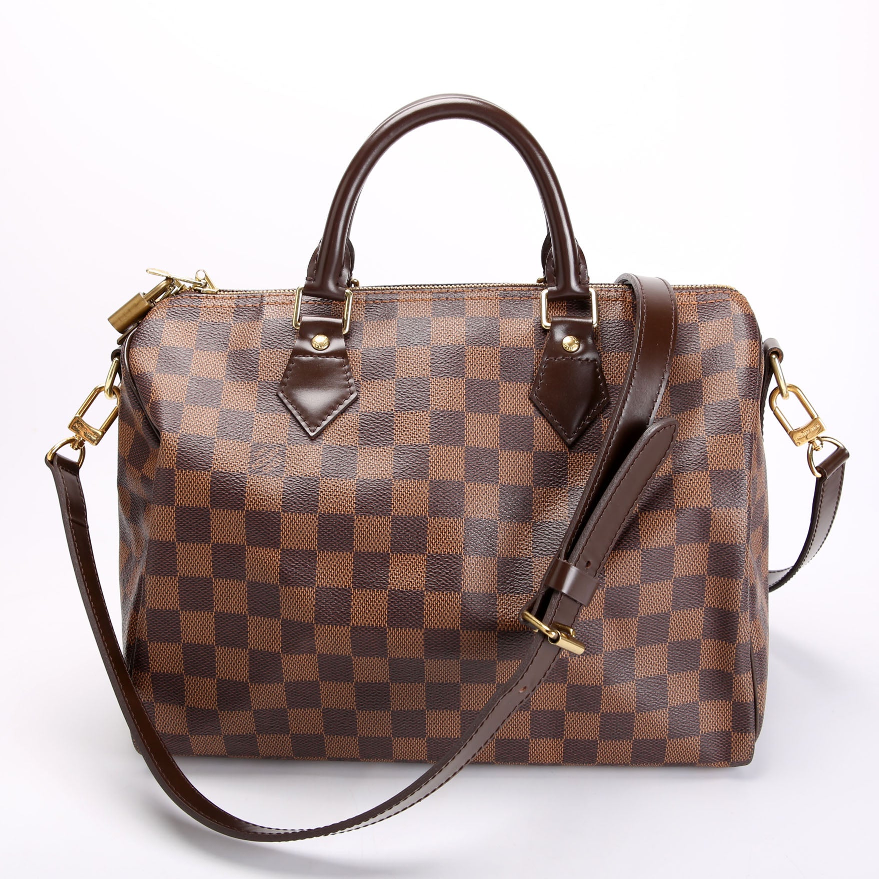 This pre-owned Louis Vuitton Speedy 30 Bandouliere is guaranteed 100% authentic. The exterior is in the classic Louis Vuitton Damier Ebene Coated Canvas.