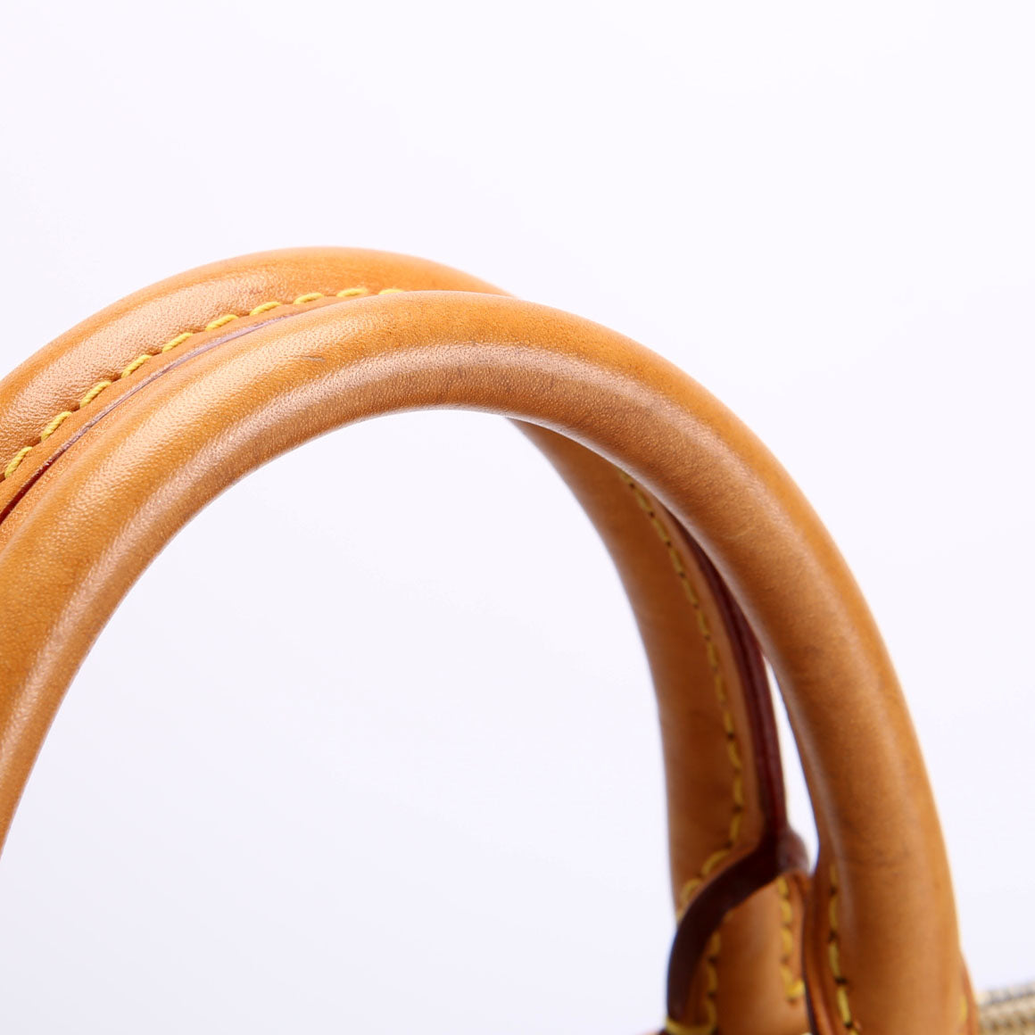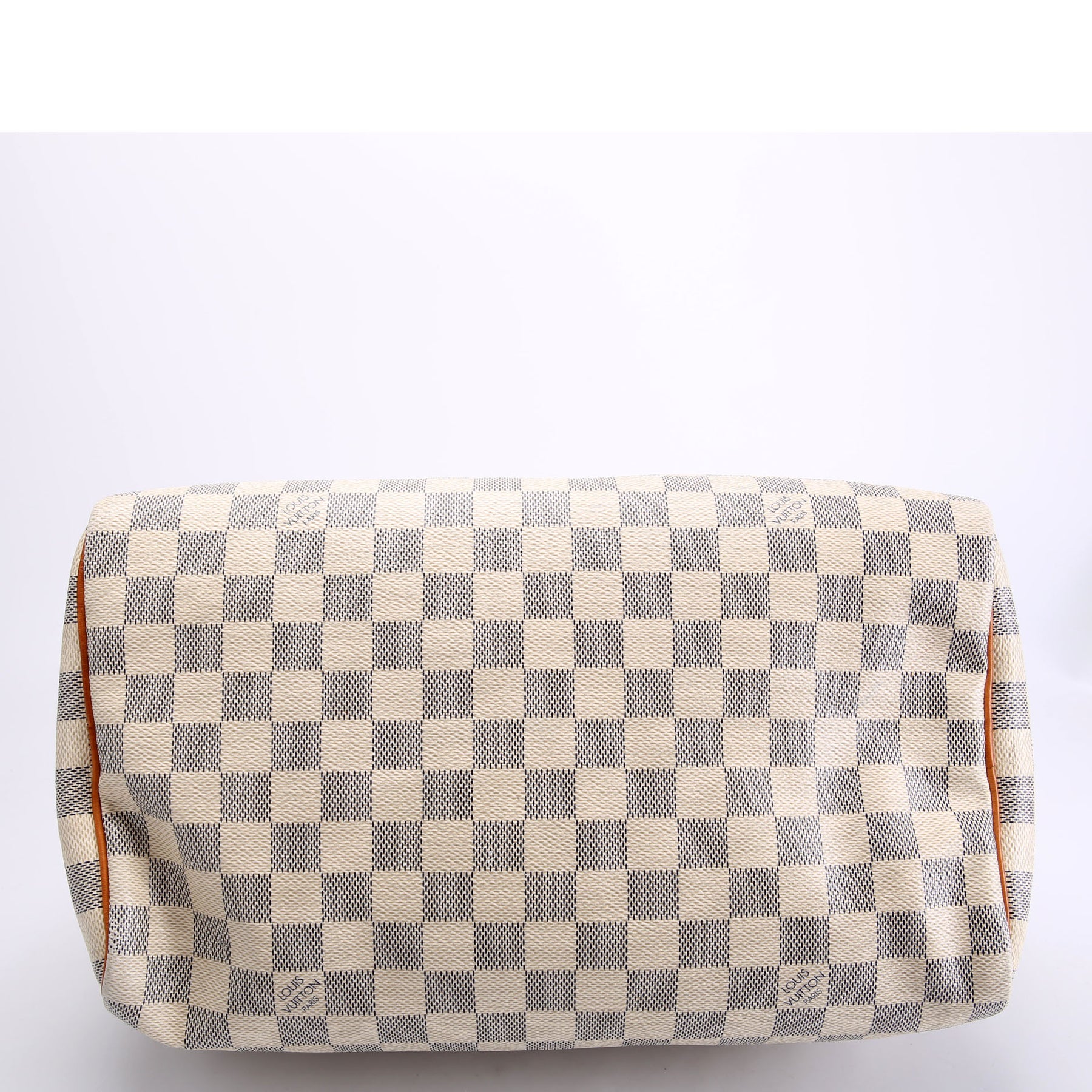 This pre-owned Louis Vuitton Speedy 30 is guaranteed 100% authentic. The exterior is in the classic Louis Vuitton Damier Azur coated canvas.