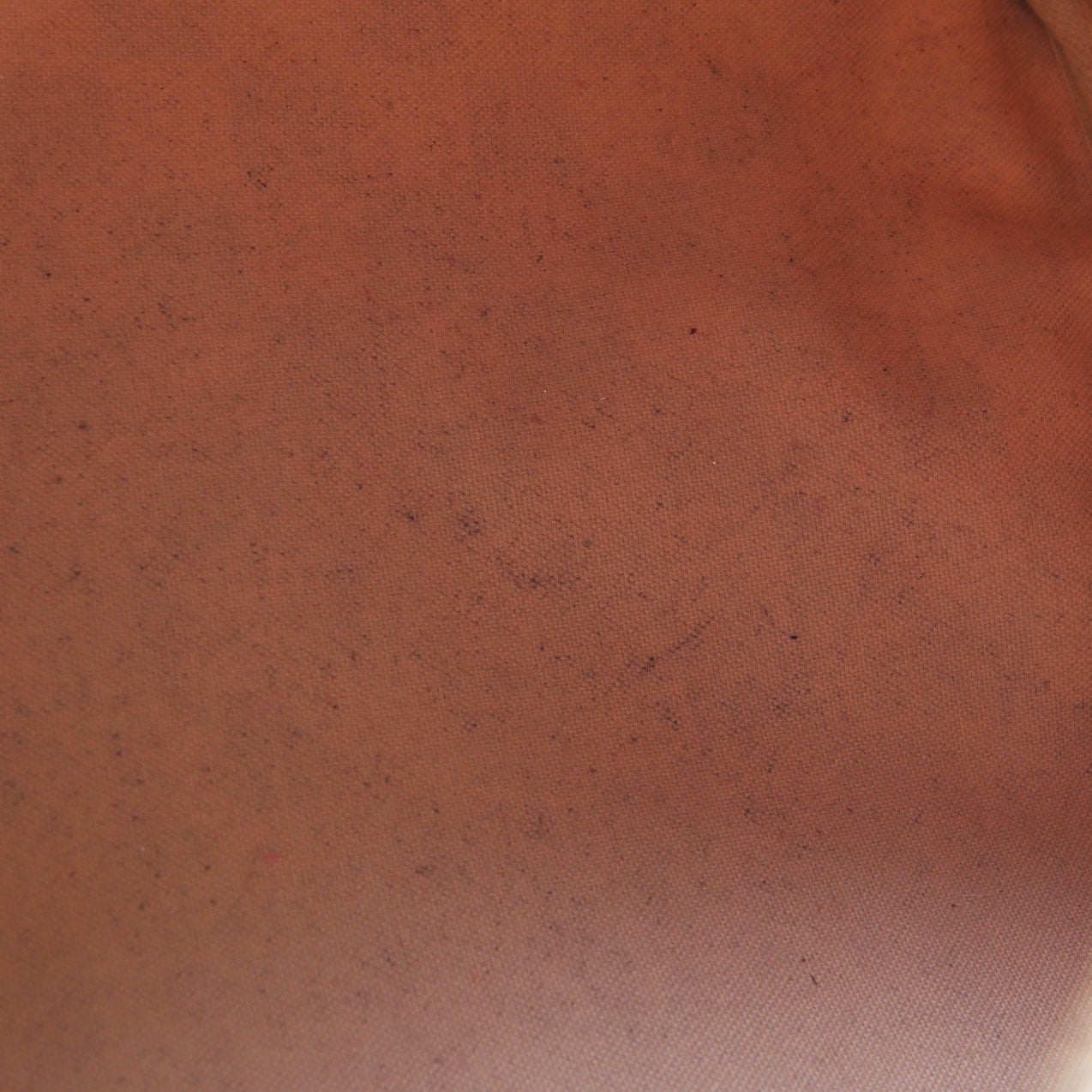 Exterior: The exterior coated canvas shows light discoloration throughout. The leather piping shows heavy discoloration and wear.