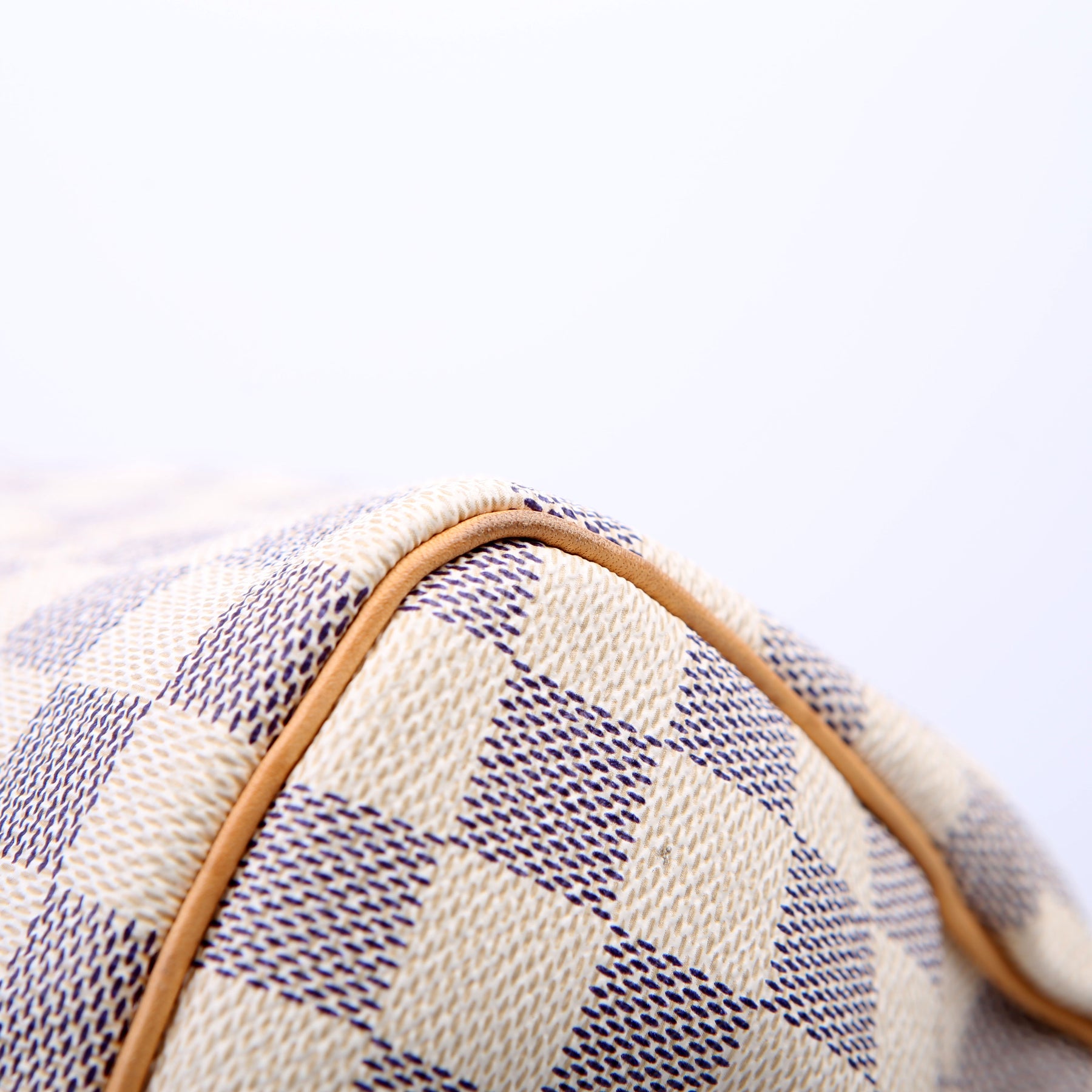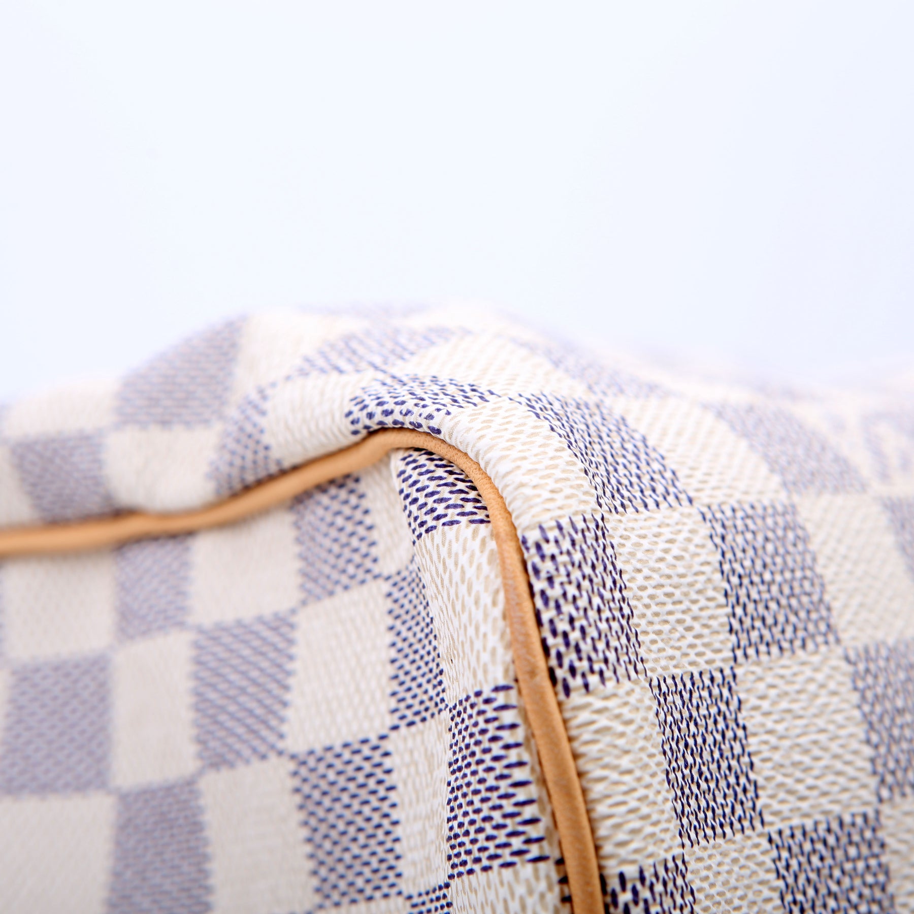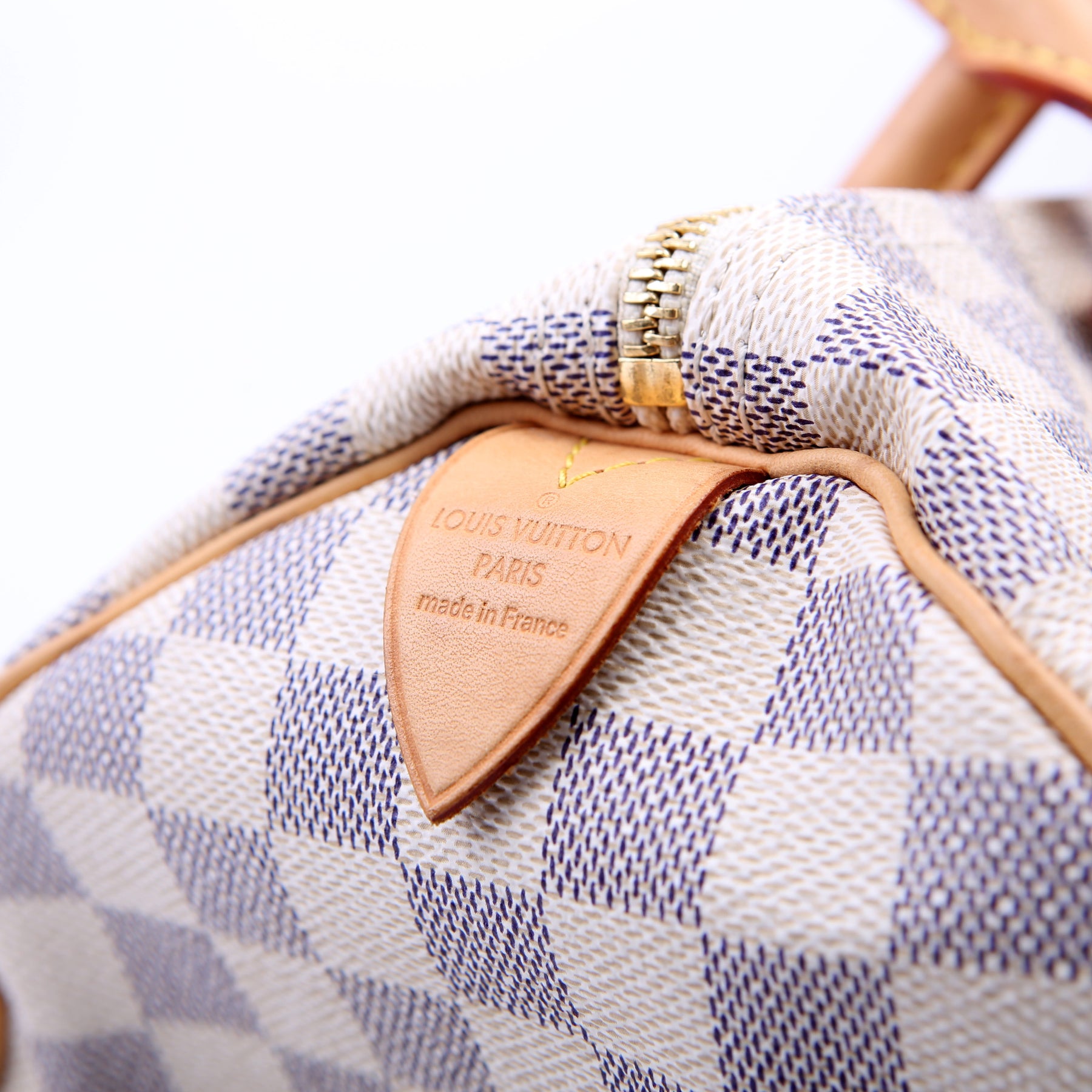 This pre-owned Louis Vuitton Speedy 30 is guaranteed 100% authentic. The exterior is in the classic Louis Vuitton Damier Azur coated canvas.