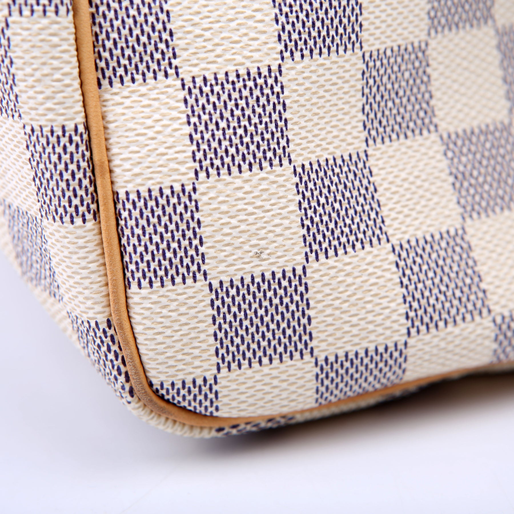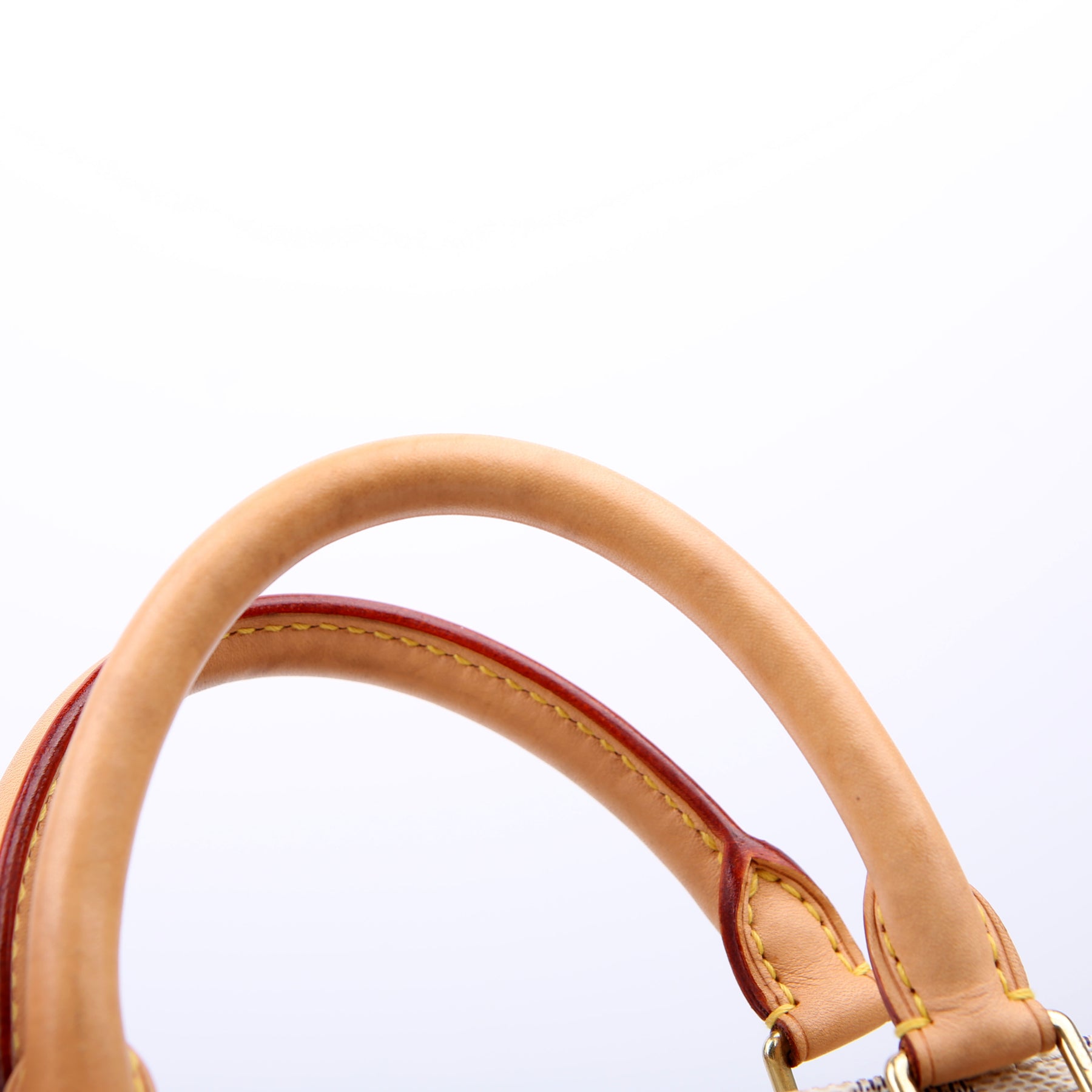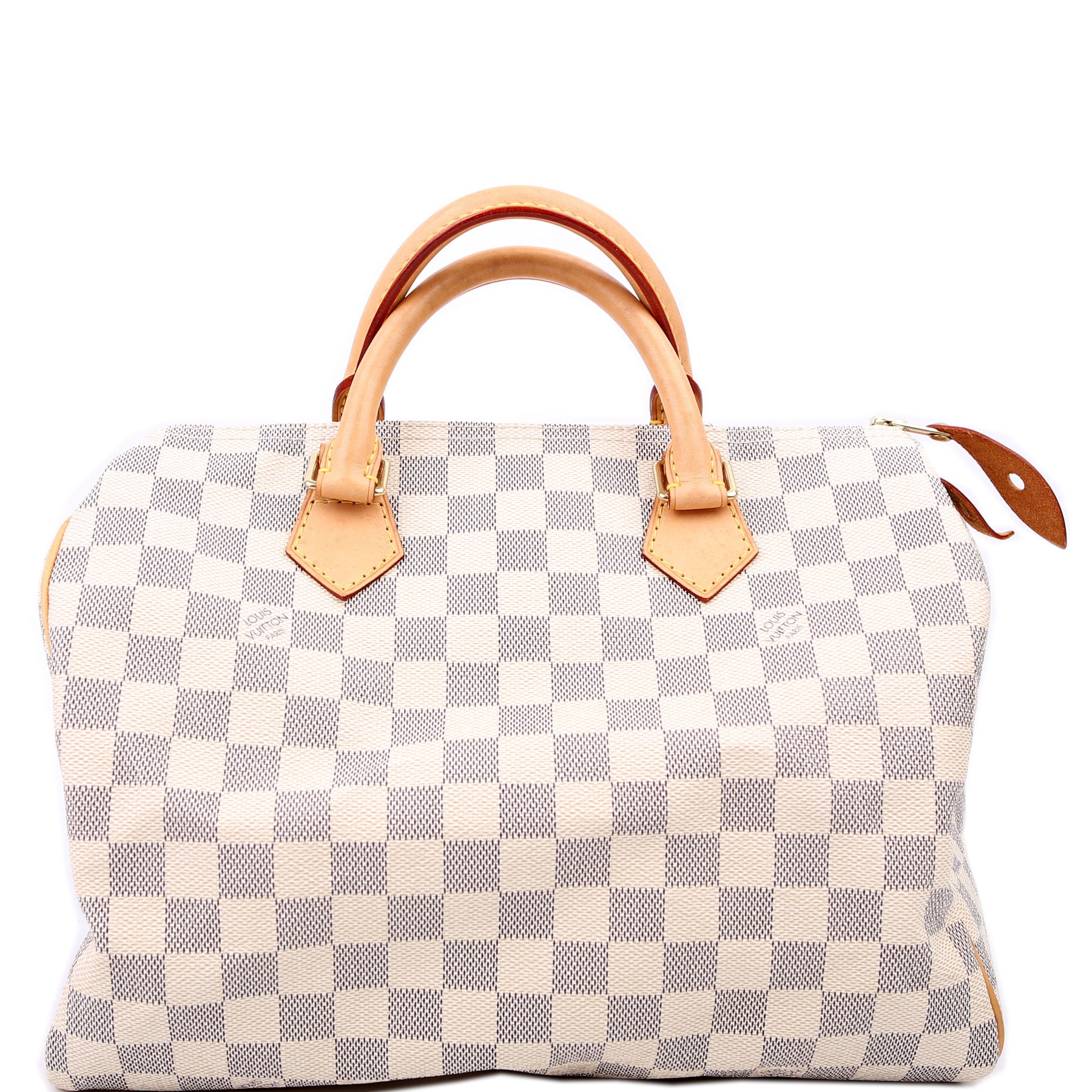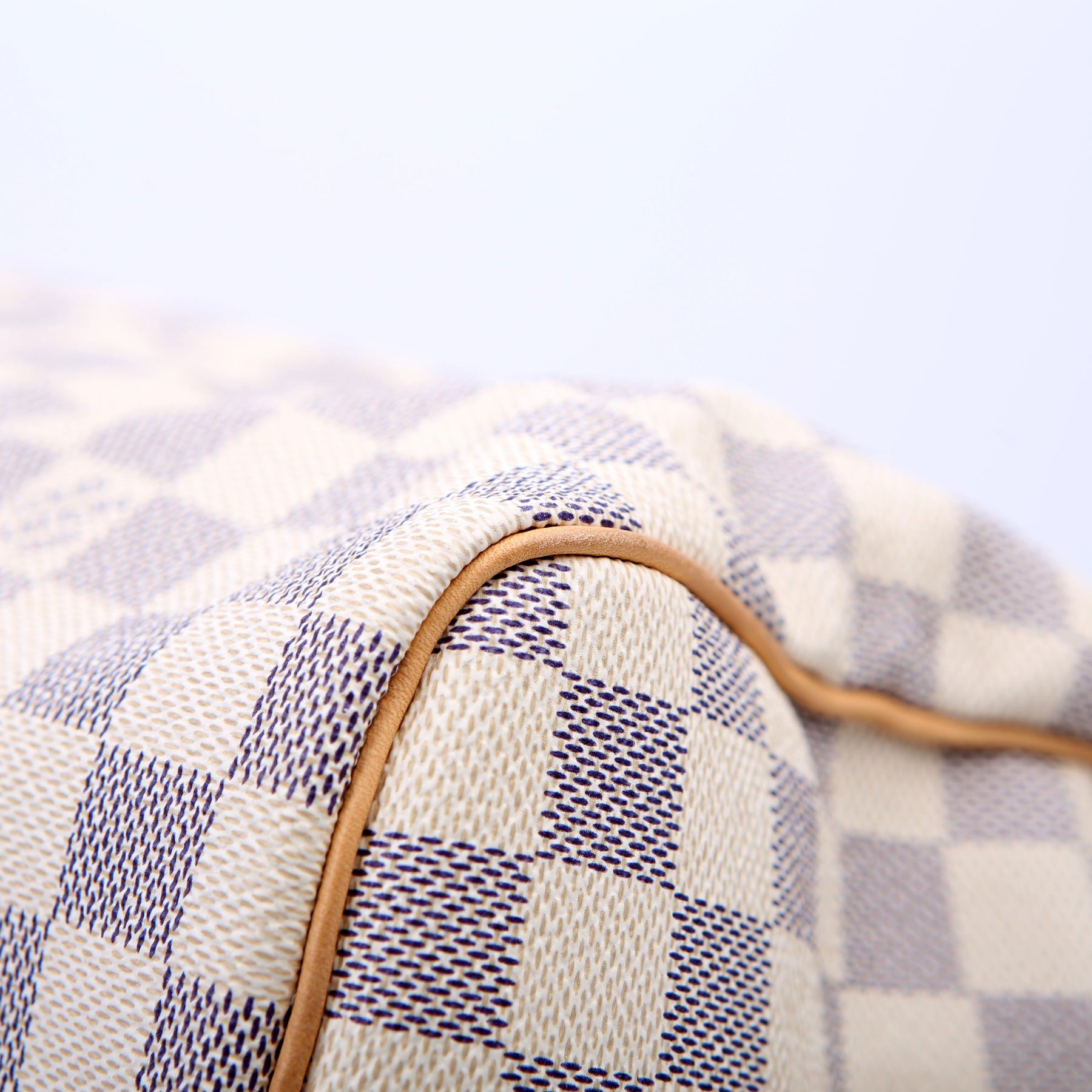 This pre-owned Louis Vuitton Speedy 30 is guaranteed 100% authentic. The exterior is in the classic Louis Vuitton Damier Azur coated canvas.