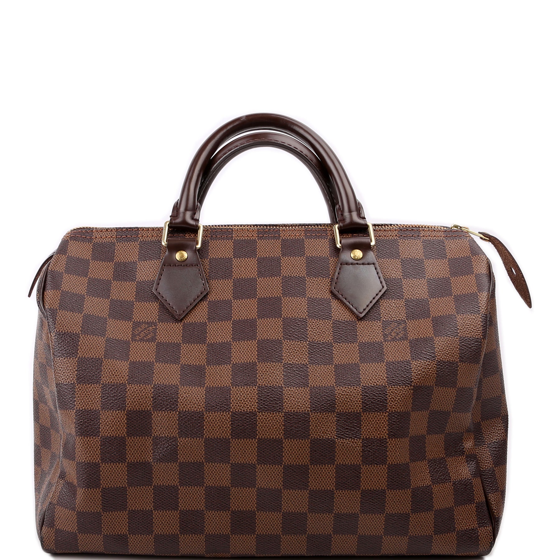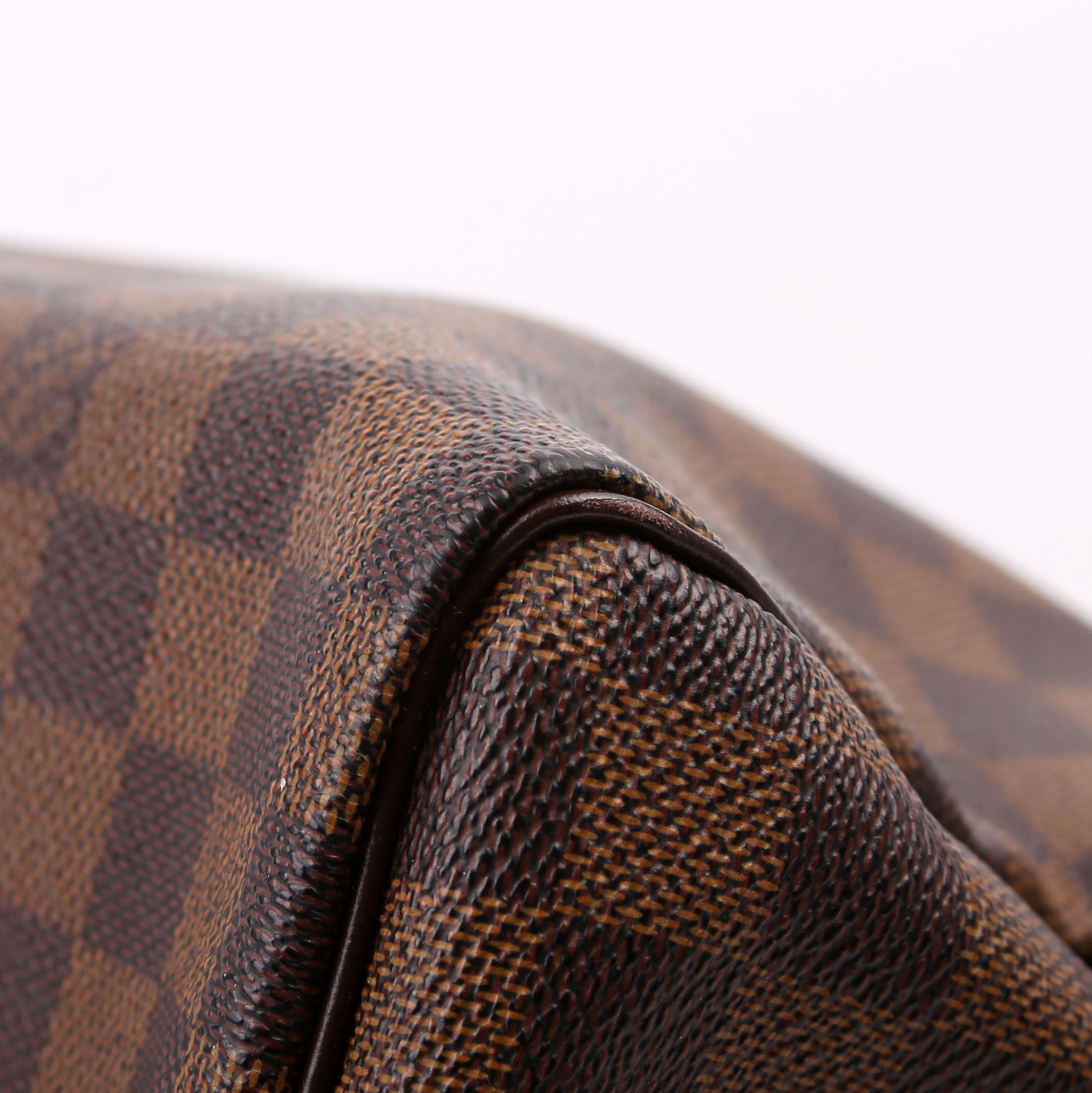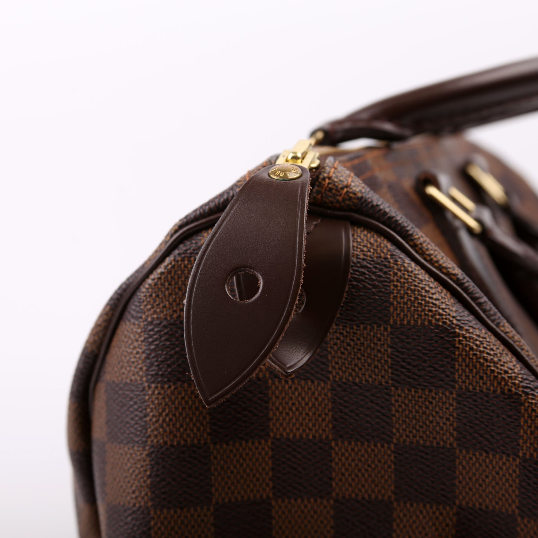 This pre-owned Louis Vuitton Speedy 30 is guaranteed 100% authentic. The exterior is in the classic Louis Vuitton Damier Ebene coated canvas.