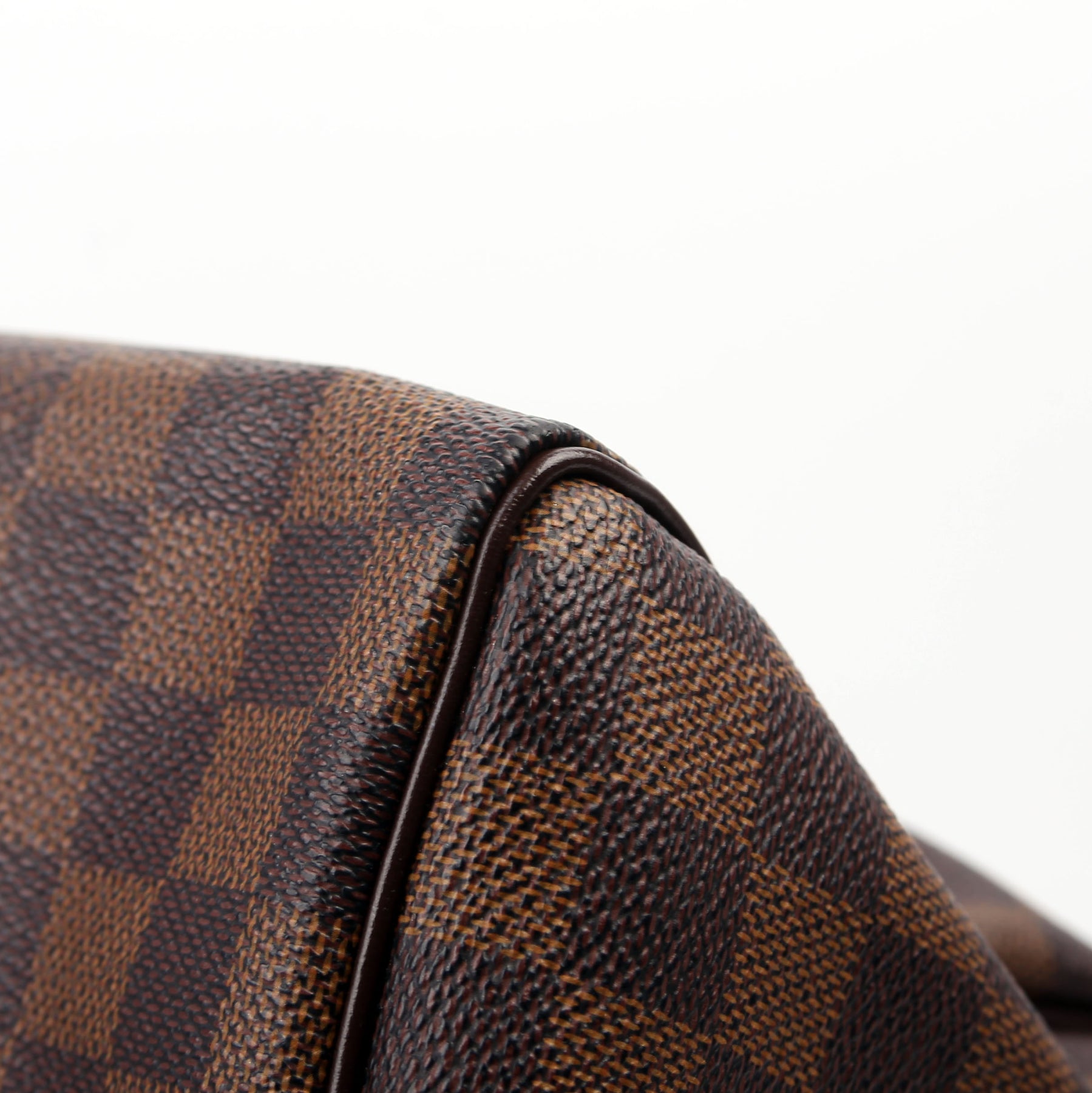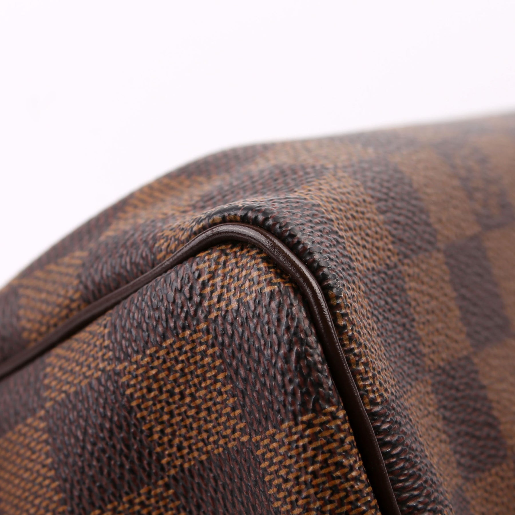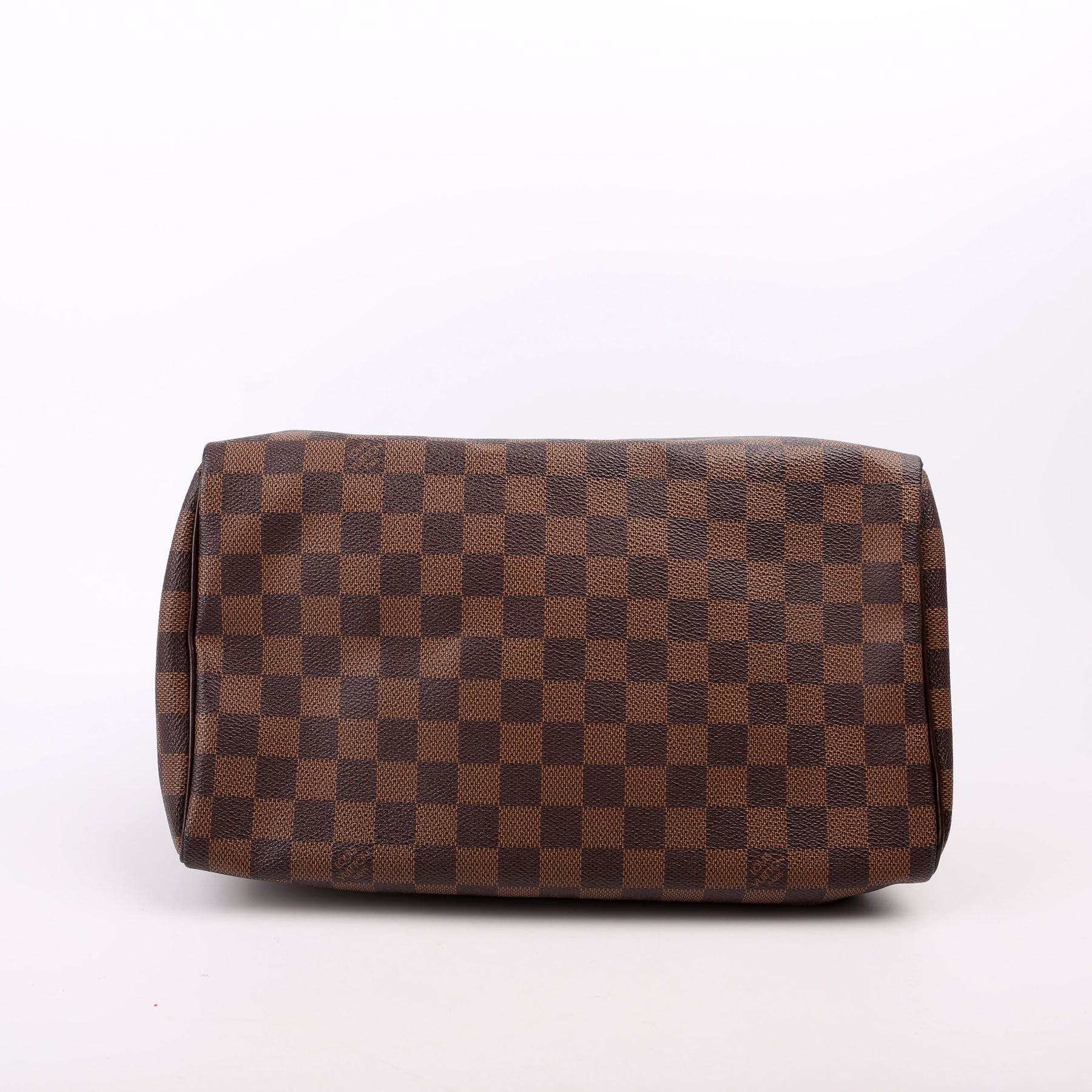 This pre-owned Louis Vuitton Speedy 30 is guaranteed 100% authentic. The exterior is in the classic Louis Vuitton Damier Ebene coated canvas.