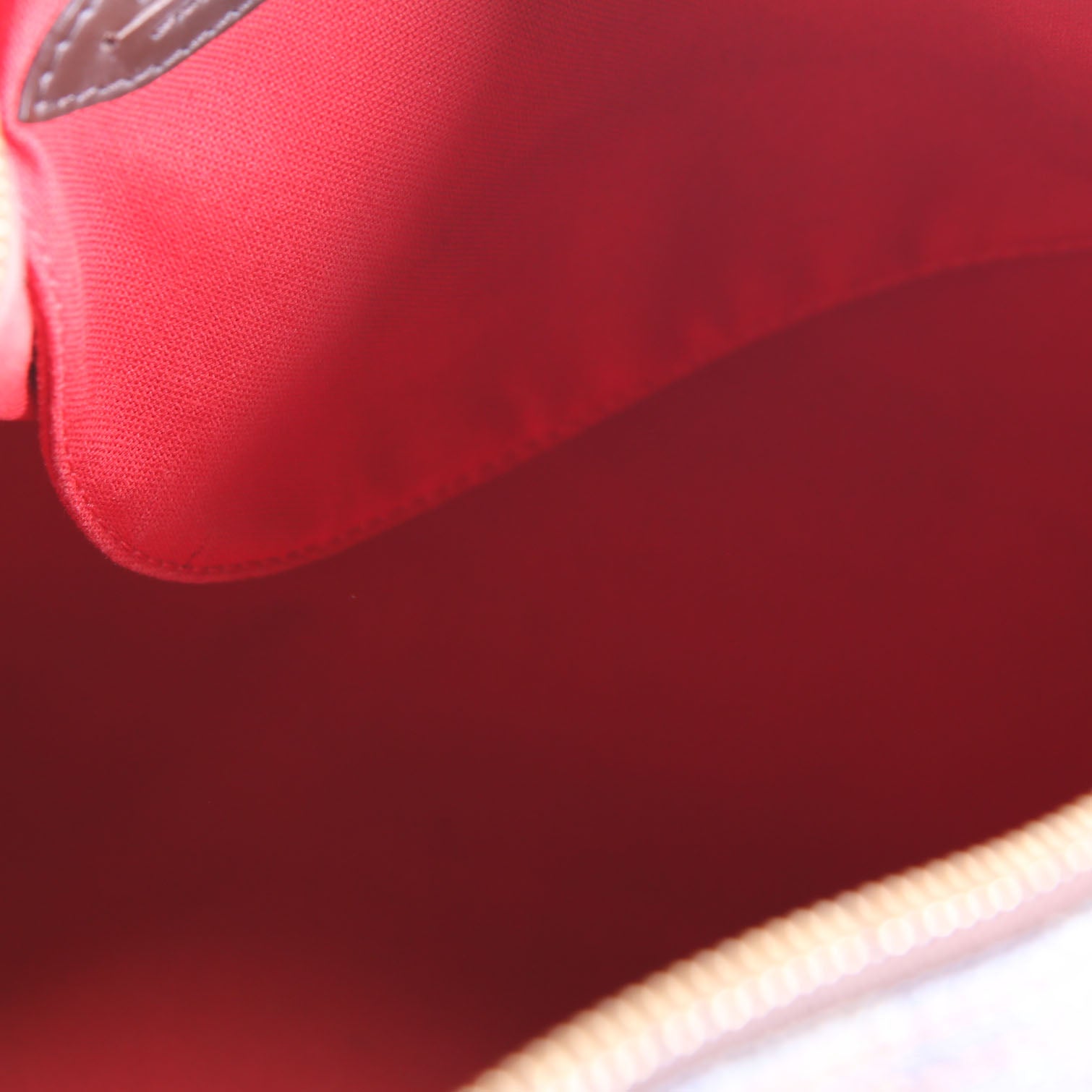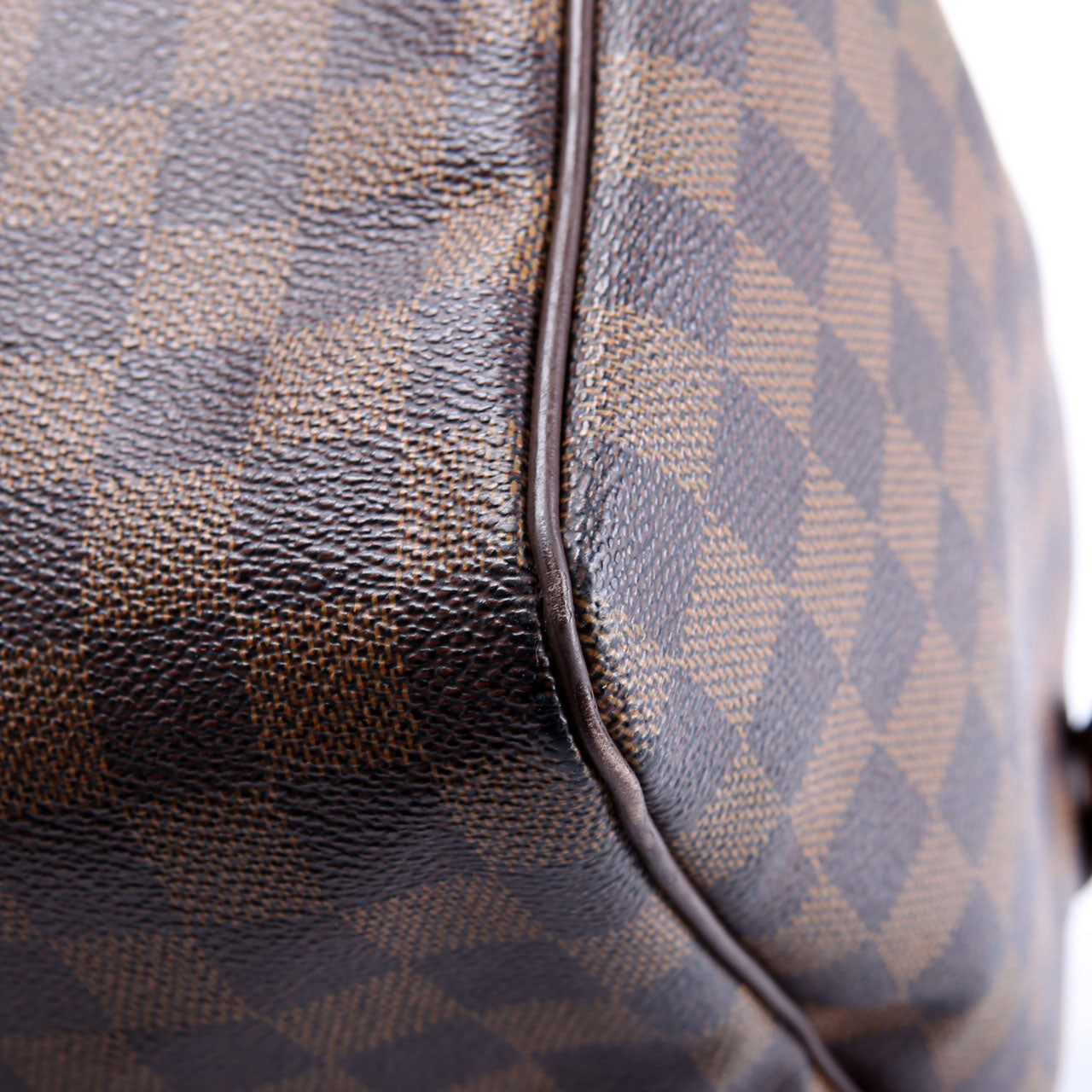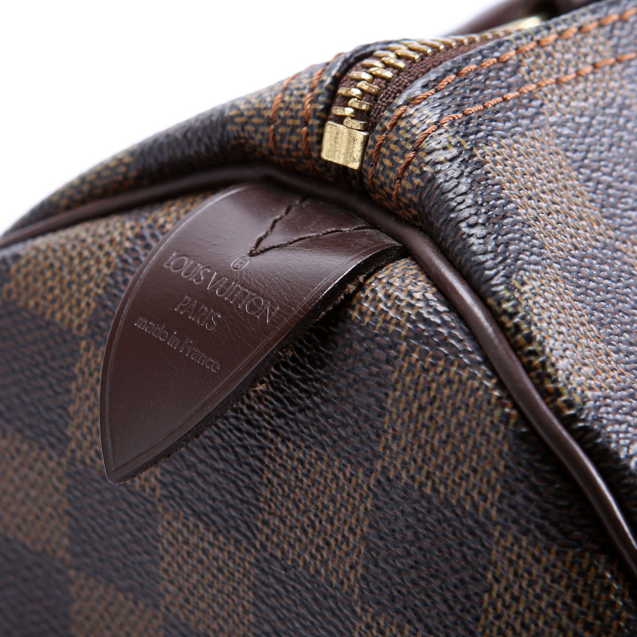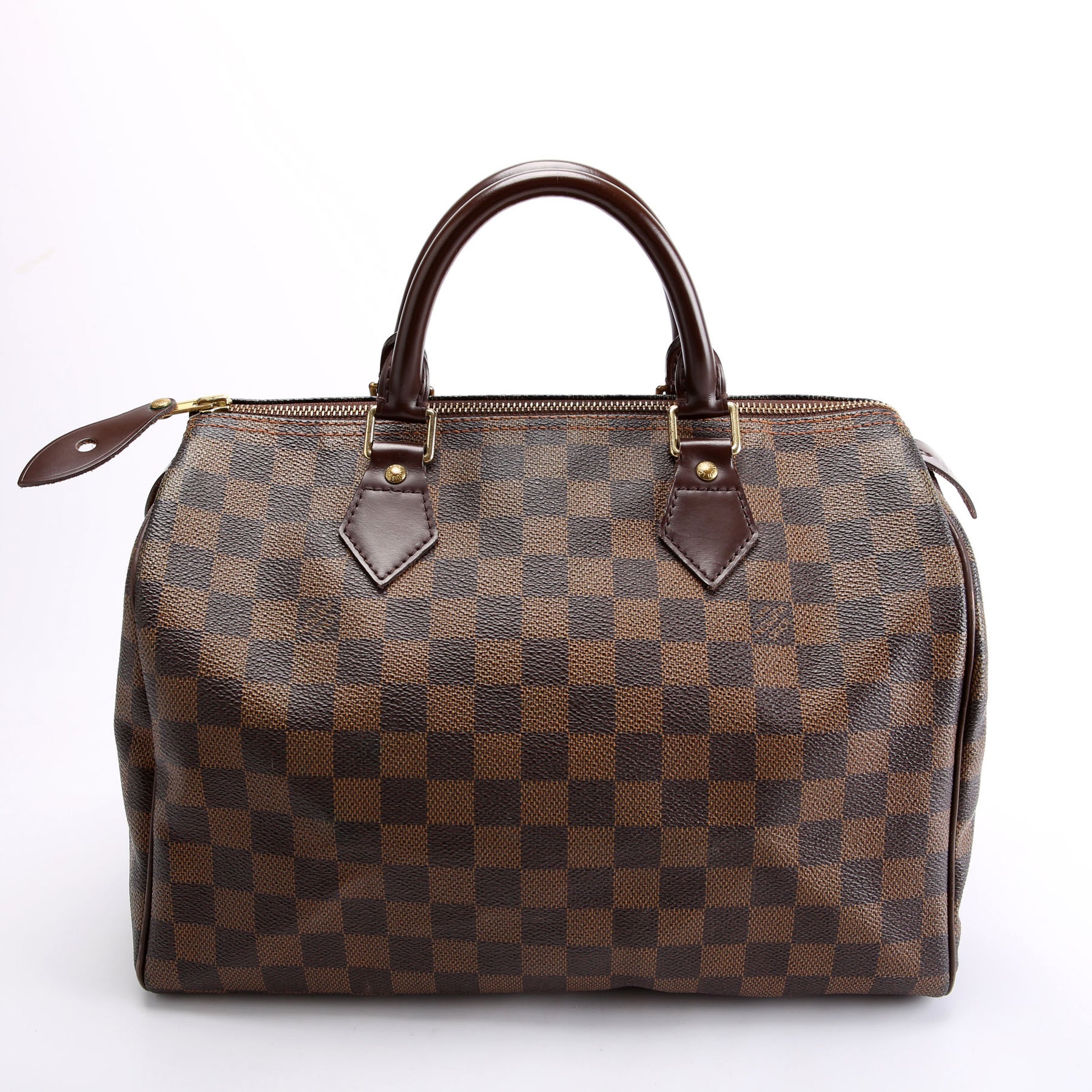 This pre-owned Louis Vuitton Speedy 30 is guaranteed 100% authentic. The exterior is in the classic Louis Vuitton Damier Ebene Coated Canvas.