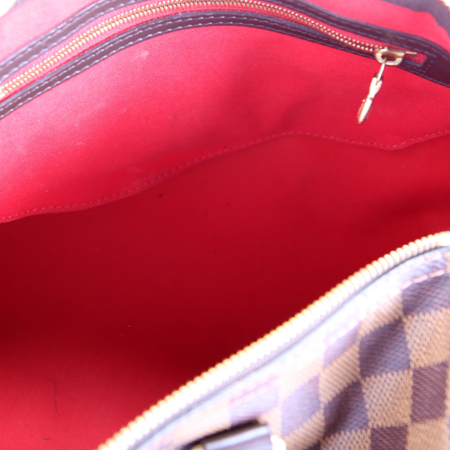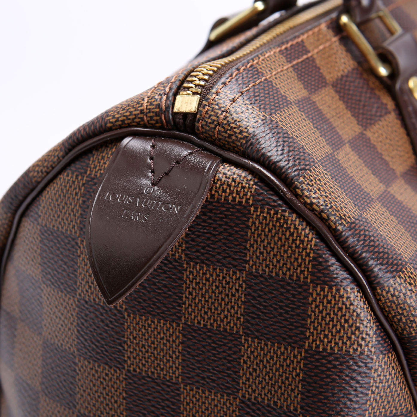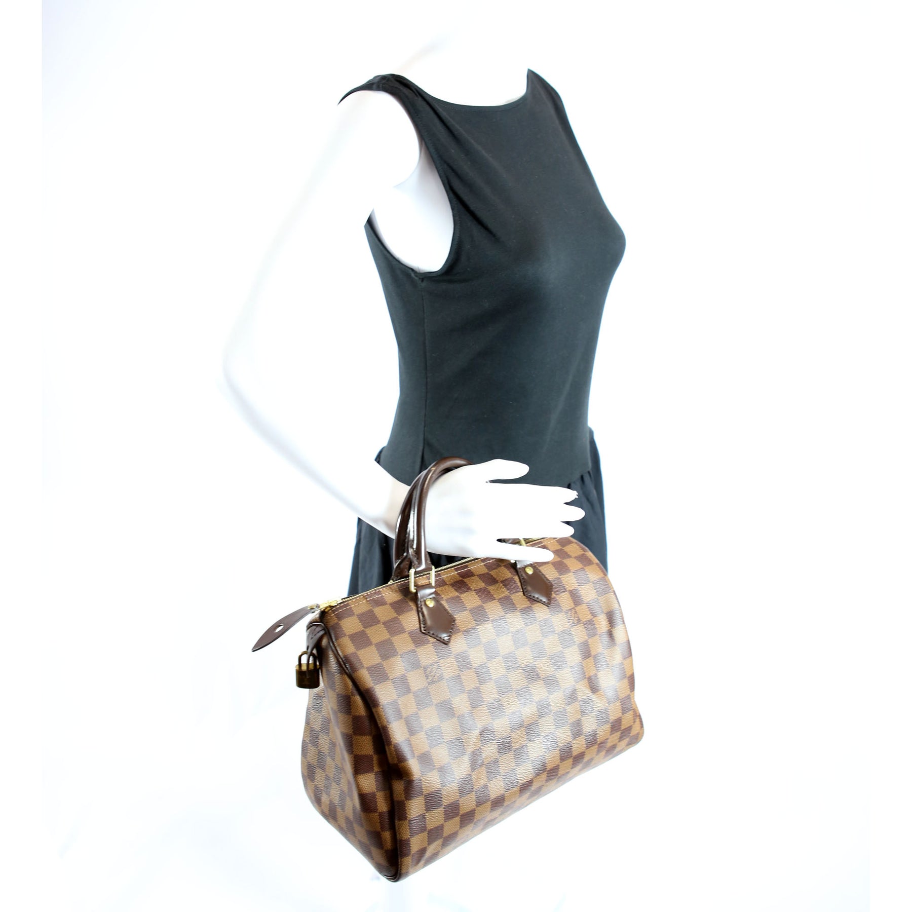 This pre-owned Louis Vuitton Speedy 30 is guaranteed 100% authentic. The exterior is in the classic Louis Vuitton Damier Ebene Coated Canvas.