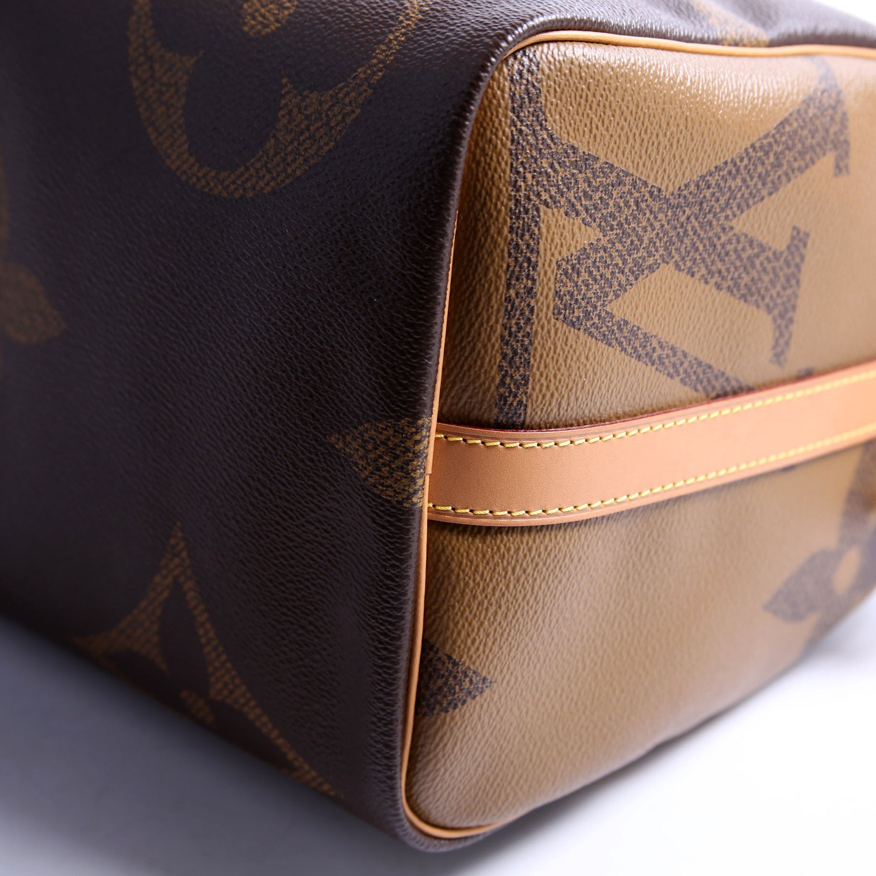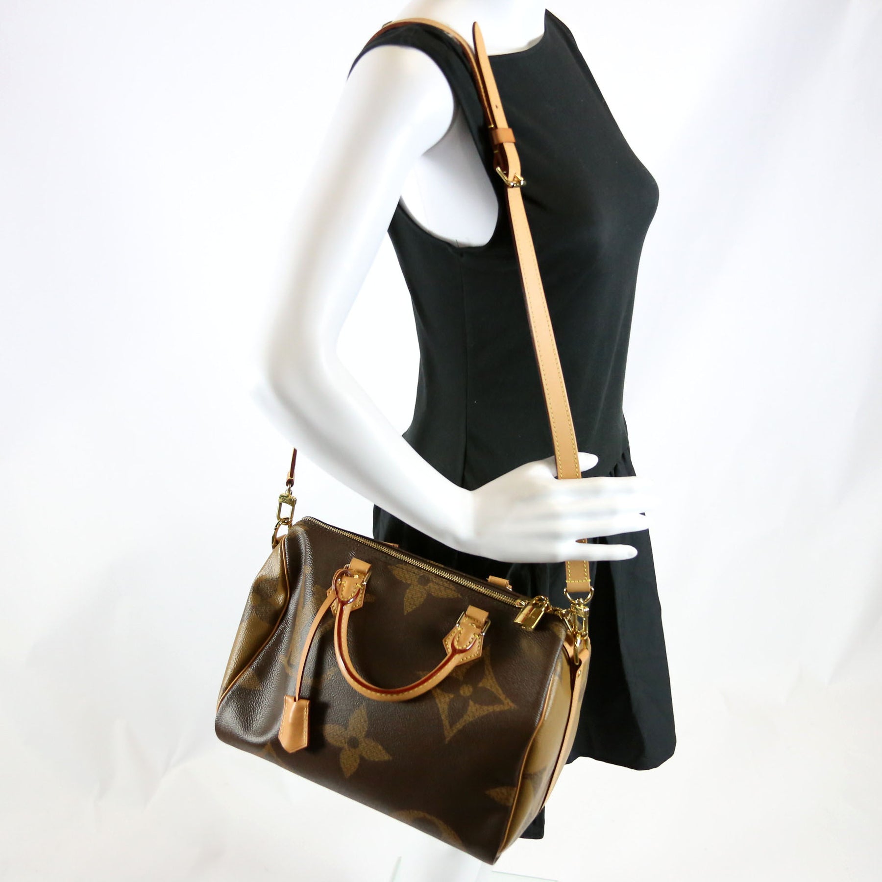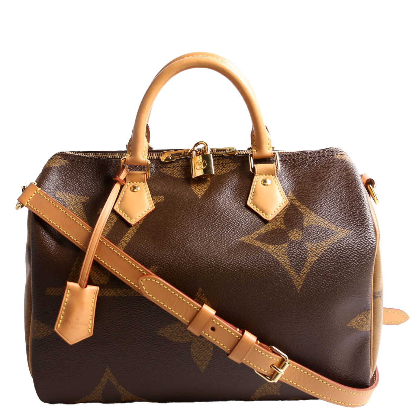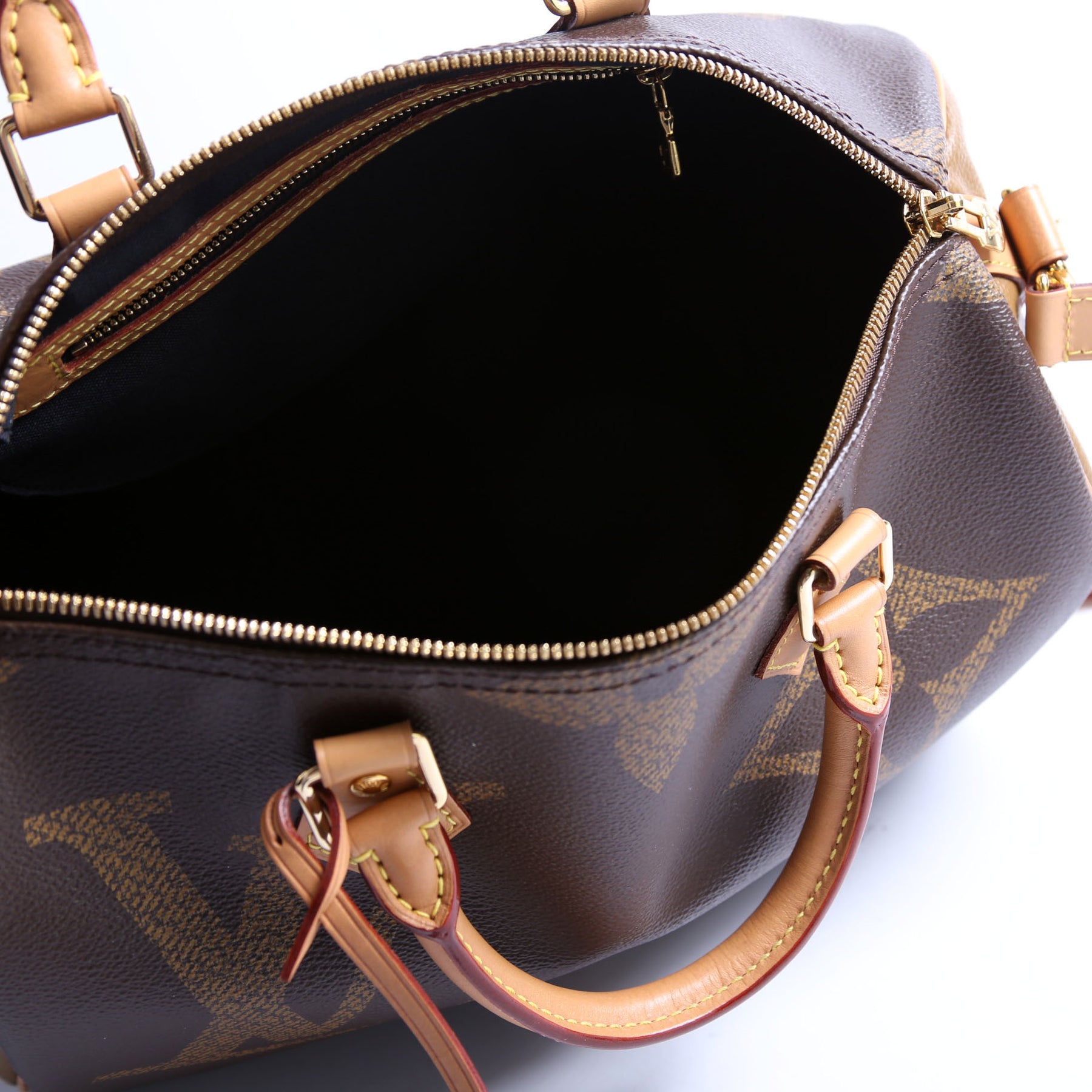 This pre-owned Louis Vuitton Speedy 30 With Strap is guaranteed 100% authentic. The exterior is in the classic Louis Vuitton Giant Reversed Monogram coated canvas.