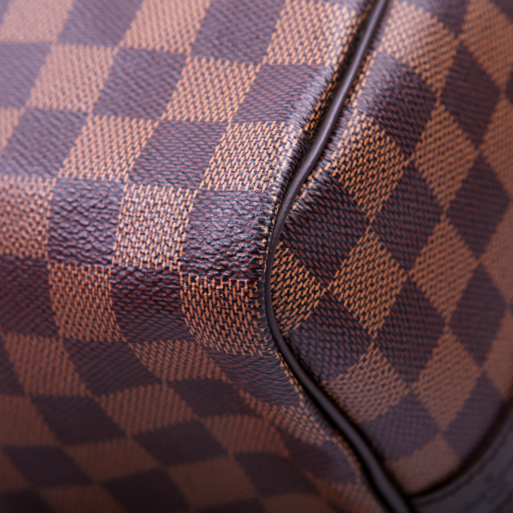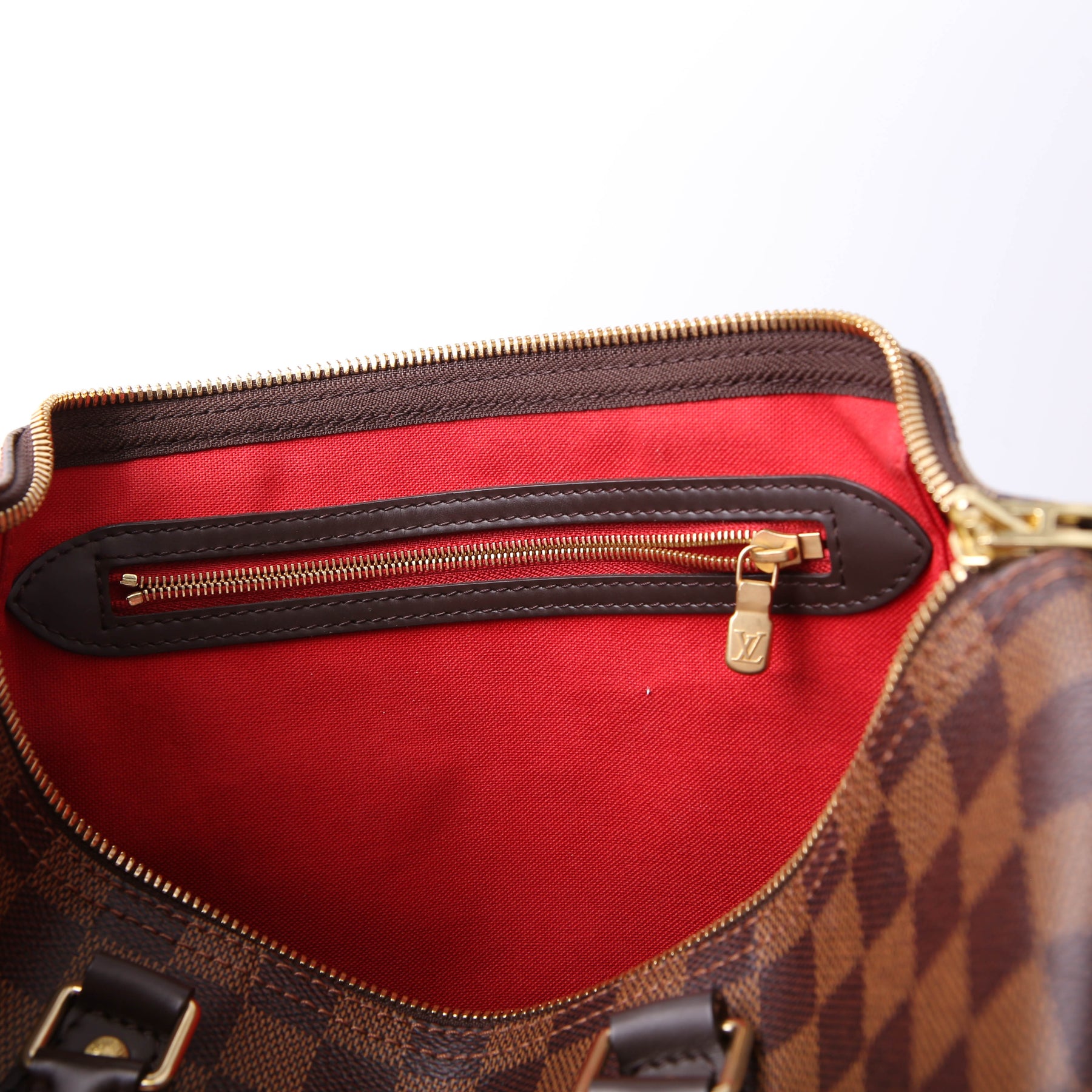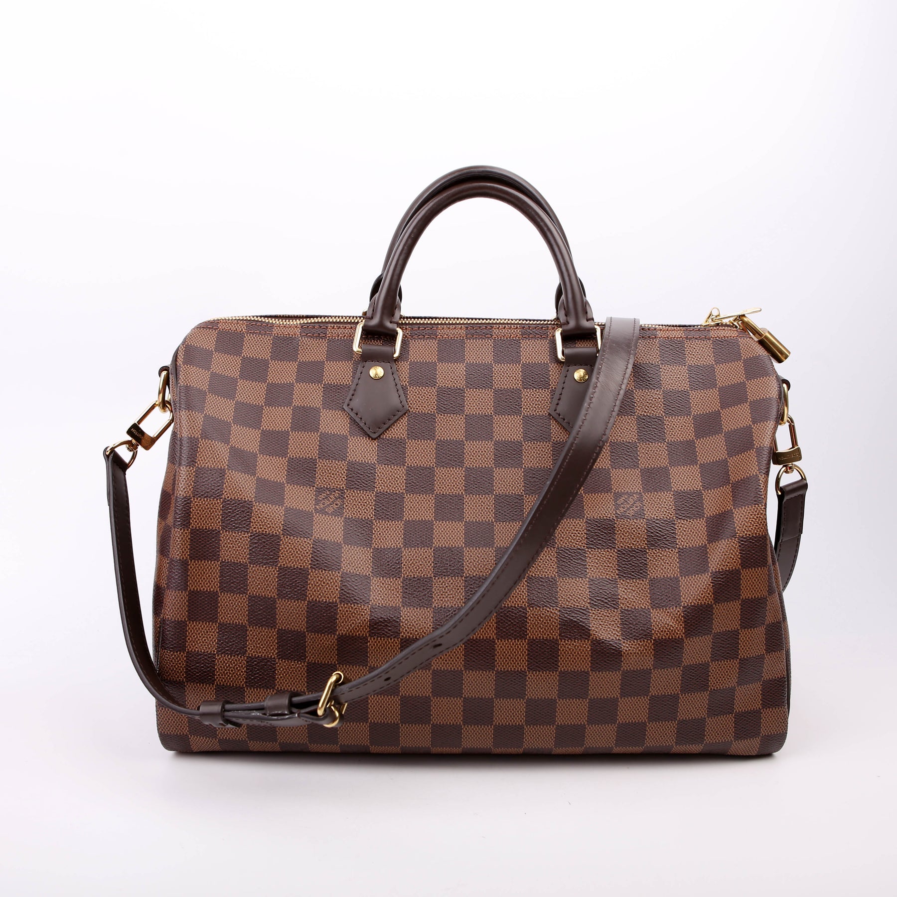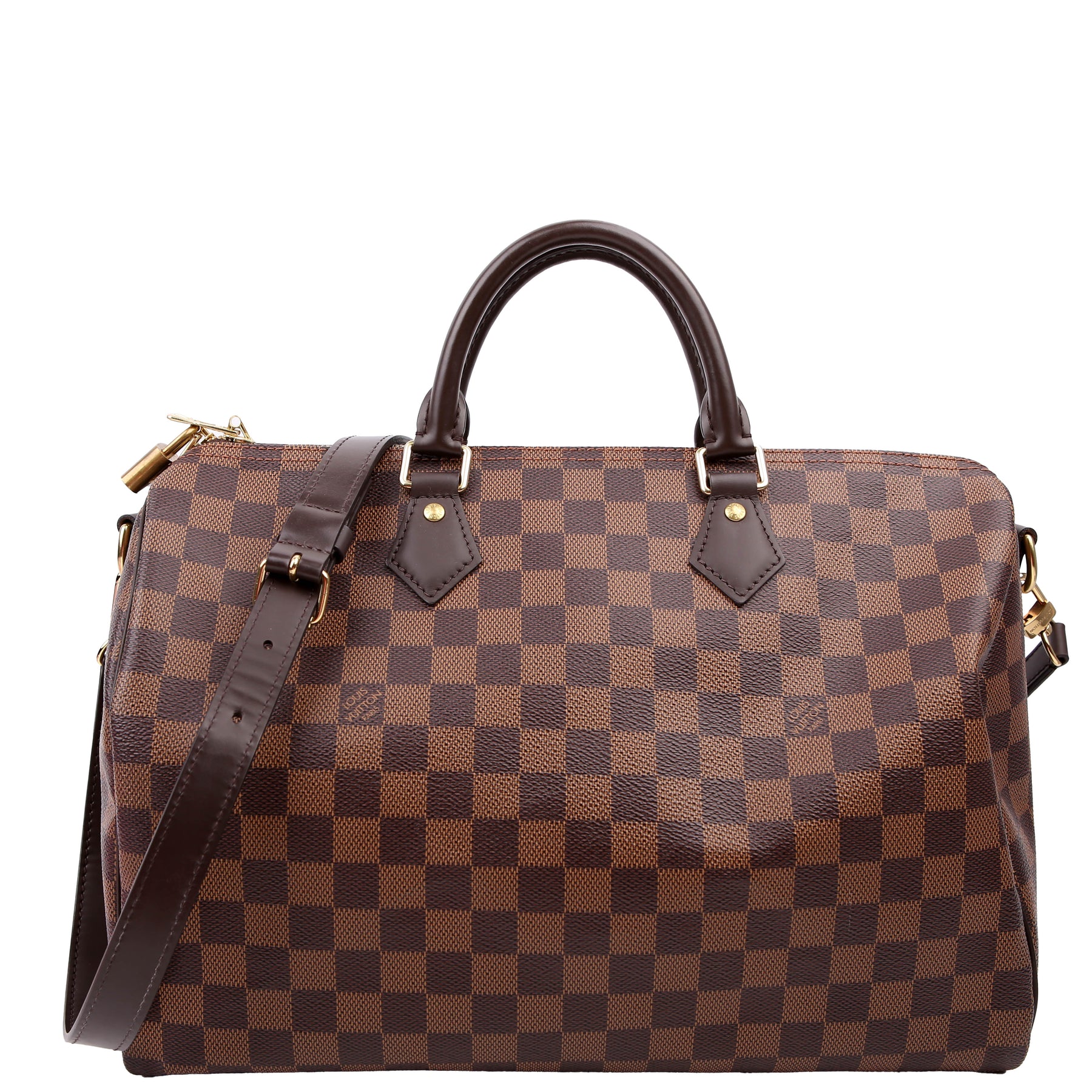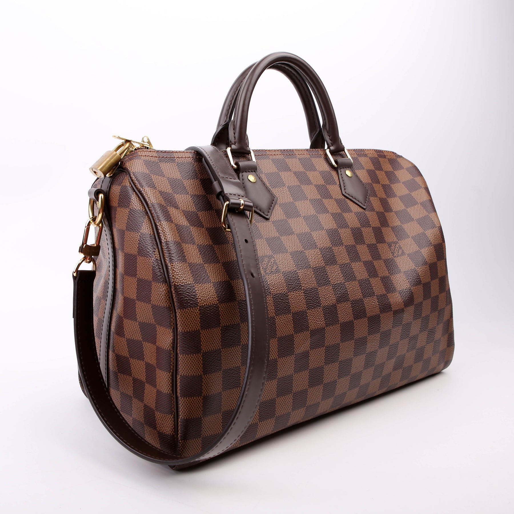 This pre-owned Louis Vuitton Speedy 35 Bandouliere is guaranteed 100% authentic. The exterior is in the classic Louis Vuitton Damier Ebene coated canvas.
