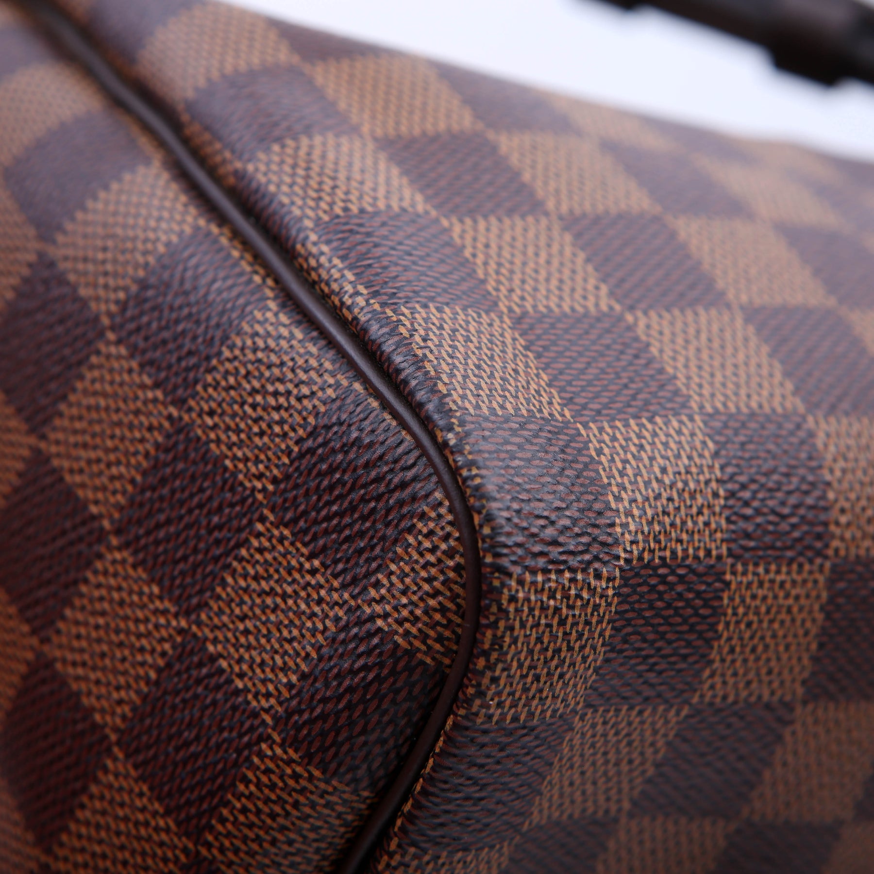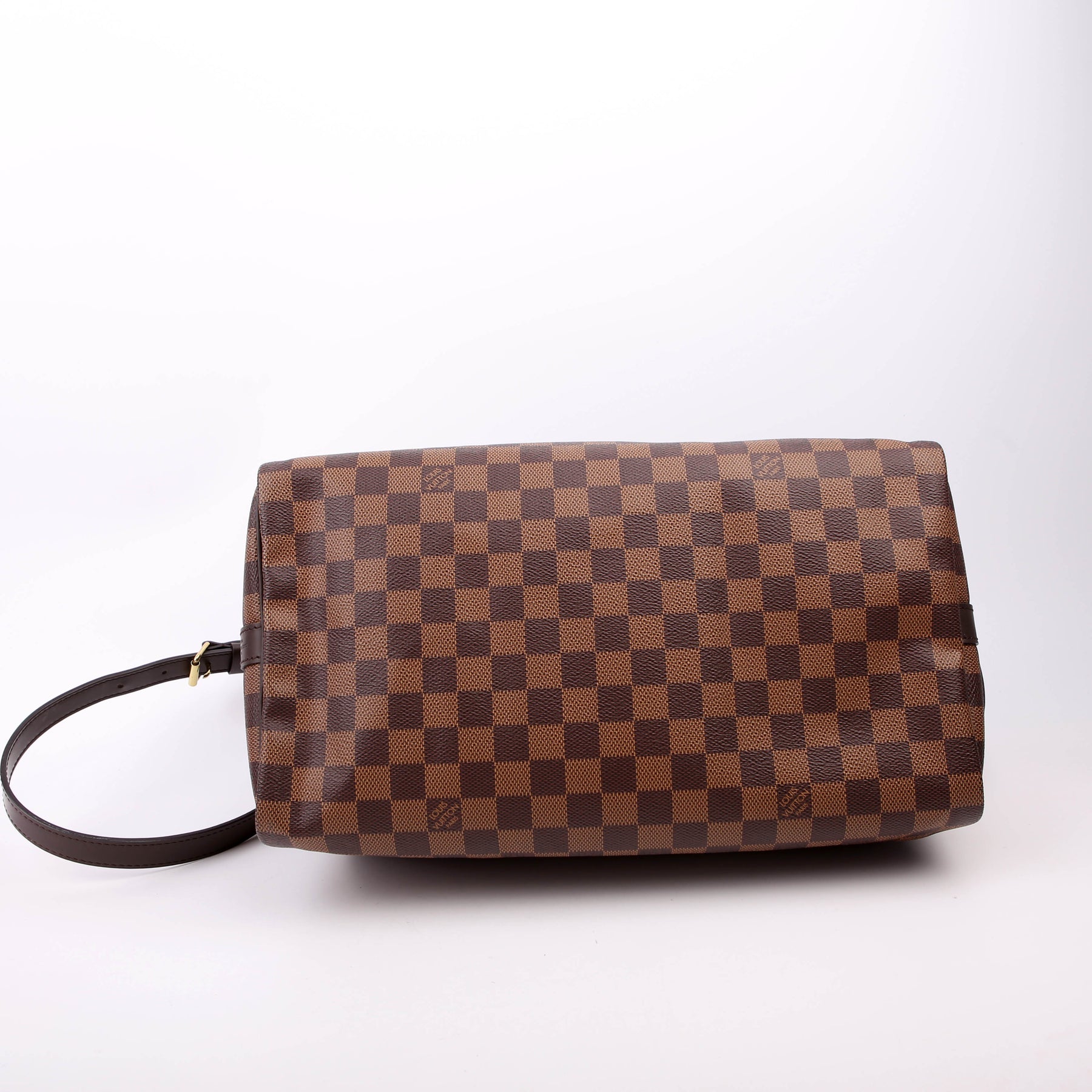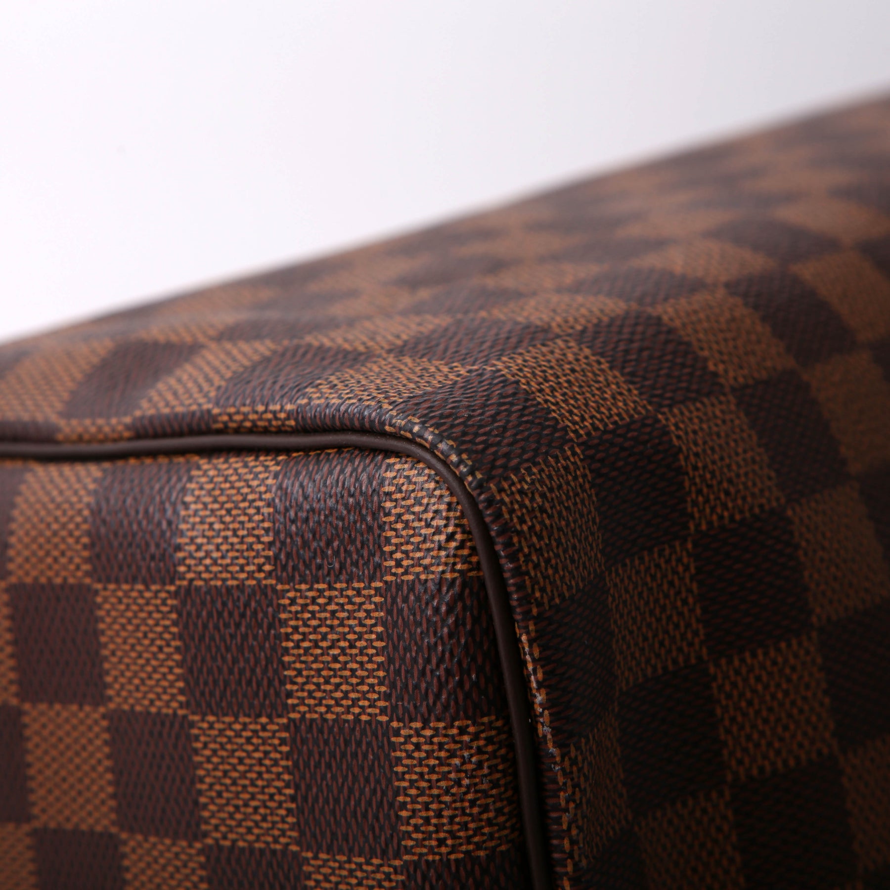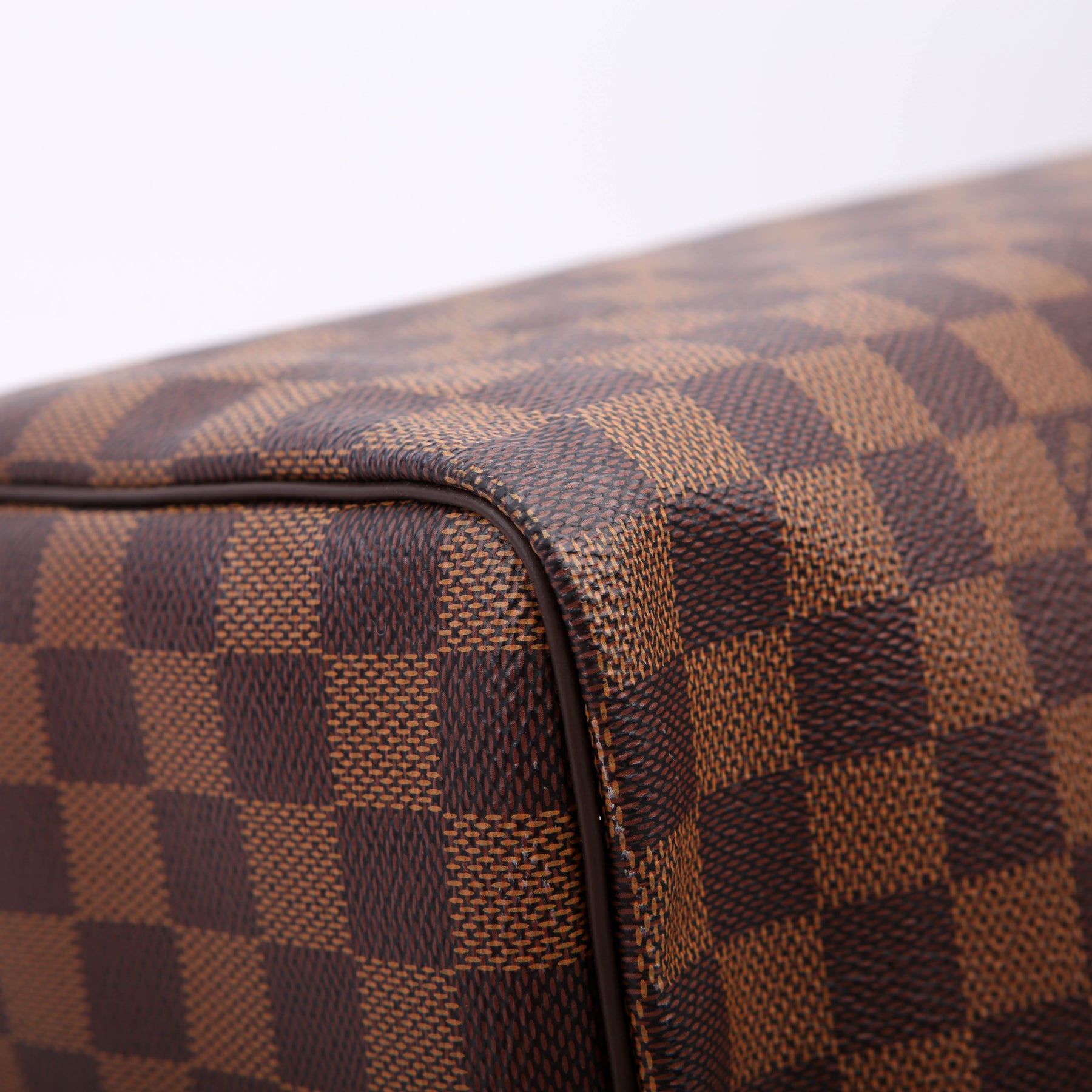 This pre-owned Louis Vuitton Speedy 35 Bandouliere is guaranteed 100% authentic. The exterior is in the classic Louis Vuitton Damier Ebene coated canvas.
