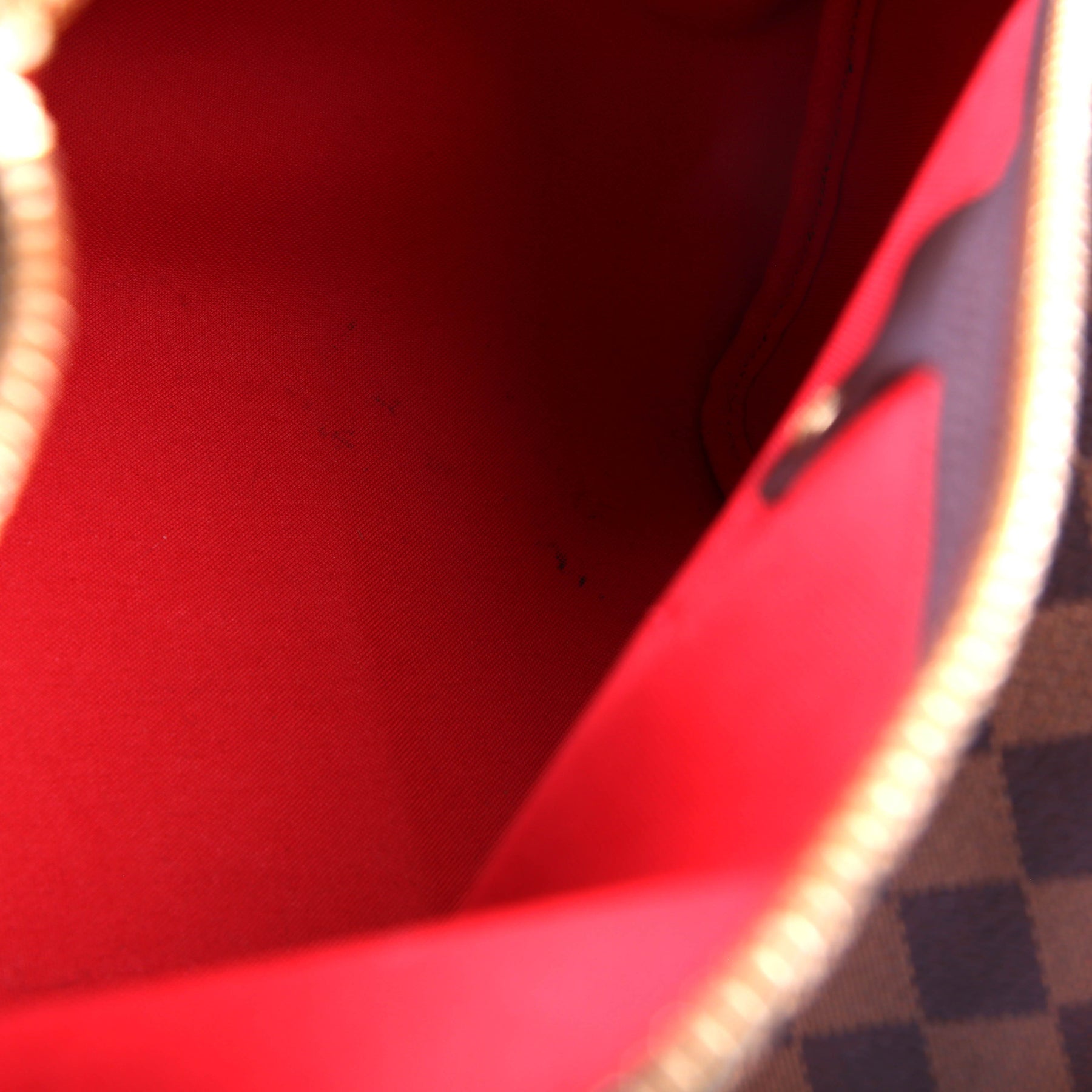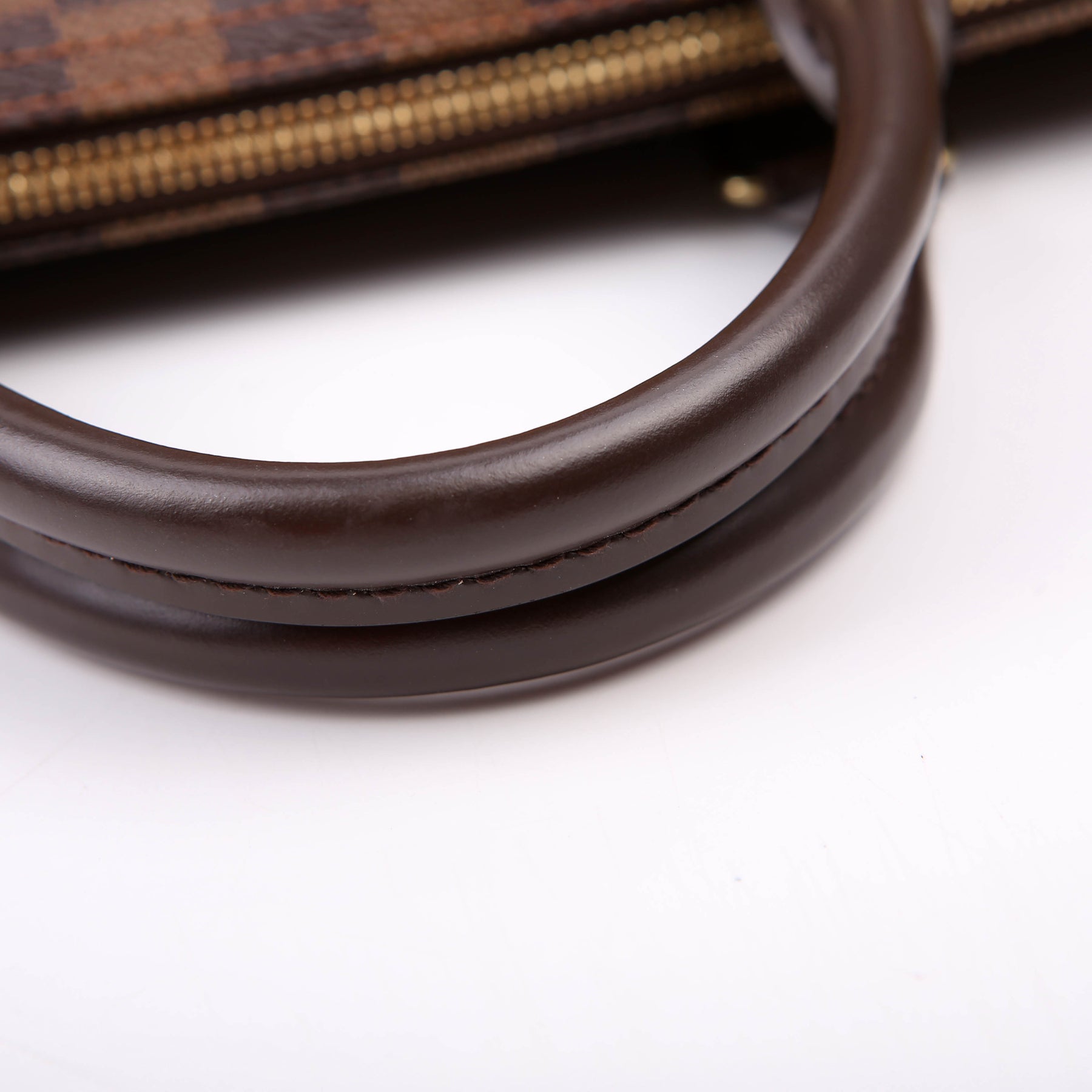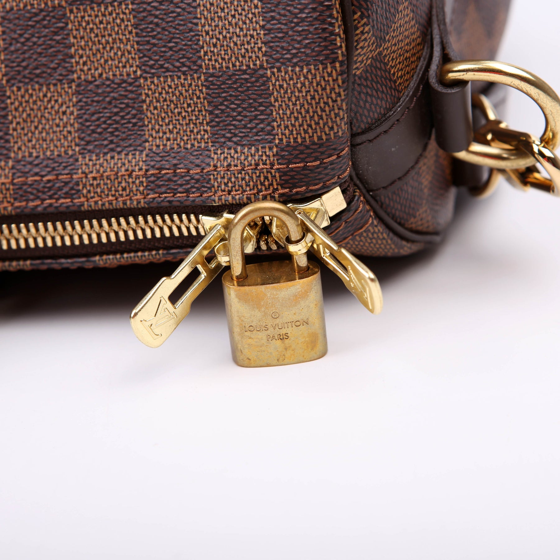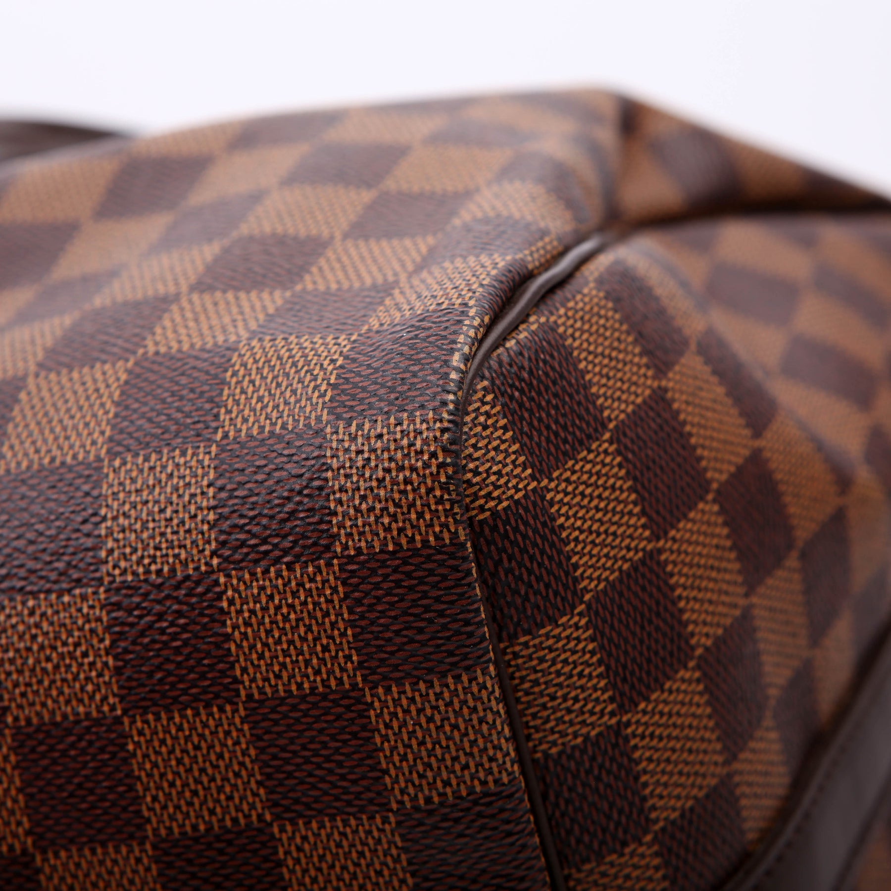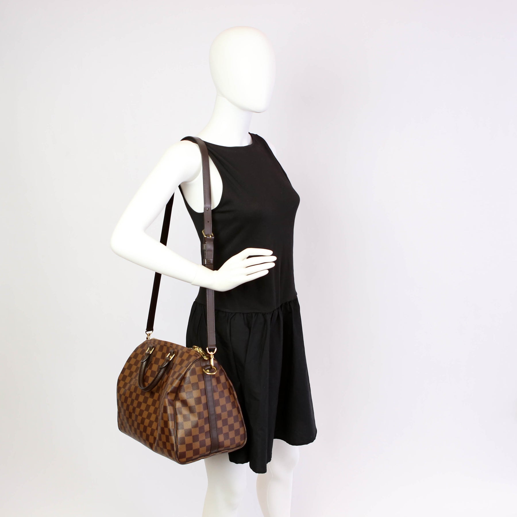 This pre-owned Louis Vuitton Speedy 35 Bandouliere is guaranteed 100% authentic. The exterior is in the classic Louis Vuitton Damier Ebene coated canvas.