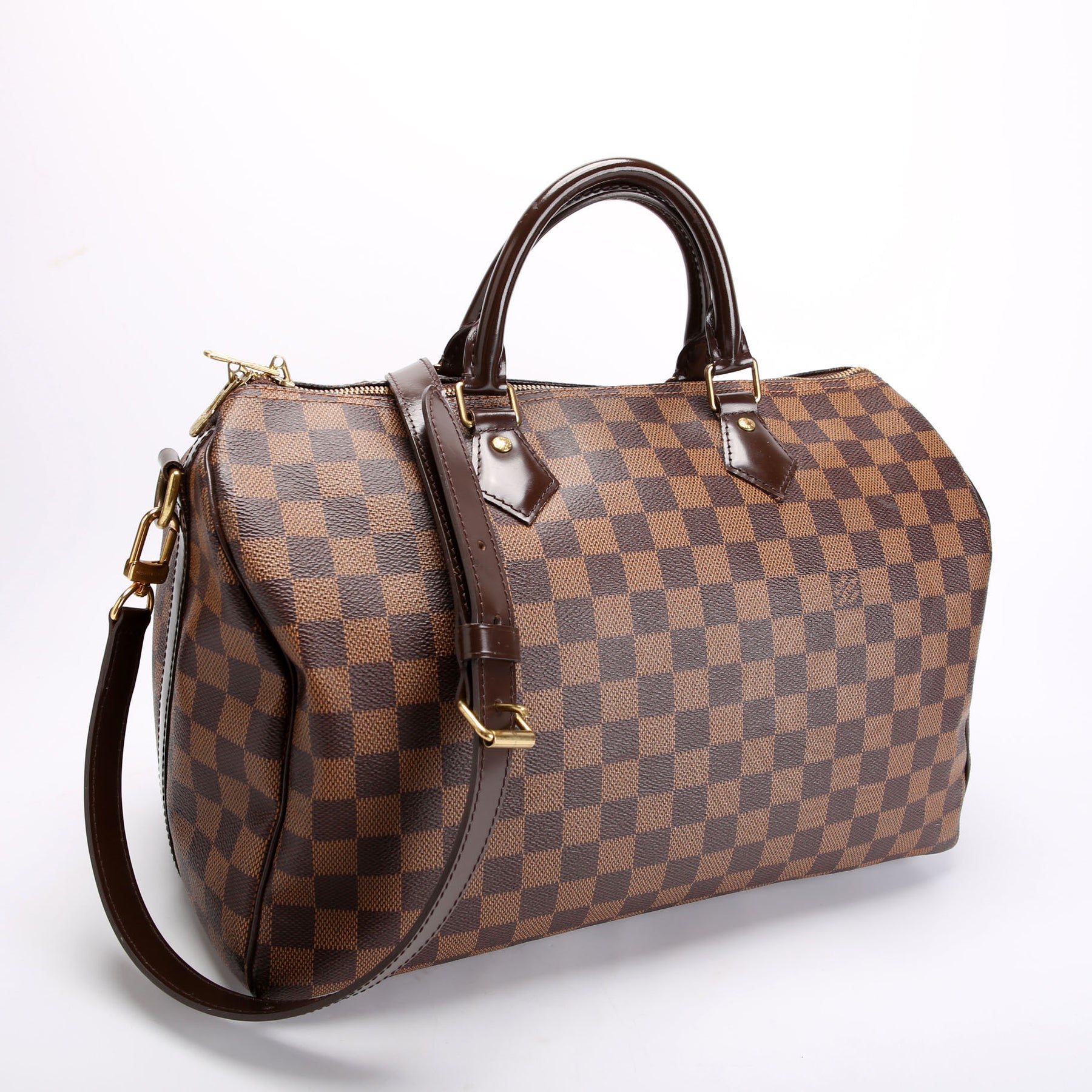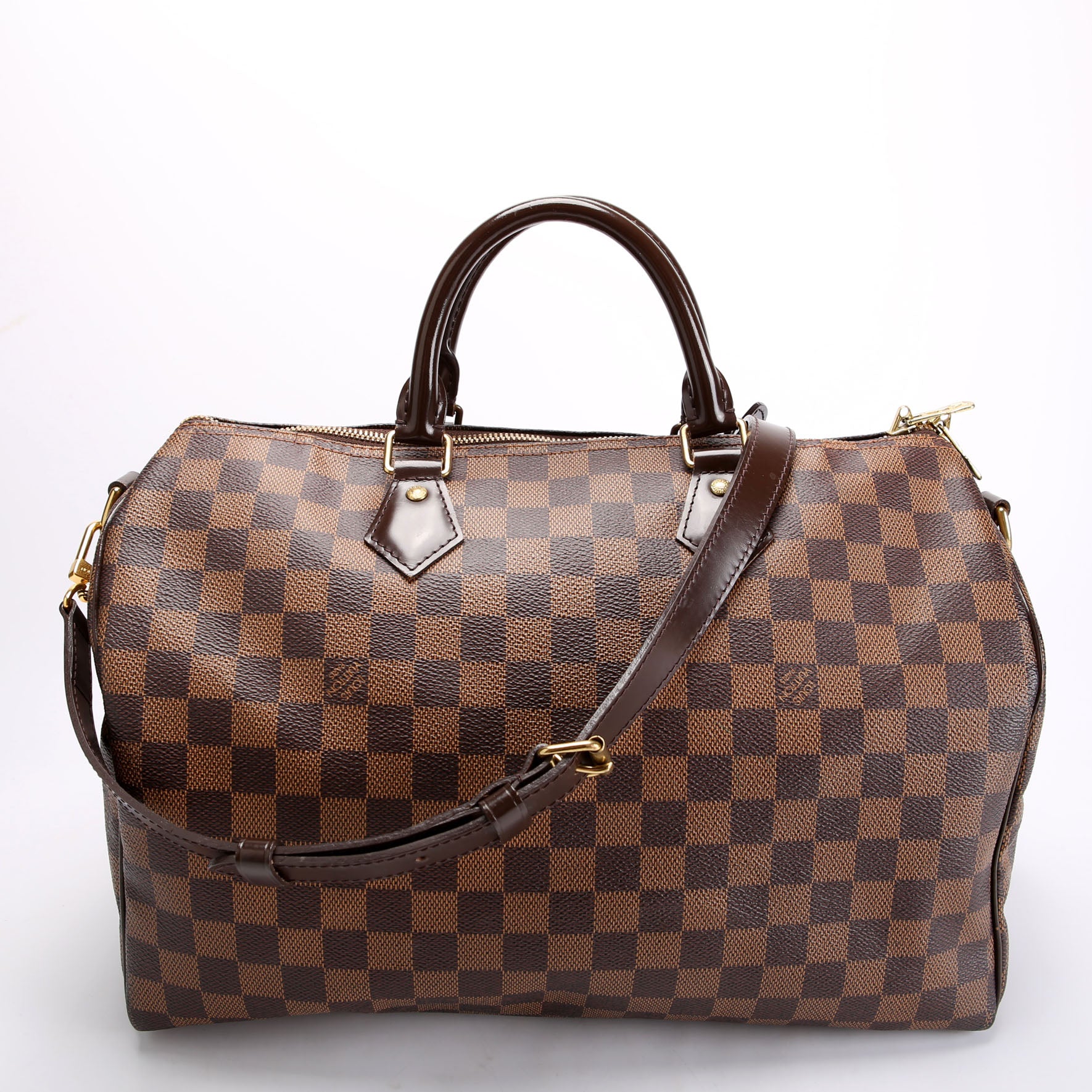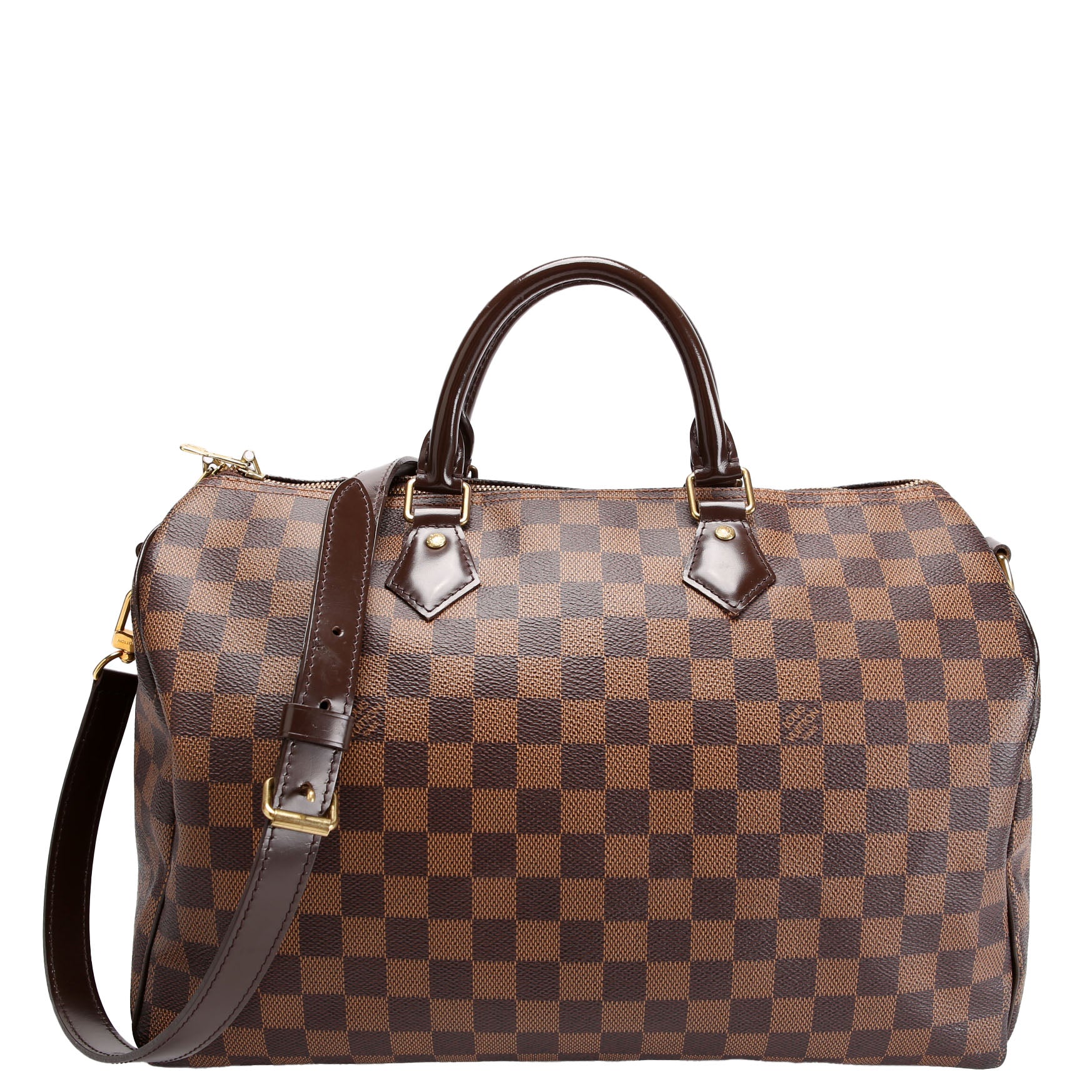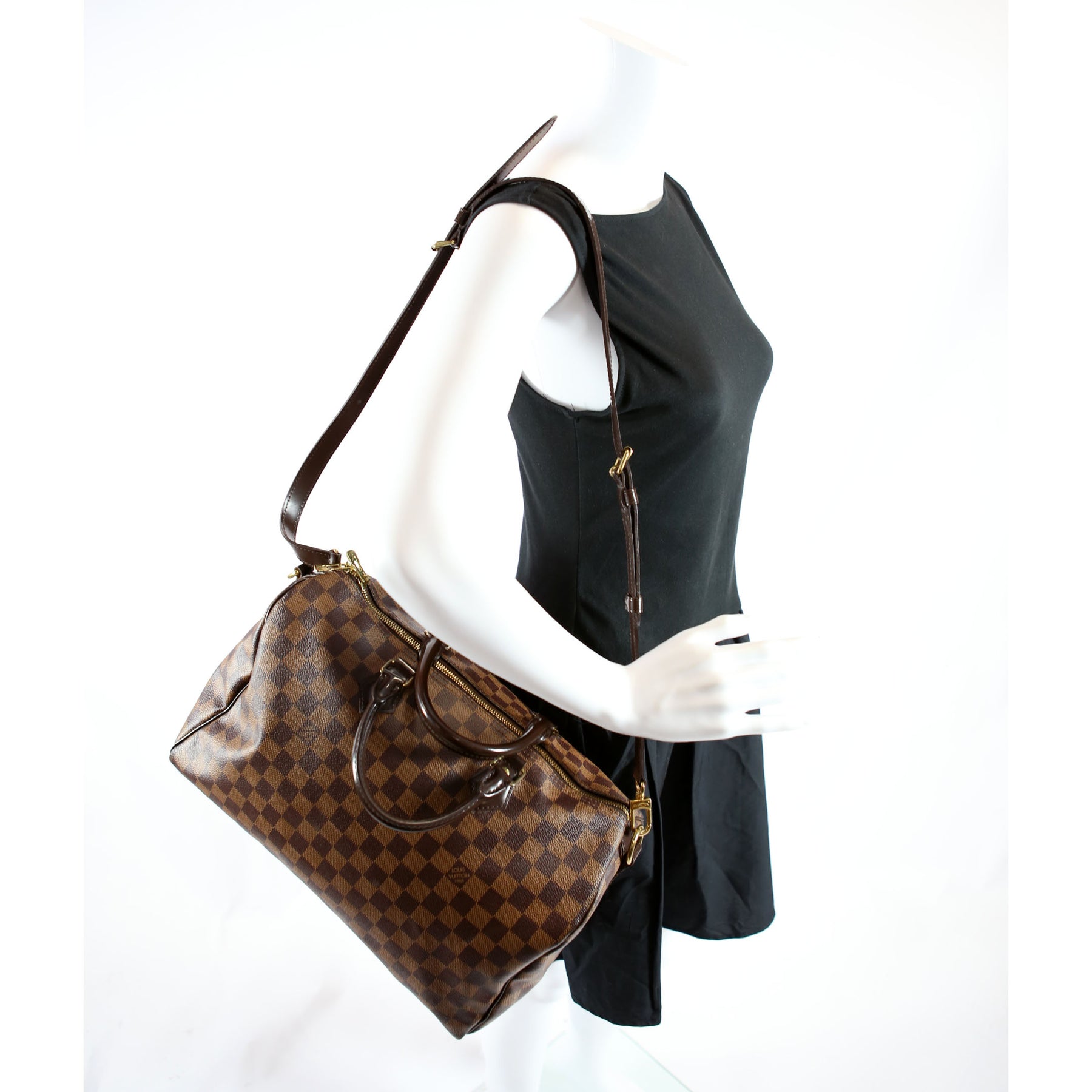 This pre-owned Louis Vuitton Speedy 35 Bandouliere is guaranteed 100% authentic. The exterior is in the classic Louis Vuitton Damier Ebene.