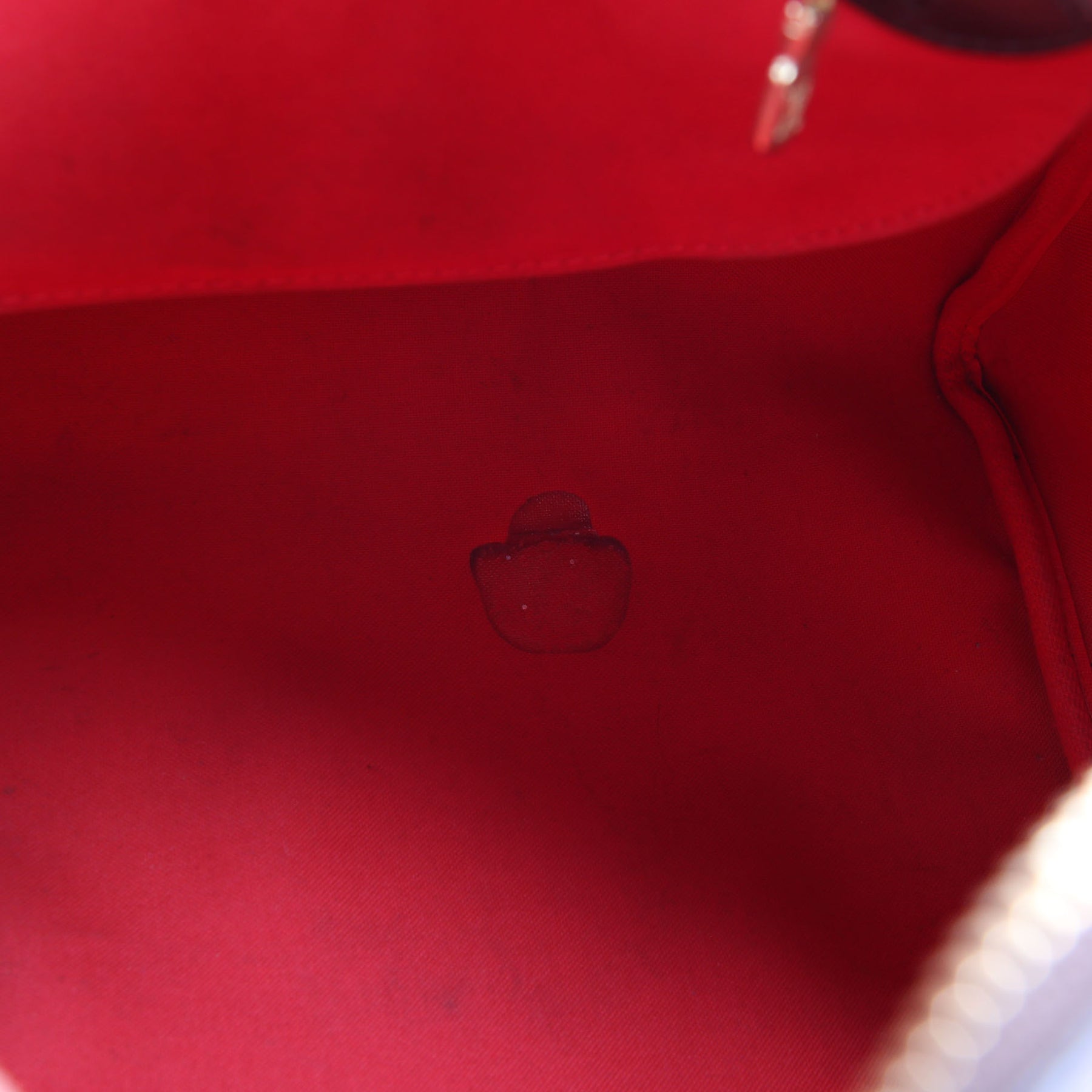 Interior: The interior has minor stains throughout, including a thick stain that shows an impression throught the exterior base. The interior features one zipper closure pocket.