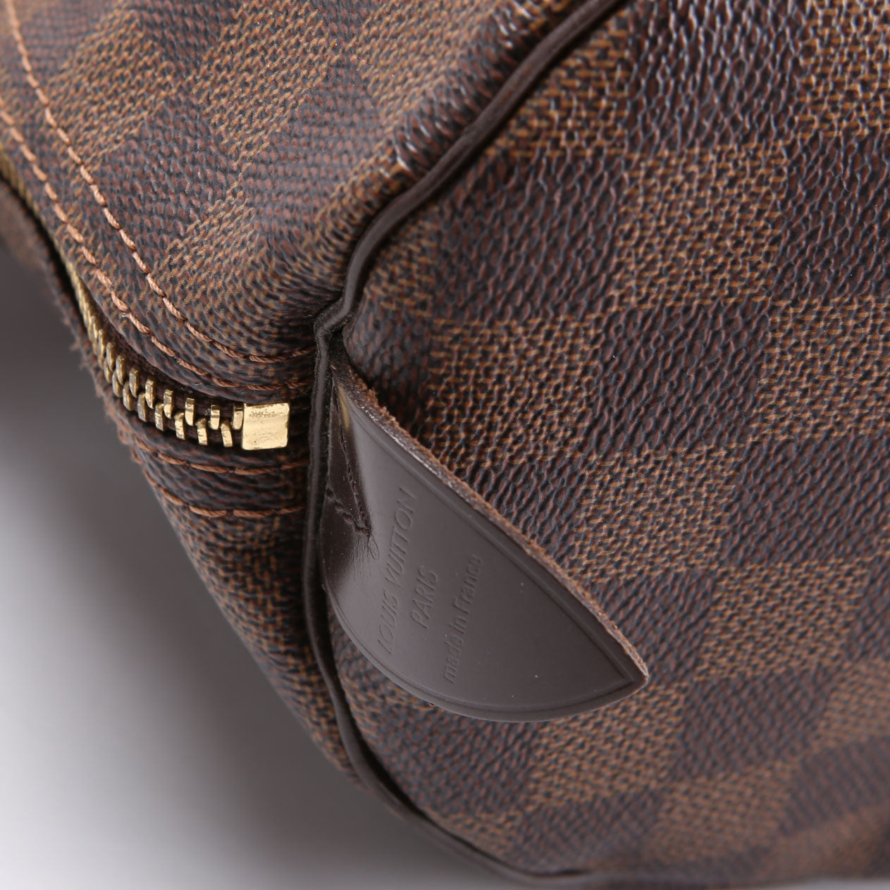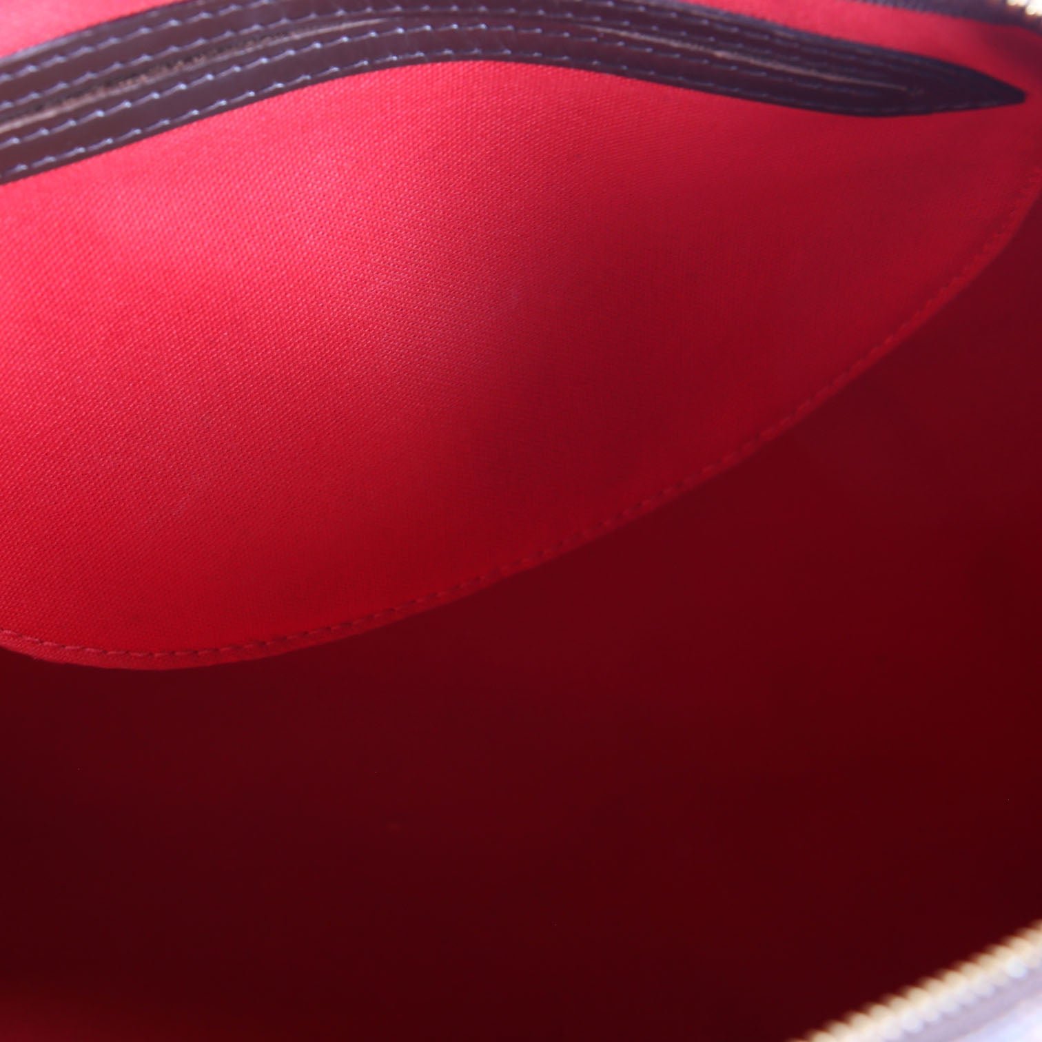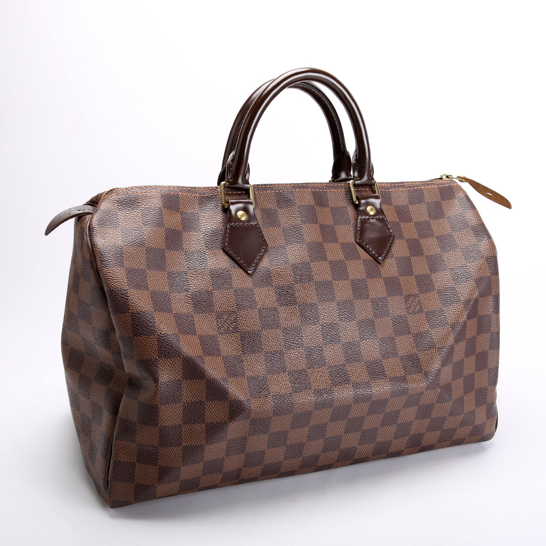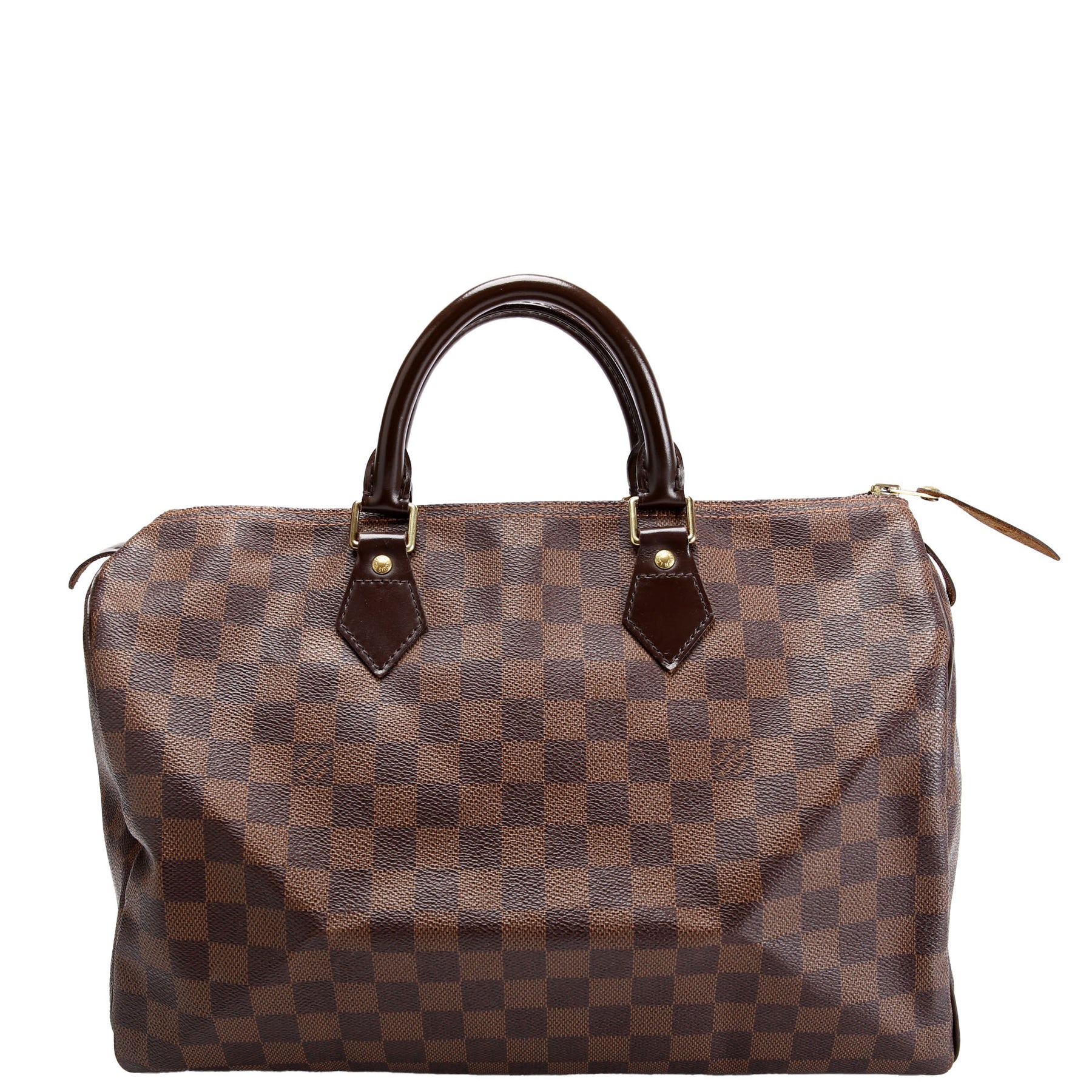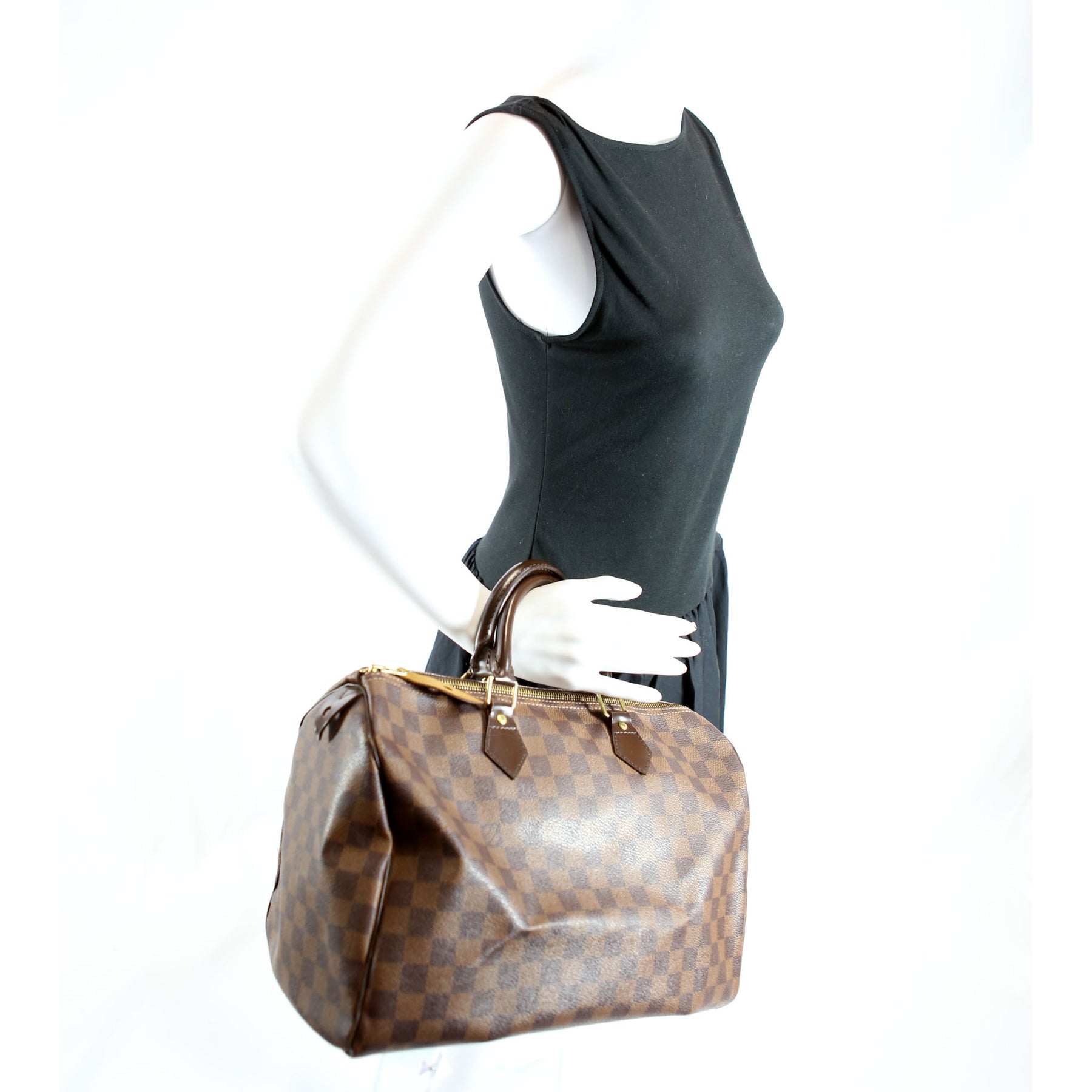 This pre-owned Louis Vuitton Speedy 35 is guaranteed 100% authentic. The exterior is in the classic Louis Vuitton Damier Ebene coated canvas.