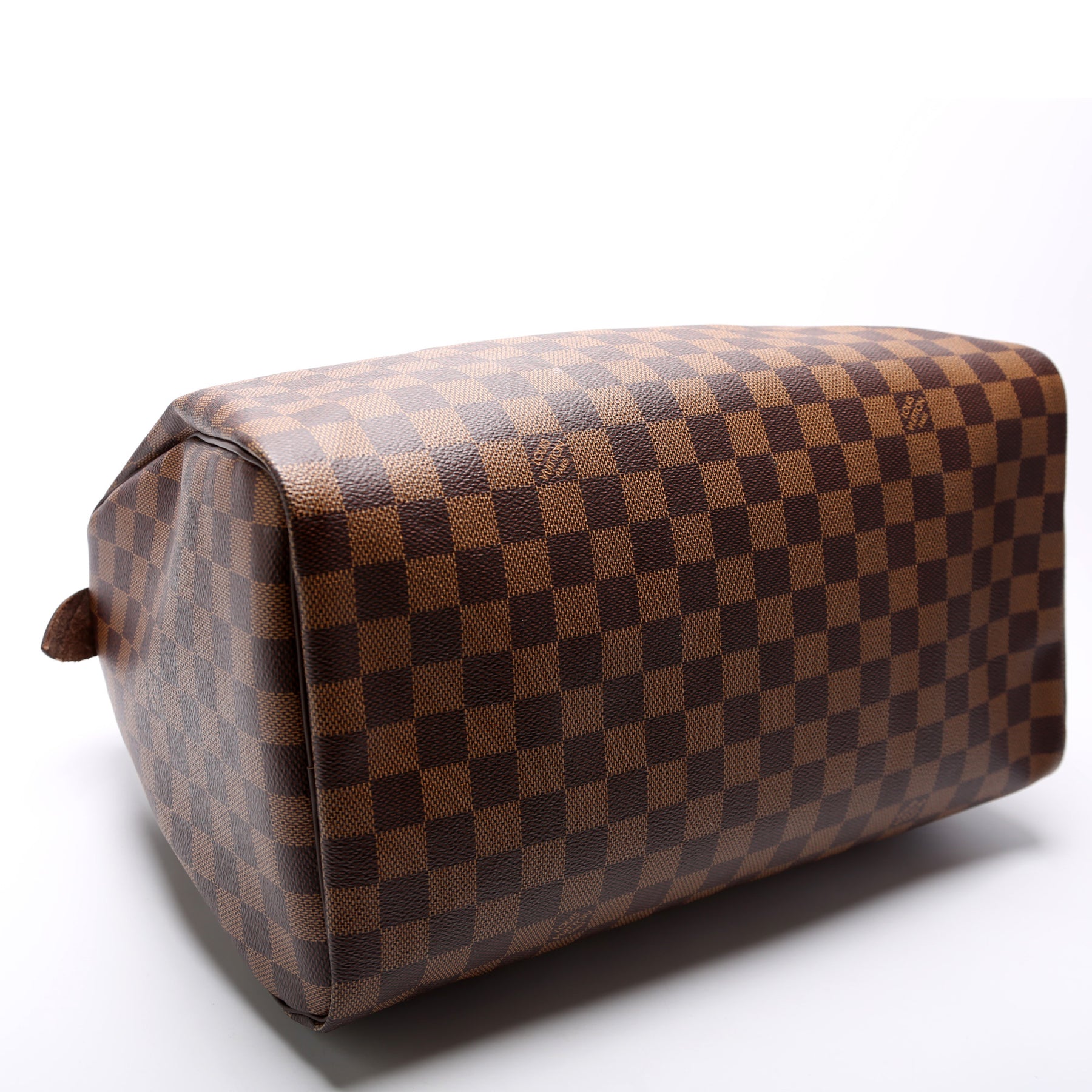 This pre-owned Louis Vuitton Speedy 35 is guaranteed 100% authentic. The exterior is in the classic Louis Vuitton Damier Ebene coated canvas.