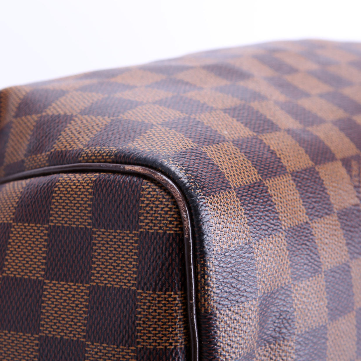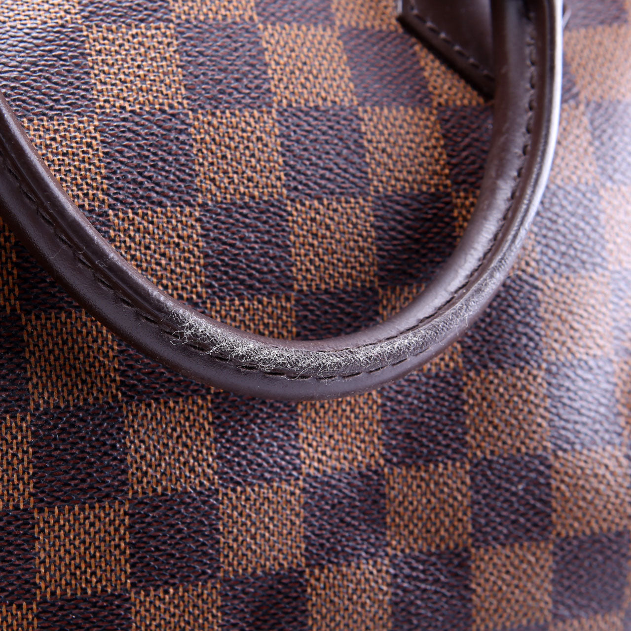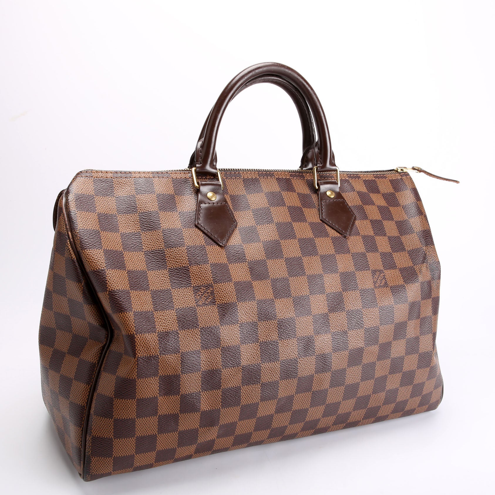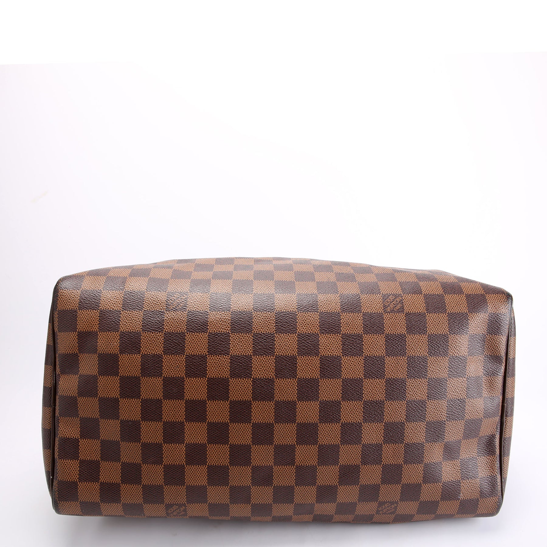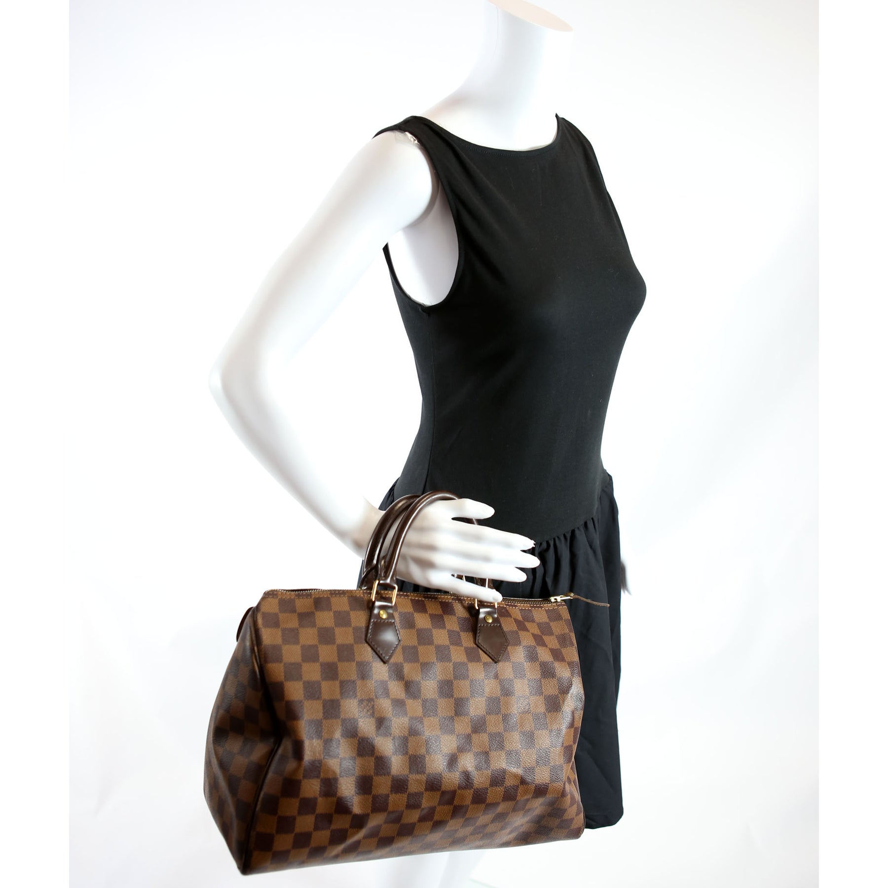 This pre-owned Louis Vuitton Speedy 35 is guaranteed 100% authentic. The exterior is in the classic Louis Vuitton Damier Ebene coated canvas.