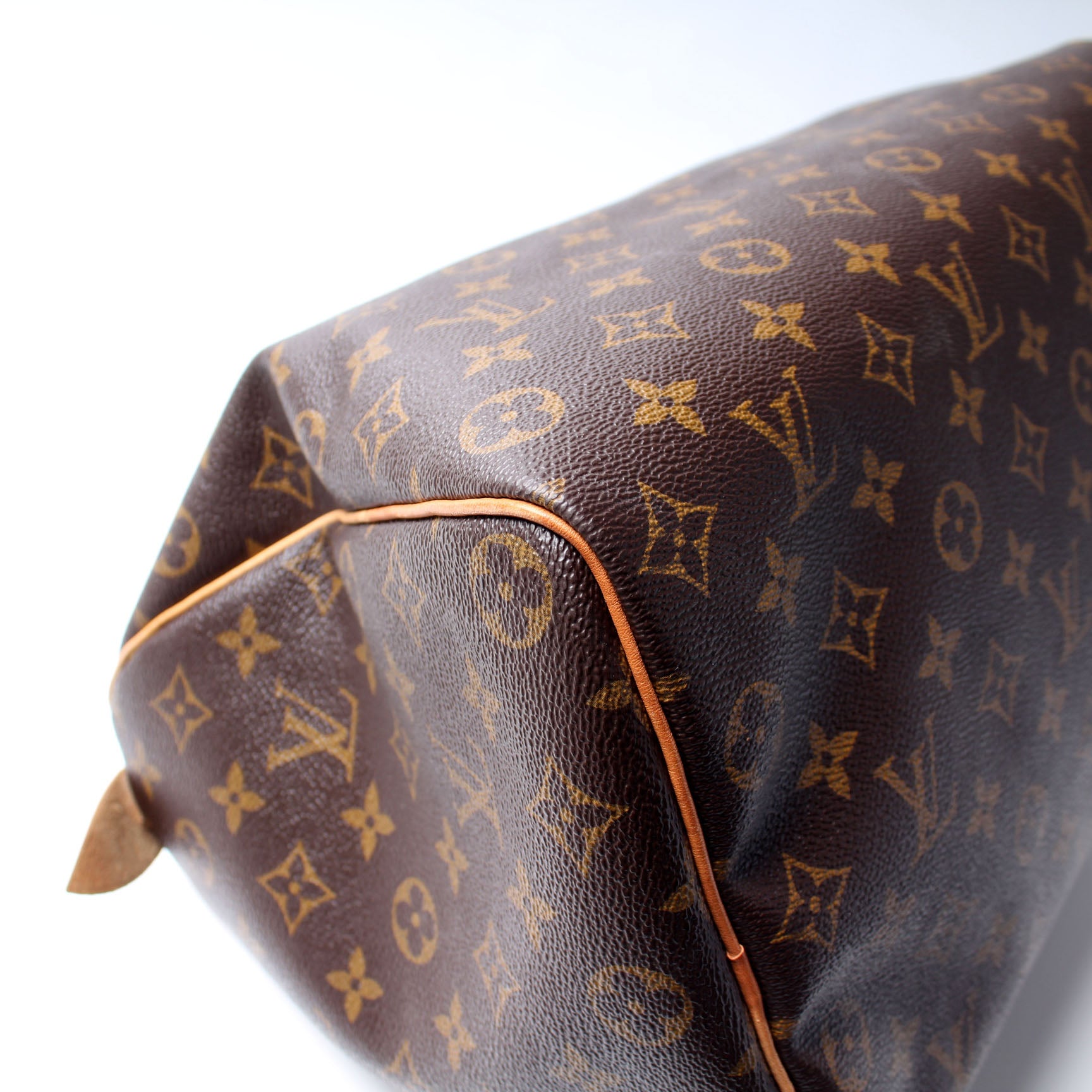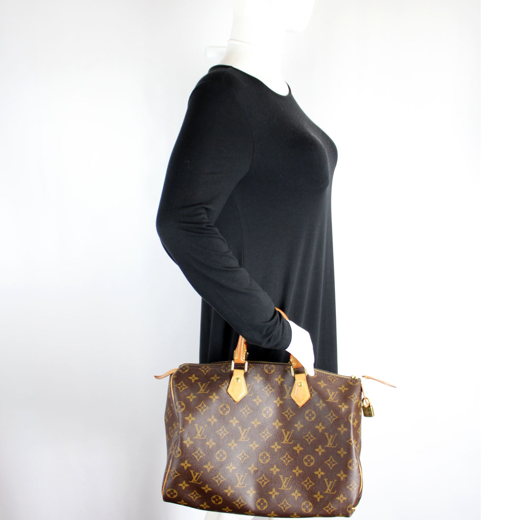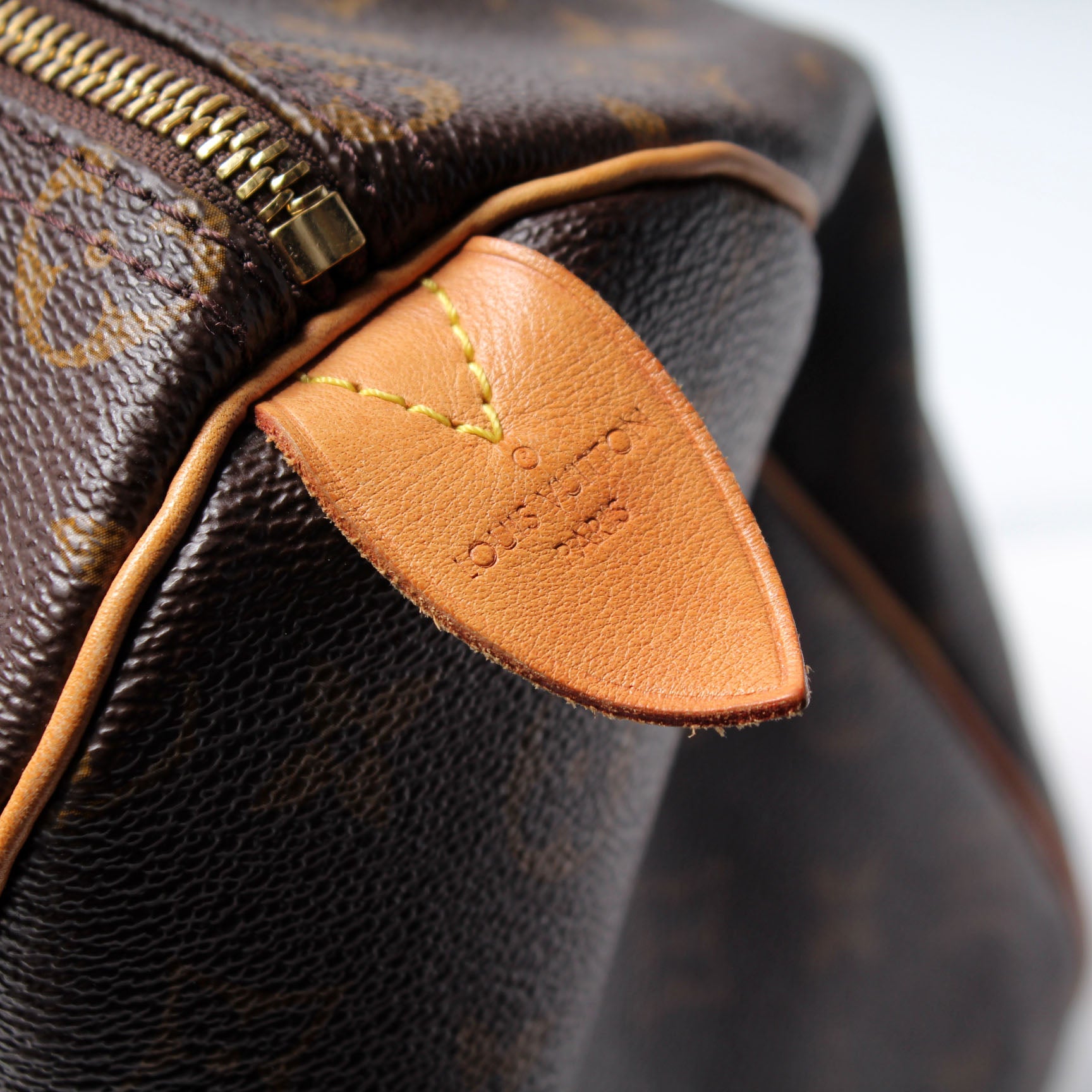 This pre-owned Louis Vuitton Speedy 35 is guaranteed 100% authentic. The exterior is in the classic Louis Vuitton Monogram coated canvas.