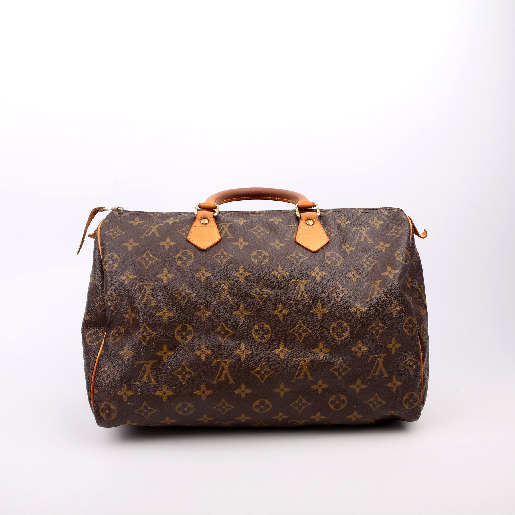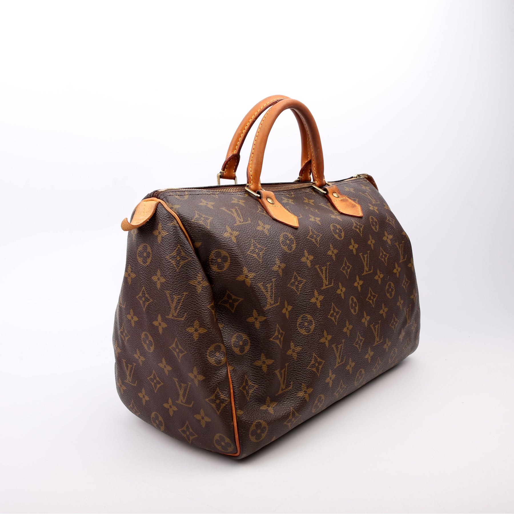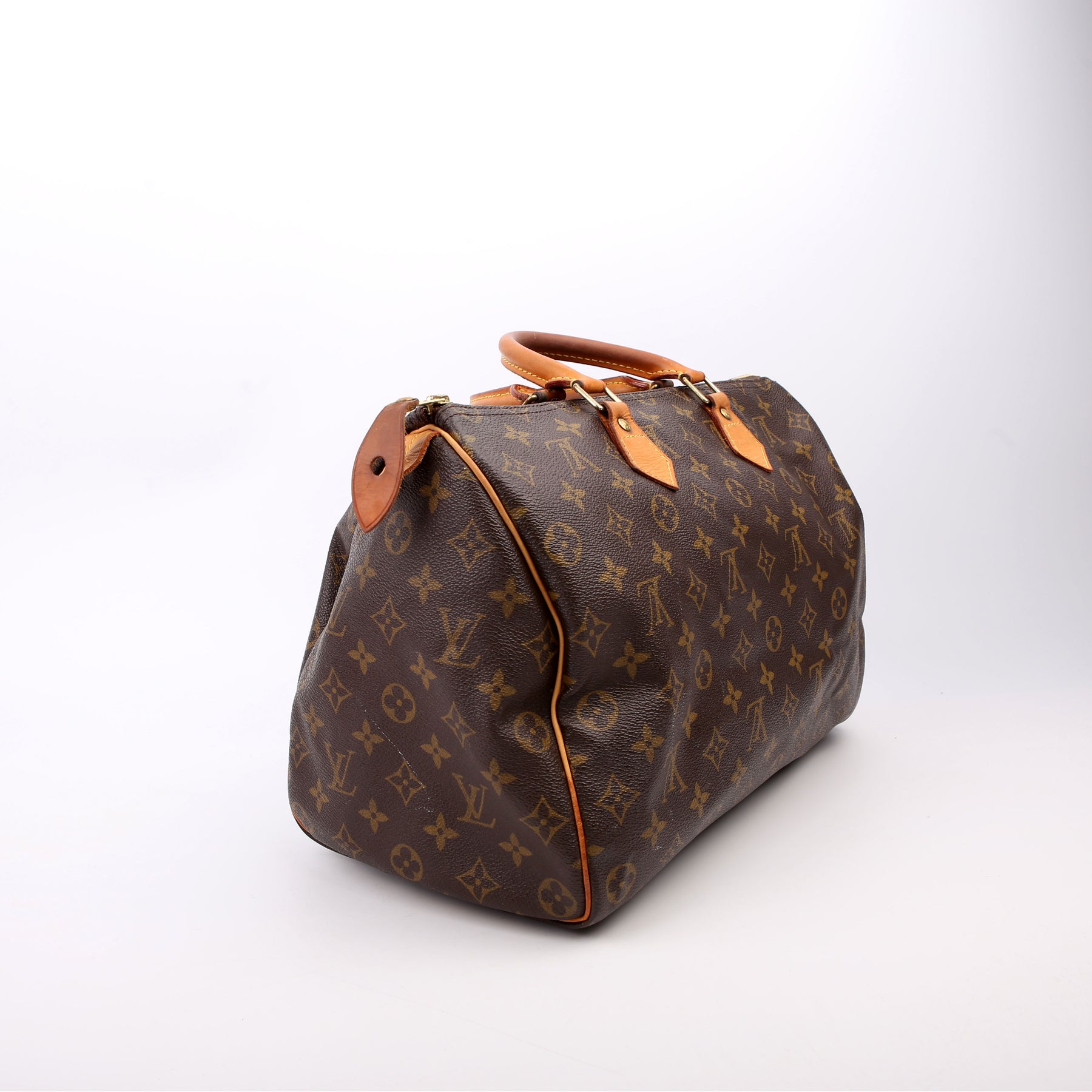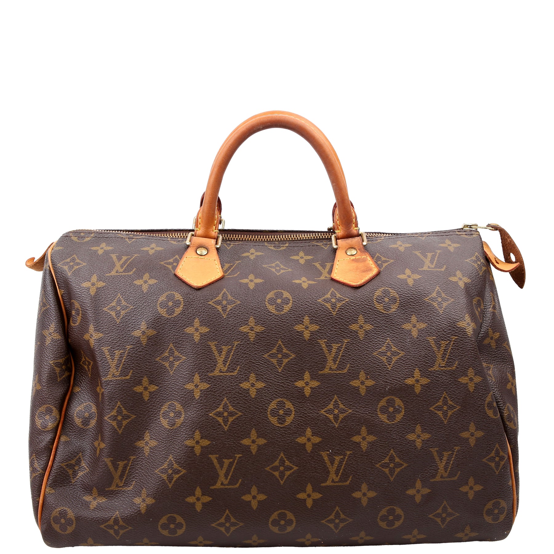 This pre-owned Louis Vuitton Speedy 35 is guaranteed 100% authentic. The exterior is in the classic Louis Vuitton Monogram coated canvas.