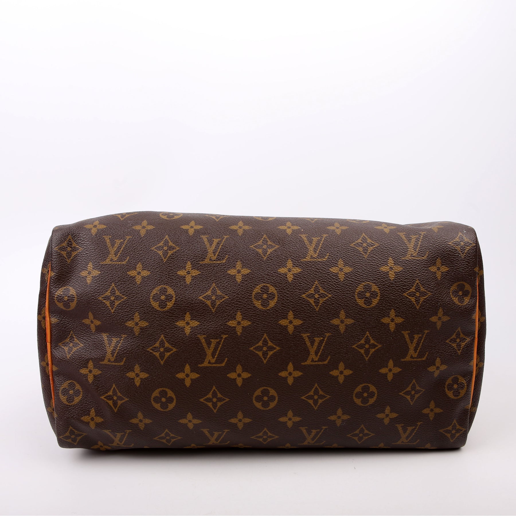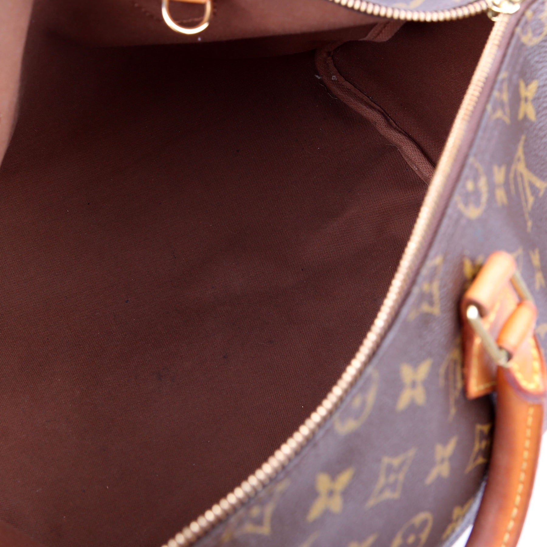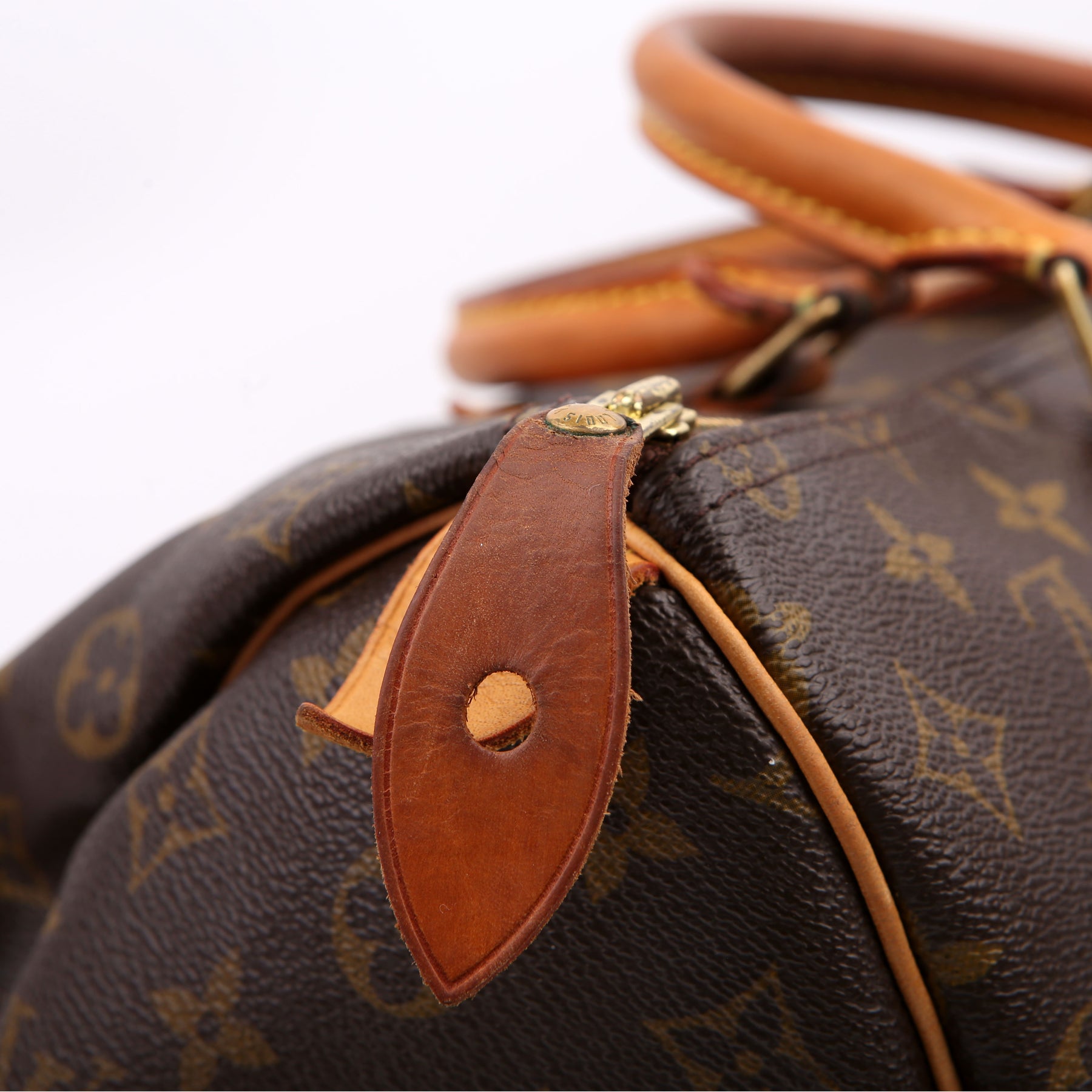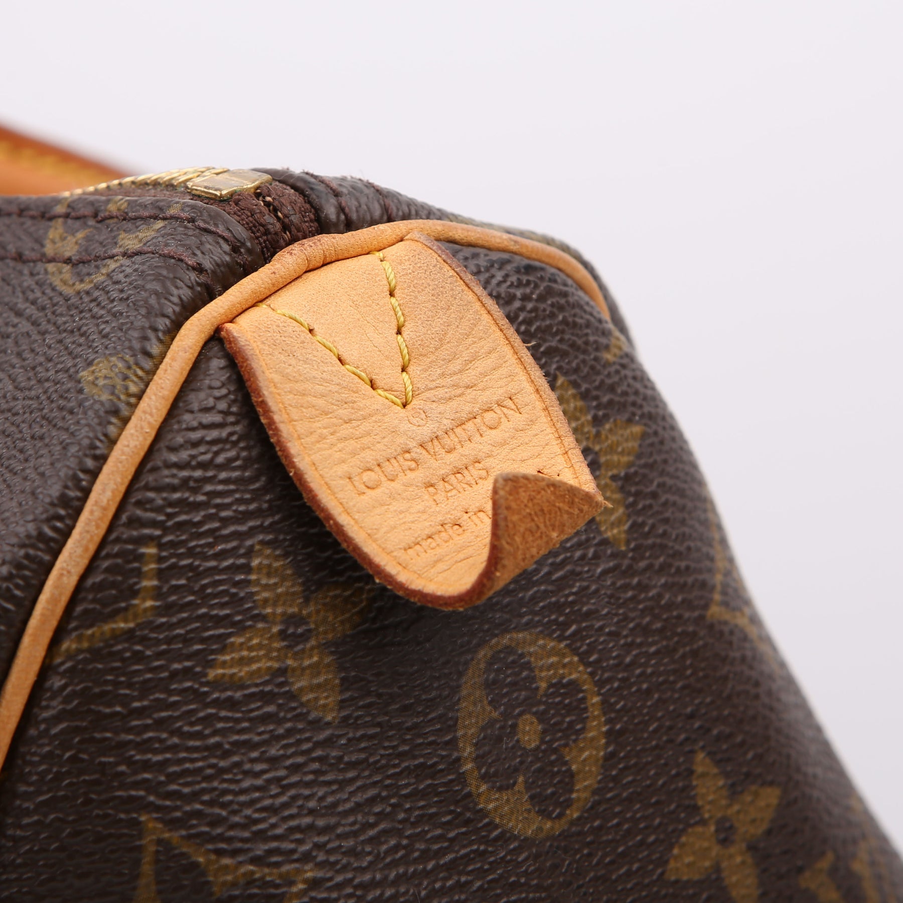 This pre-owned Louis Vuitton Speedy 35 is guaranteed 100% authentic. The exterior is in the classic Louis Vuitton Monogram coated canvas.