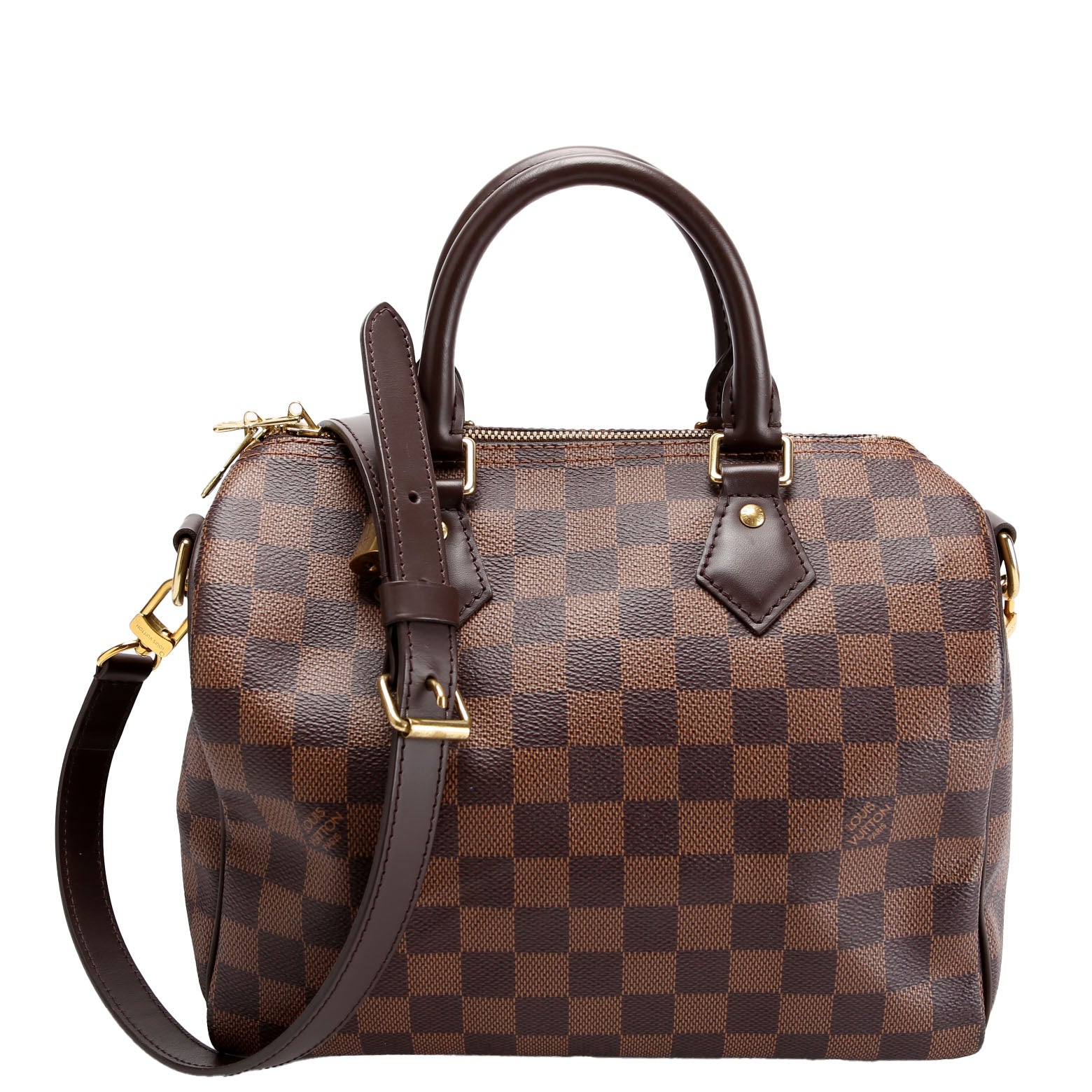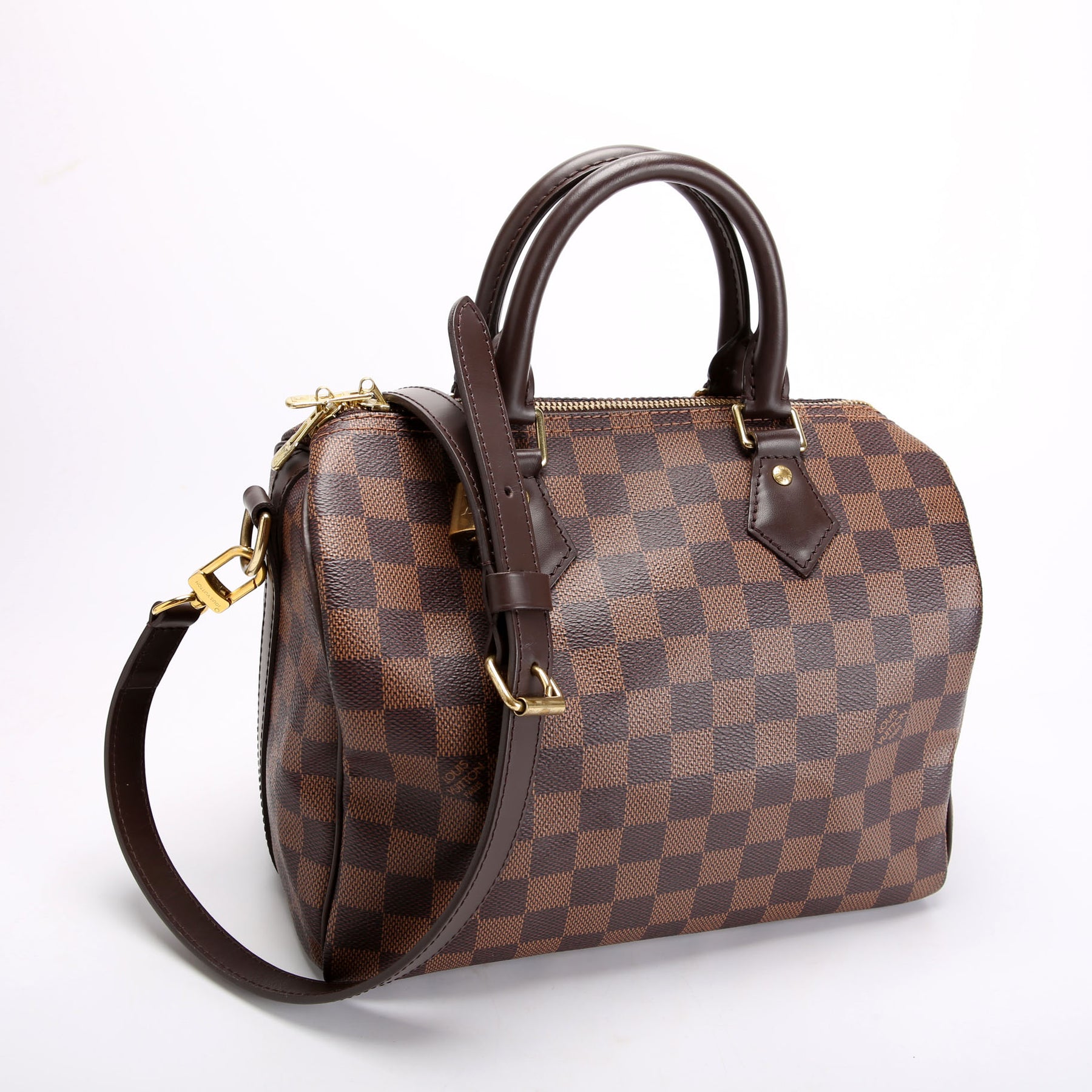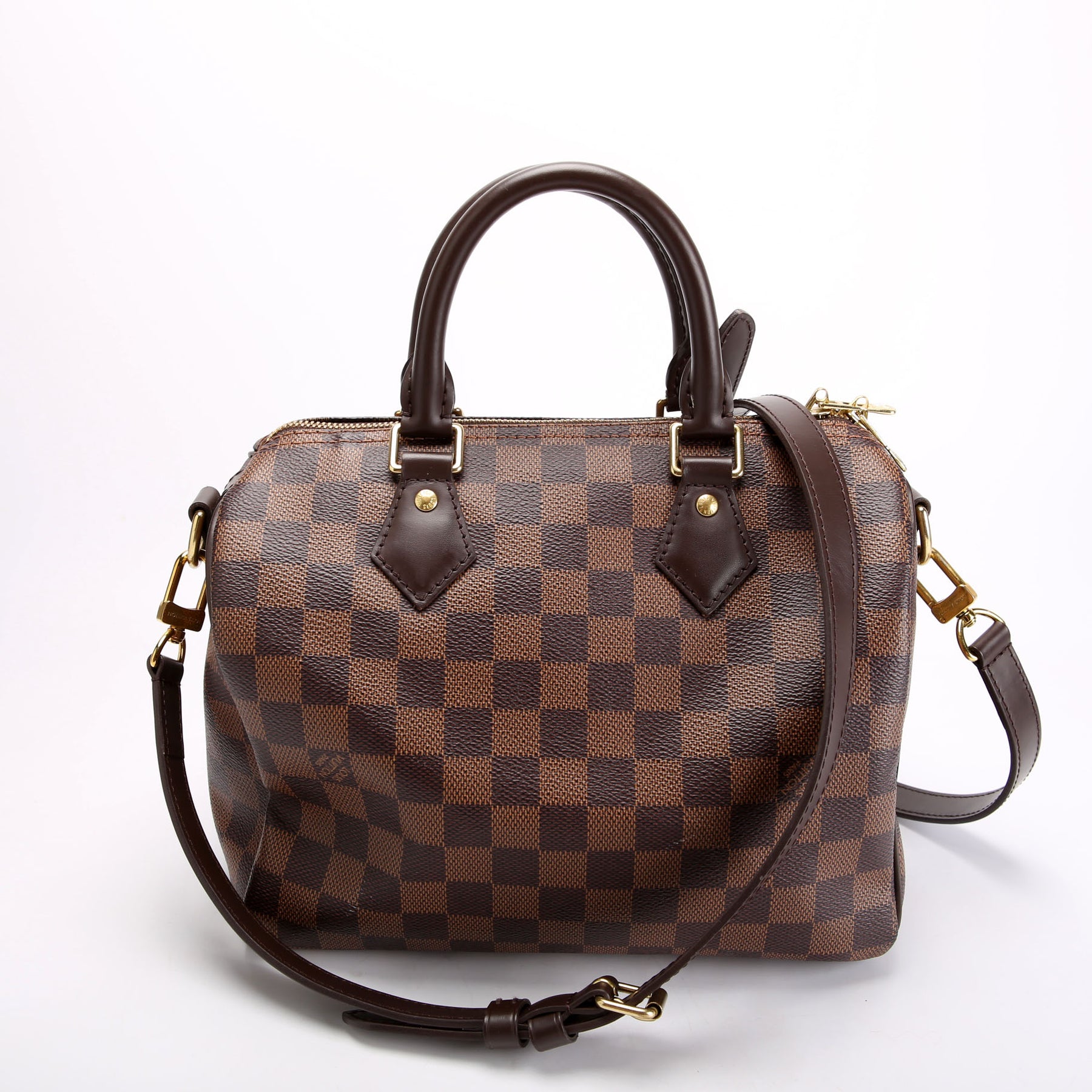 This pre-owned Louis Vuitton Speedy 25 Bandouliere is guaranteed 100% authentic. The exterior is in the classic Louis Vuitton Damier Ebene.