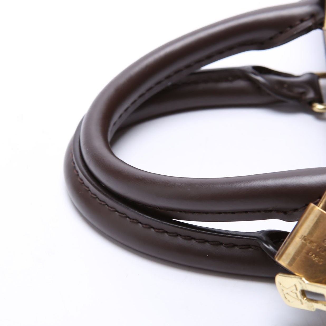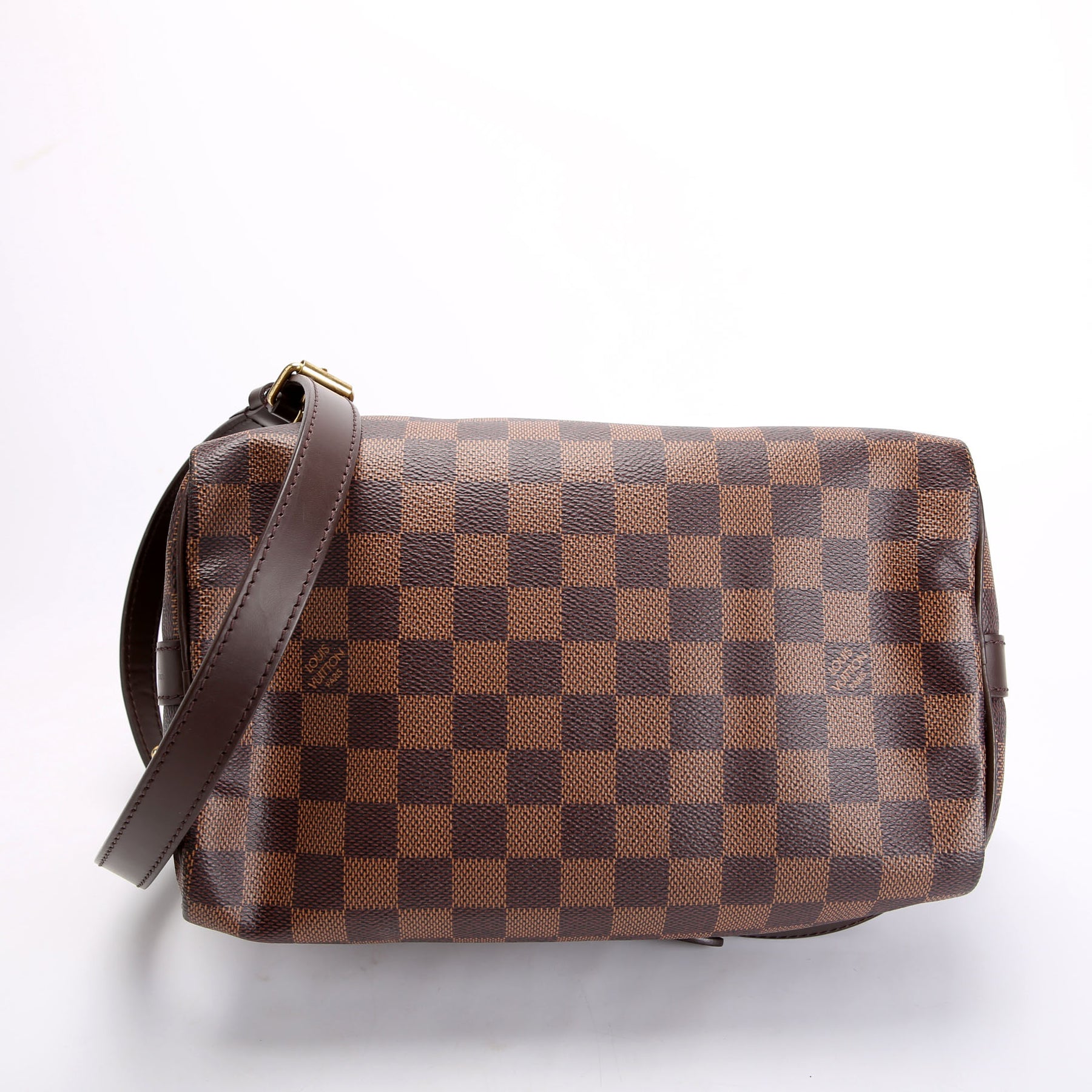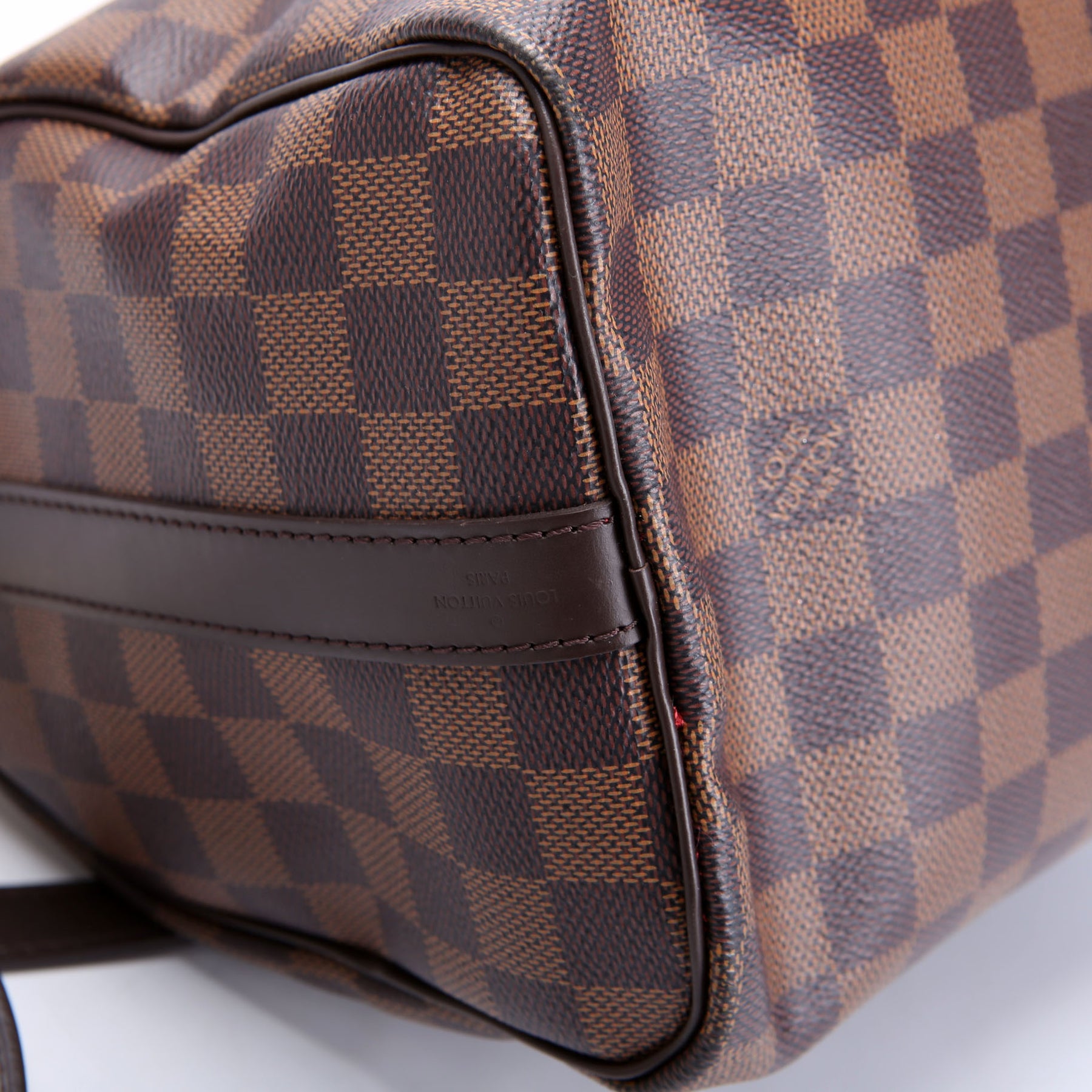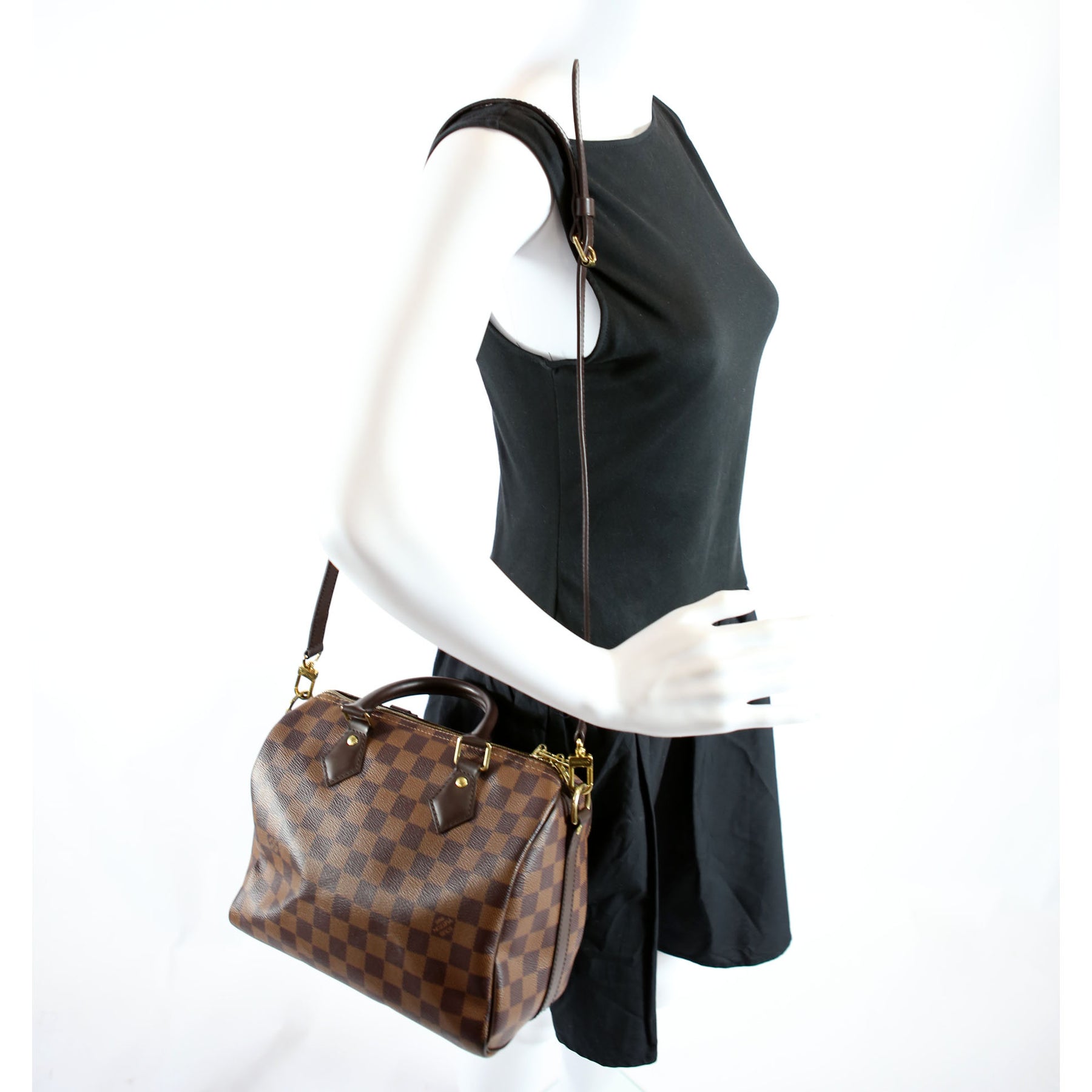 This pre-owned Louis Vuitton Speedy 25 Bandouliere is guaranteed 100% authentic. The exterior is in the classic Louis Vuitton Damier Ebene.