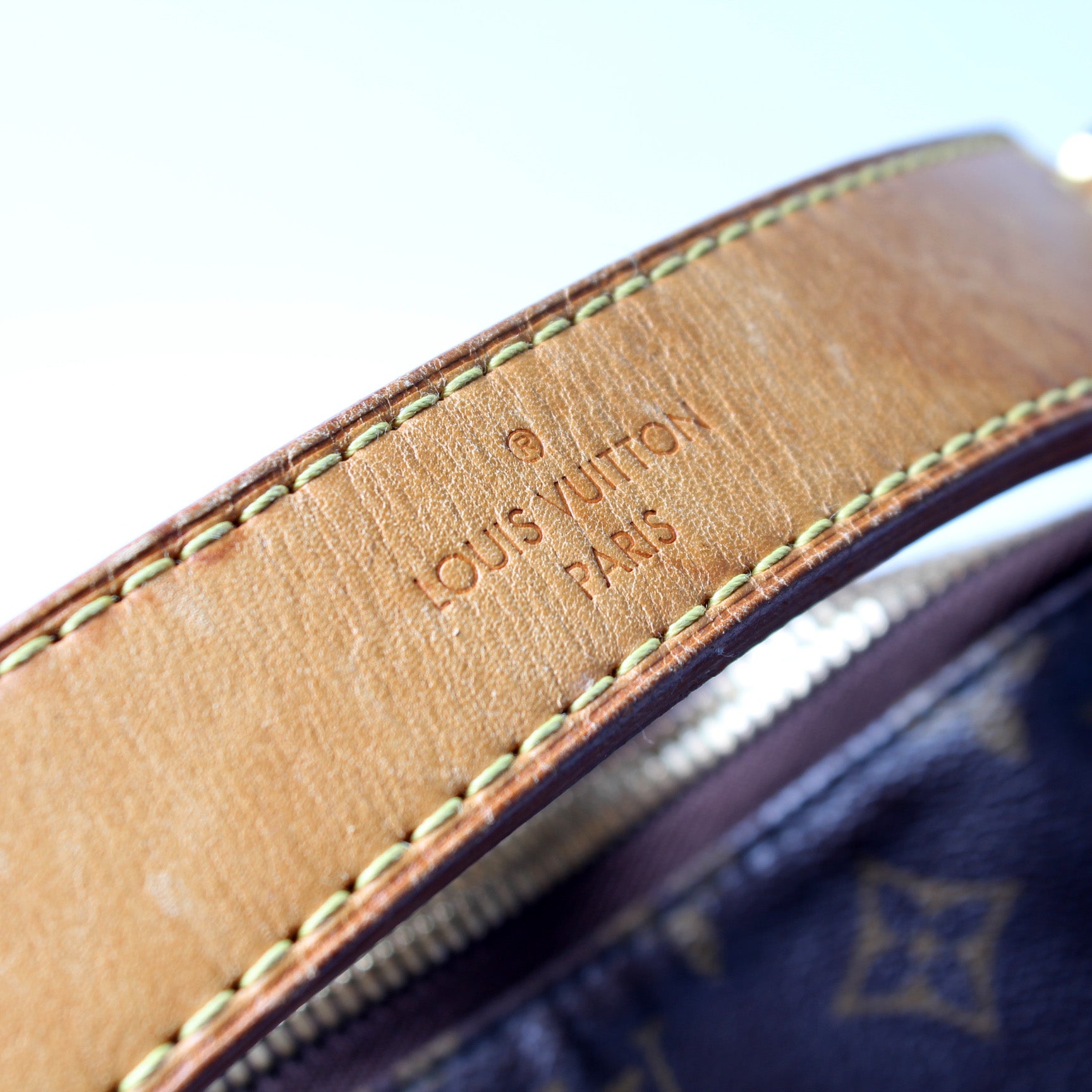Handle: The leather handle has discoloration and scratching.