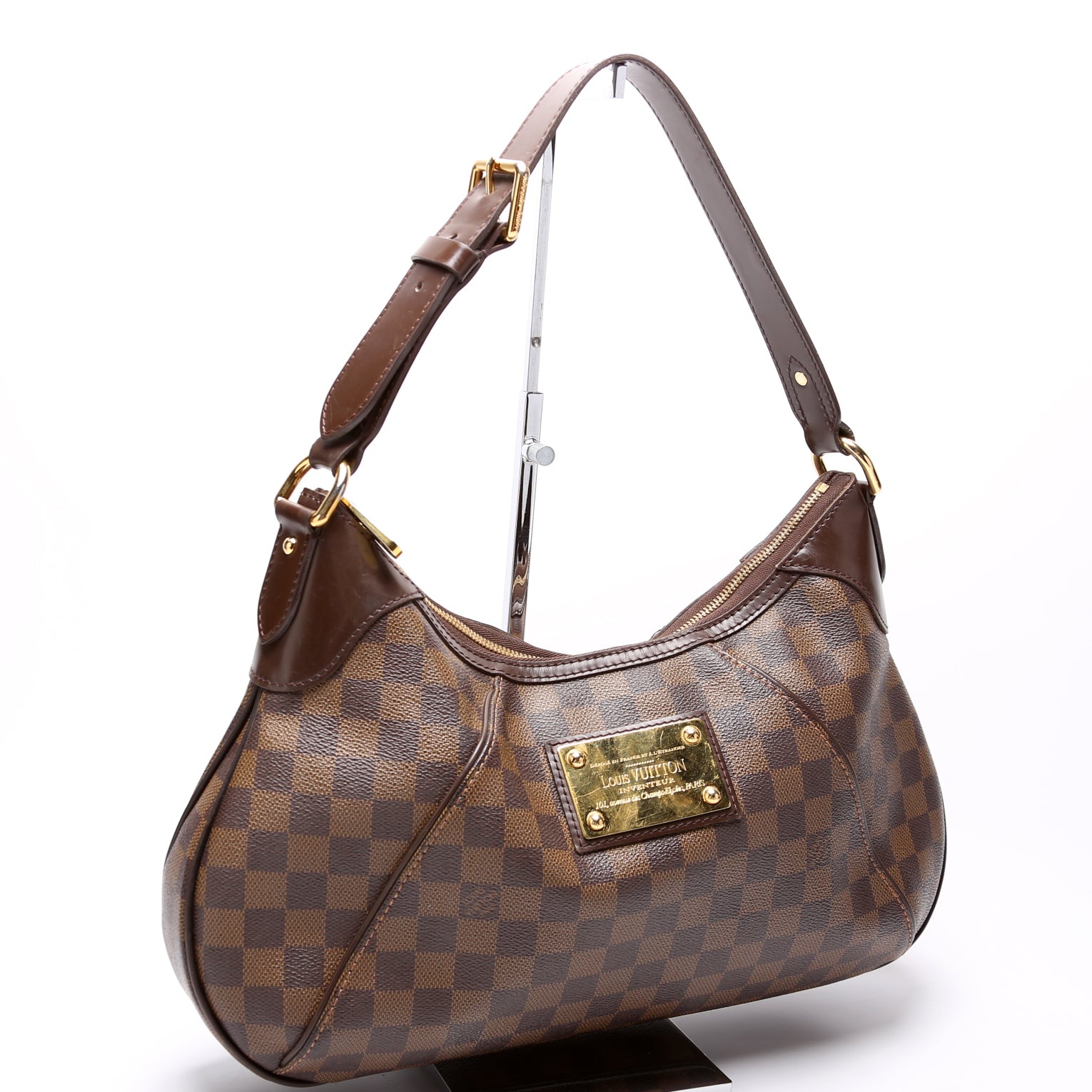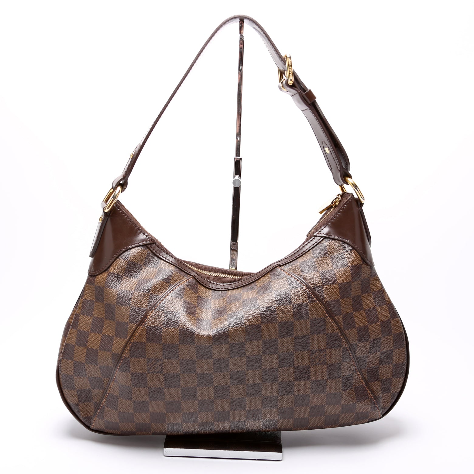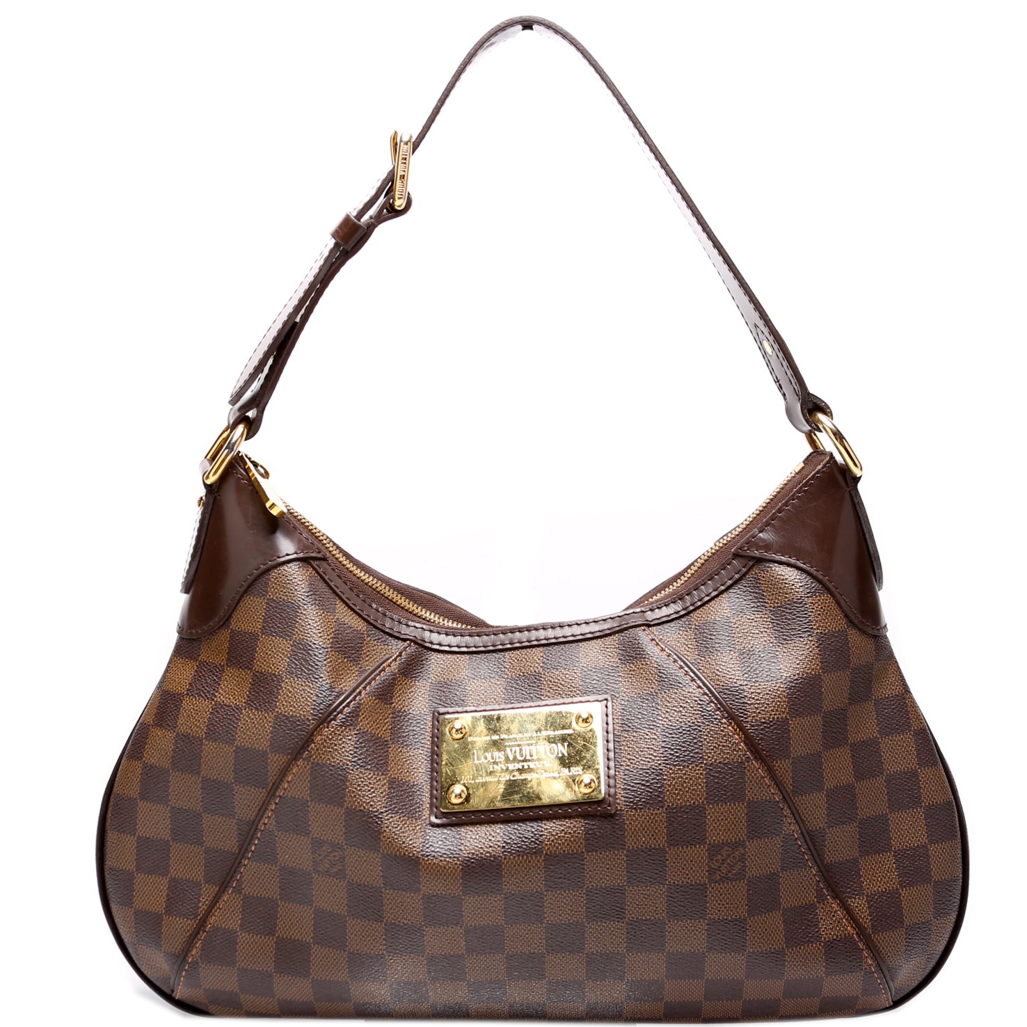 This pre-owned Louis Vuitton Thames GM is guaranteed 100% authentic. The exterior is in the classic Louis Vuitton Damier Ebene coated canvas.