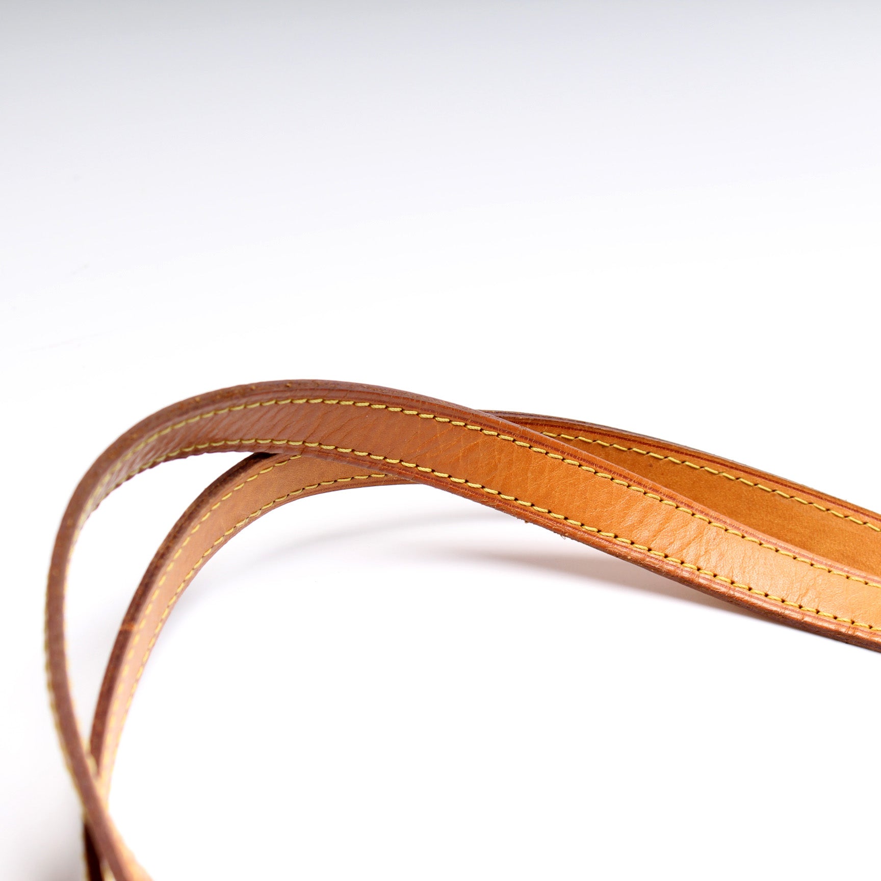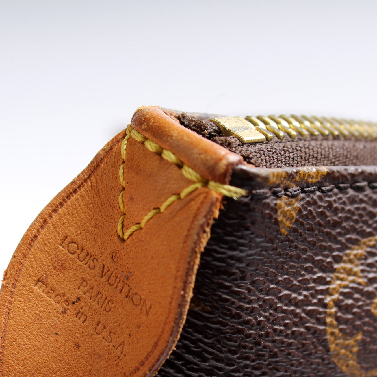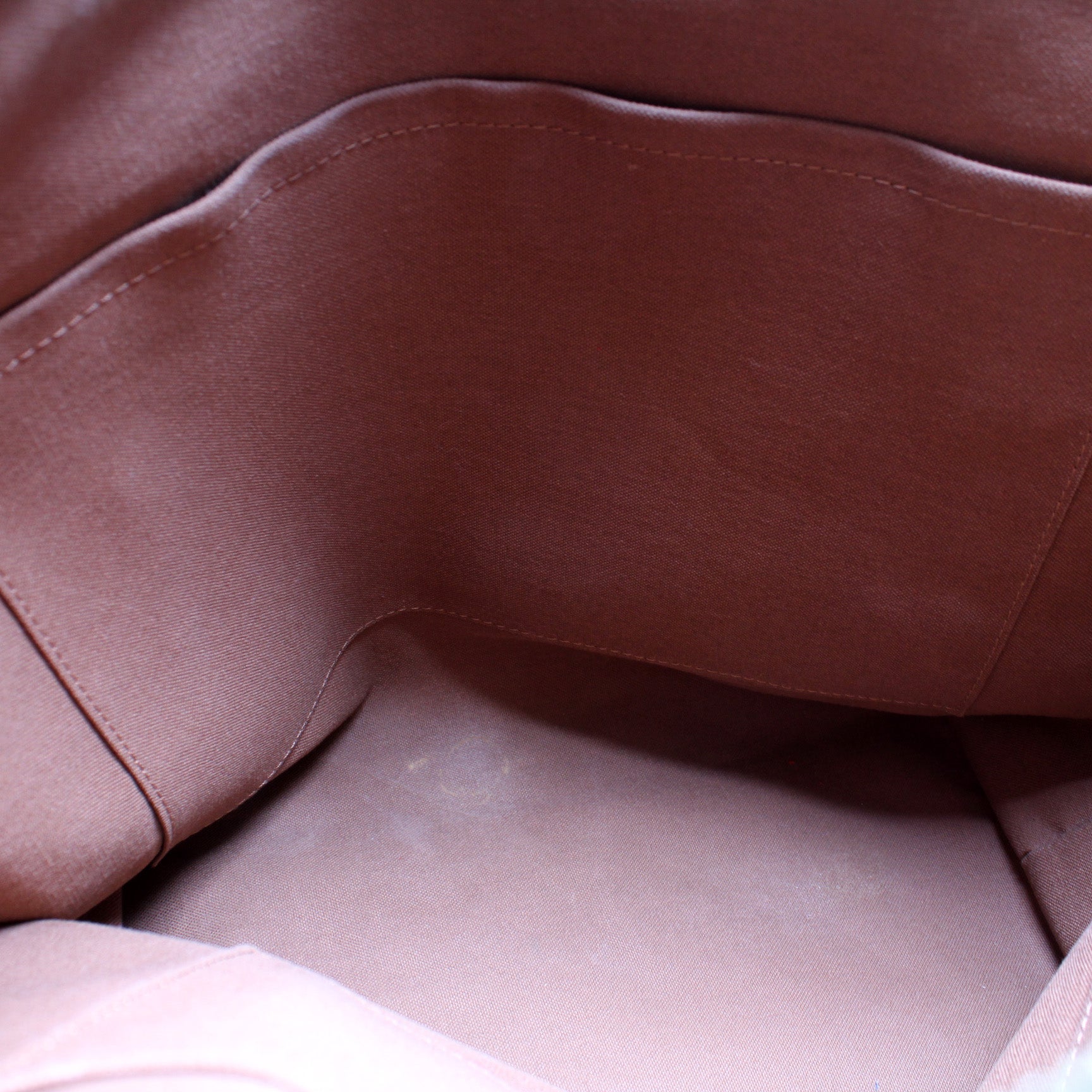 Exterior: The exterior coated canvas is free of any rips or cracks. The leather trim shows minor wear and discoloration. The pipping shows minor wear. The exterior features two open pockets.