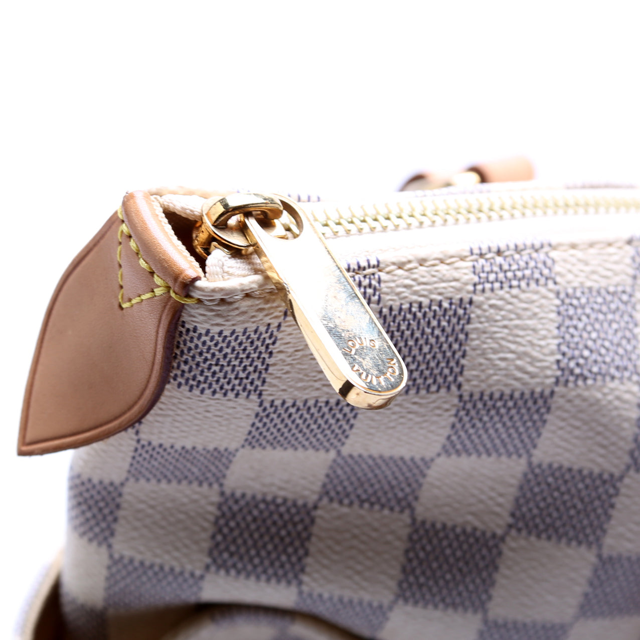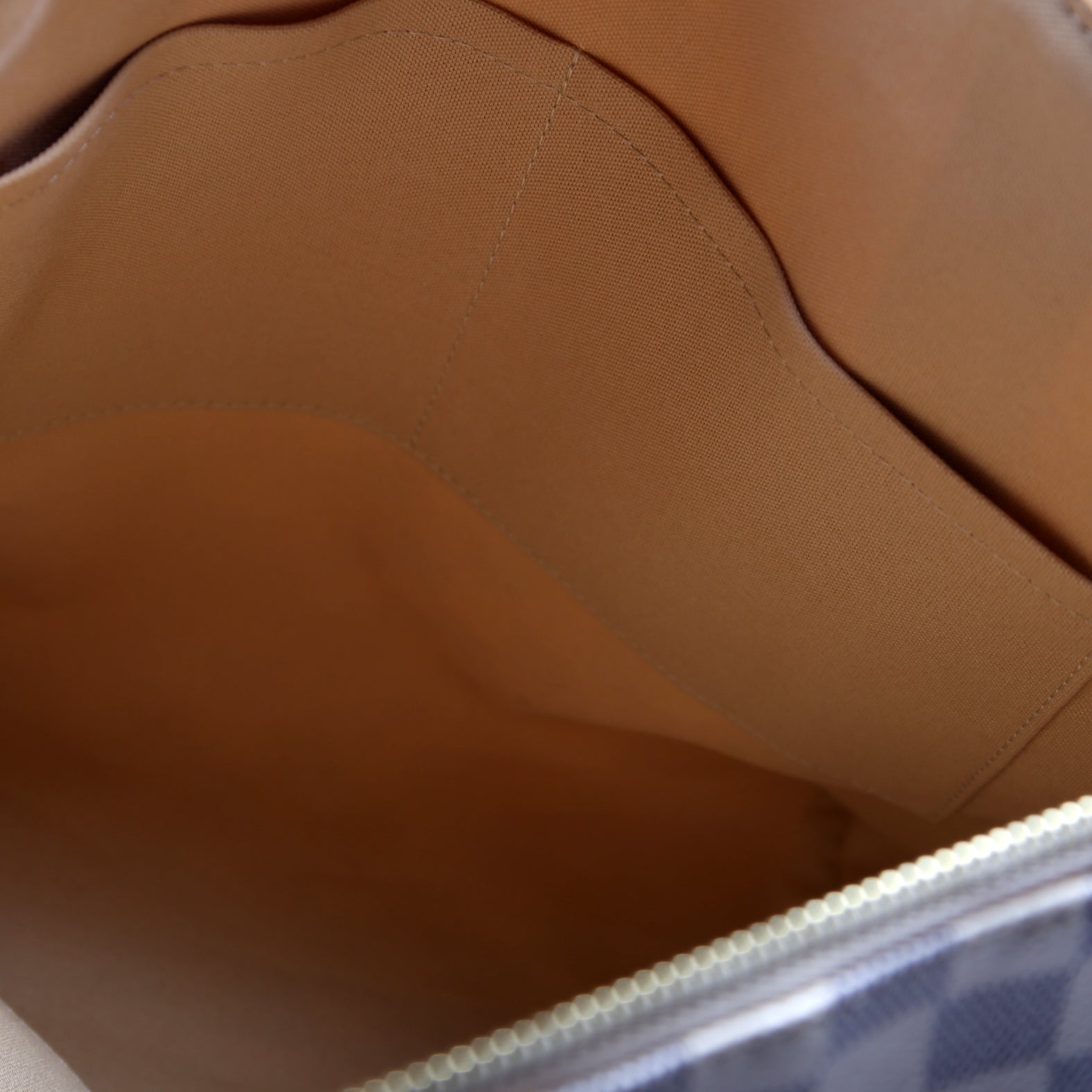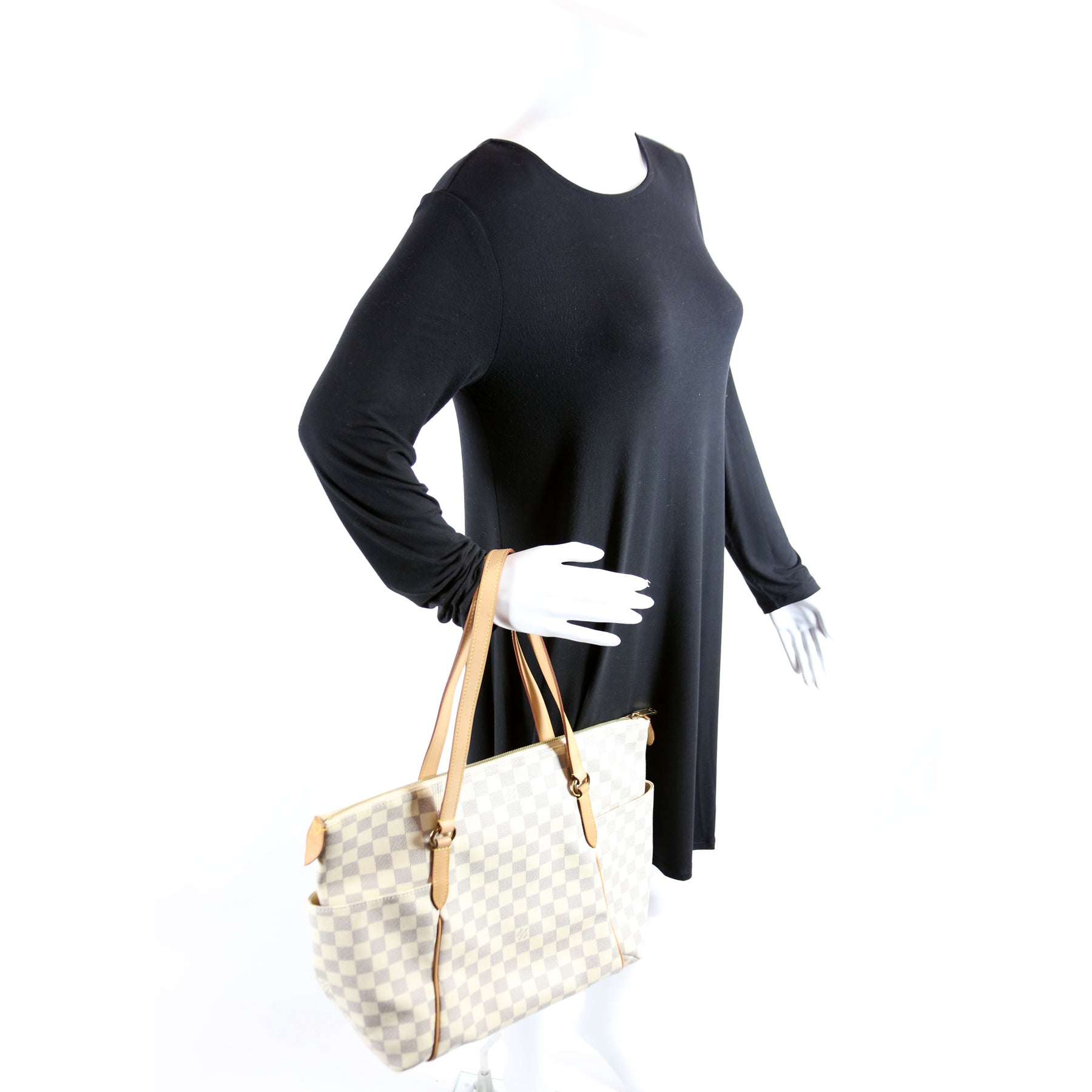 This pre-owned Louis Vuitton Totally MM is guaranteed 100% authentic. The exterior is in the classic Louis Vuitton Damier Azur coated canvas.